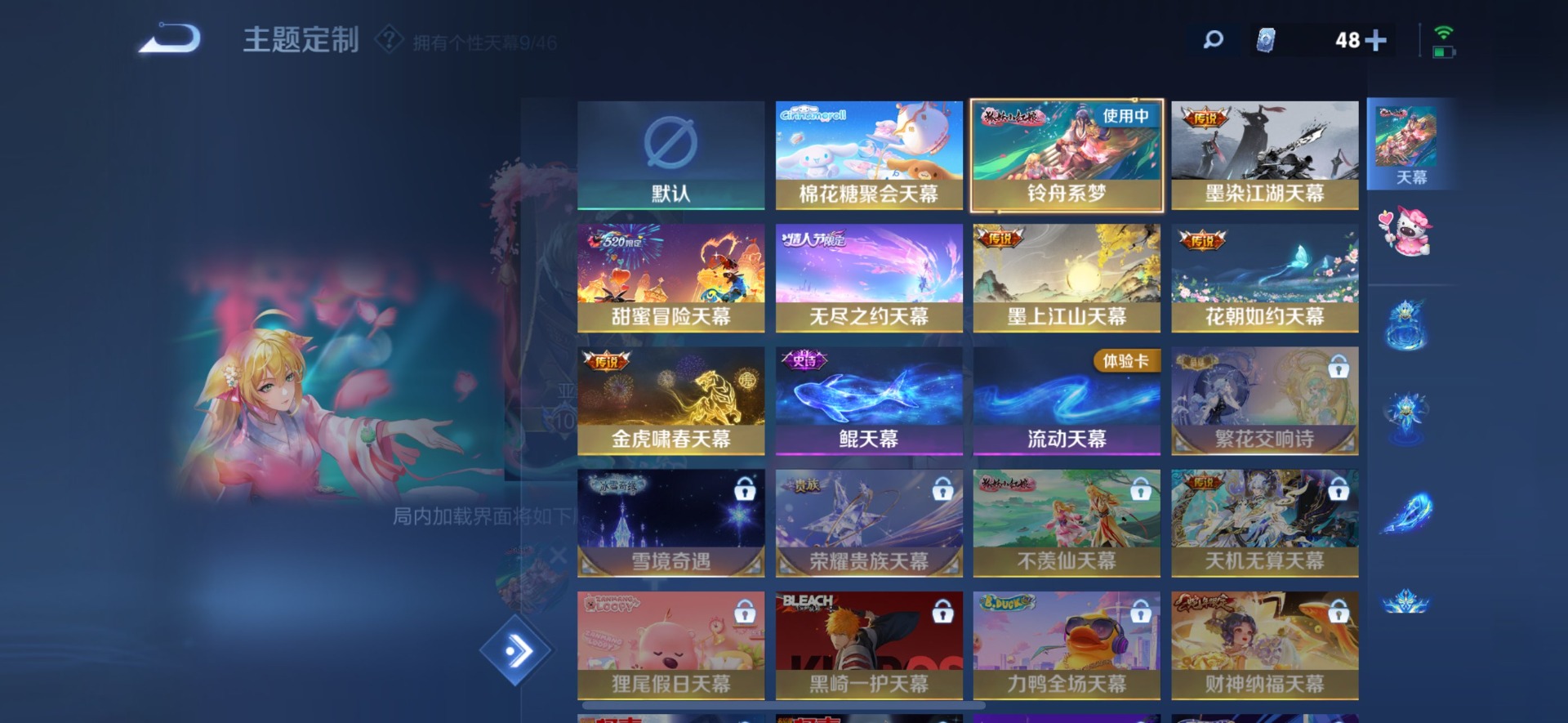 夏侯惇无限飓风号,小乔天鹅之梦,孙尚香杀手不太冷,诸葛亮星域神启,花木兰九霄神辉,芈月大秦宣太后,孙悟空全息碎影,虞姬神鉴启示录,貂蝉幻阙歌,铠银白咏叹调,鲁班七号星空梦想,李白鸣剑·曳影,程咬金活力突击,关羽赤影疾锋