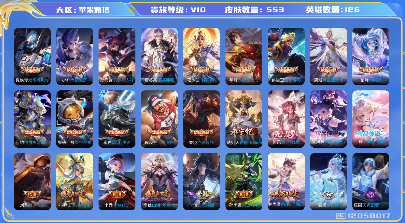 [12050017]V10 14典藏 2无双 2珍品传说 84传说 126英雄 553皮肤 典藏英雄武则天 可修改实名 安全保护中 优质装备:天鹅之梦(小乔典藏),星空梦想(太空人),无限飓风号(高达),活力突击,杀手不太冷,大秦宣太后,鸣剑·曳影,全息碎影(猴子典藏),星域神启(倪克斯贼亮),九霄神辉(木兰典藏),赤影疾锋,银白咏叹调(倪克斯侍卫),幻阙歌(貂蝉典藏),神器·明辉仪,青丘·九尾(妲己无双),神鉴启示录,酷洛米之心,大耳狗之梦,黄金狮子座,黄金射手座,冠军飞将,云鹰飞将(小将军),绛天战甲(鸡嘴战神),黄金白羊座,猫影幻舞,久胜战神,炽阳神光,一念神魔,云霓雀翎,末日机甲-孙尚香(绿蚂蚱),地狱火,仲夏夜之梦(大飞蛾),音你心动-小乔,零号·赤焰,海洋之心,地狱之眼,飞鸢探春,音你心动-周瑜,胖达荣荣,李逍遥,乞巧织情,时之恋人-刘备(电焊工),游龙清影(小青龙),淬星耀世,超时空战士-狄仁杰,末日机甲-孙策,花朝如约(花篮子),无双飞将,碎云,天秀幻梦,神器·狴犴令,神器·明辉仪,山海·炽霜斩(李信年限),山海·琳琅生(小乔年限),山海·苍雷引(电光曜子),炽翼辉光(娃娃菜牛角包),燃星之曲,画中仙,浮生妄,记忆之芯(机甲兔),青丘·九尾,百相守梦(张飞),追逃游戏(亚瑟),追逃游戏(安琪拉),电玩·雷克斯,鹤羽星尊,灼幽烈阳,鹤归松栖(云缨),惊梅引,霜月吟,澜逐花归海,艾琳觅芳踪 传说皮:乘龙·问璇玑(孙尚香年限),乘龙·铭钟鼎(赵云年限),乘龙·淬吴钩(孙策年限),典韦战鼓燎原,九山相柳,铠冥王哈迪斯,幻光神枪 珍宝阁皮:蔷薇恋人,玩趣恶龙 限定皮:逐霄战戟,夏侯惇霜北刀,至尊宝,凤求凰(白切鸡),凤凰于飞,武陵仙君(小桃花),异界灵契(白毛香),傲雪梅枪,补天,寅虎·展翼(孙膑年限),前尘镜,星穹之声,绯月行,时之彼端,魔法小厨娘,白晶晶,时雨天司(水龙头),神威(电光马子),玄嵩(庄周年限),山海·碧波行(瑶年限),无限倾心-项羽,瑞麟志(木兰年限),影龙天霄,遇见飞天,高山流水,诗剑行,无限倾心-虞姬,齐天大圣,怒海麟威,降魔,五谷丰年,青龙志(铠年限),冰锋战神,幽恒(沐浴露),武圣,御风骁将(吕布年限),天狼狩猎者,龙胆,逐梦之星,烈魂,岱宗(典韦年限),天狼溯光者,虎魄,奔雷神使(牛魔年限),天狼绘梦者,李小龙,逐梦之光,玄武志(苏烈年限)