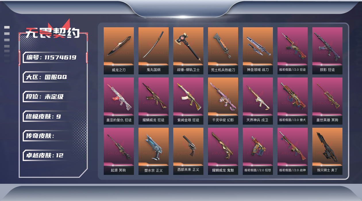 - [12042686]【套装】:2025全球冠军赛套装,2024全球冠军赛套装,2022全球冠军赛套装,VCTxEDG 队伍套装,般若假面//2.0套装,日冕雄师套装 【英雄】:幻棱,炼狱,维斯,暮蝶,钛狐,壹决,铁臂,捷风,雷兹,幽影,不死鸟,贤者,猎枭,蝰蛇,零,芮娜,奇乐,尚勃勒,霓虹,斯凯,夜露,星礈,K/O,海神,盖可,黑梦,钢锁 【近战 武器】:近战武器-2025全球冠军赛 蝴蝶刀,近战武器-2024全球冠军赛 战刀,近战武器-2022全球冠军赛 蝴蝶刀,近战武器-RGX 11z Pro//3.0 爪刀,近战武器-鬼丸国纲,近战武器-埃芒迪尔大剑,近战武器-流星兵团 短剑,近战武器-超能偶像 应援棒,近战武器-超限闪存 匕首,近战武器-荒土机兵 热能刀,近战武器-诡秘蛇影 军刀,近战武器-神圣领域 战刀 【狂徒】:狂徒-2025全球冠军赛,狂徒-洪荒怒焰,狂徒-全息波普//2.0,狂徒-塑水宗,狂徒-创·纪元,狂徒-RGX 11z Pro,狂徒-般若假面//2.0,狂徒-日冕雄师,狂徒-紫阙金琅,狂徒-超能偶像,狂徒-荒土机兵,狂徒-流星兵团,狂徒-诡秘蛇影 【幻影】:幻影-2022全球冠军赛,幻影-2024全球冠军赛,幻影-侦察力量,幻影-超限闪存,幻影-神圣领域,幻影-聚合之力,幻影-纳米打击,幻影-末日之翼 【戍卫】:戍卫-天界神兵,戍卫-超能偶像,戍卫-浮光跃金,戍卫-逆冲蛮牛,戍卫-战术熊与伙伴们,戍卫-月球哨兵,戍卫-折光棱晶 【獠犬】:獠犬-般若假面//2.0,獠犬-日冕雄师,獠犬-神圣领域,獠犬-采蜜小蜂队,獠犬-模拟赫兹,獠犬-逆冲蛮牛 【冥驹】:冥驹-全息波普//2.0,冥驹-荒土机兵,冥驹-模拟赫兹,冥驹-星云暗涌 【飞将】:飞将-天界神兵,飞将-聚合之力,飞将-战术熊与伙伴们,飞将-末日之翼 【莽侠】:莽侠-超限闪存,莽侠-诡秘蛇影,莽侠-纤云弄巧,莽侠-月球哨兵 【战神】:战神-般若假面//2.0,战神-神圣领域,战神-采蜜小蜂队,战神-浮光跃金 【奥丁】:奥丁-流星兵团,奥丁-纳米打击,奥丁-末日之翼 【判官】:判官-超能偶像,判官-诡秘蛇影,判官-采蜜小蜂队,判官-纳米打击x 【雄鹿】:雄鹿-日冕雄师,雄鹿-模拟赫兹,雄鹿-逆冲蛮牛,雄鹿-月球哨兵 【骇灵】:骇灵-荒土机兵,骇灵-流星兵团,骇灵-浮光跃金,骇灵-星云暗涌 【蜂刺】:蜂刺-超限闪