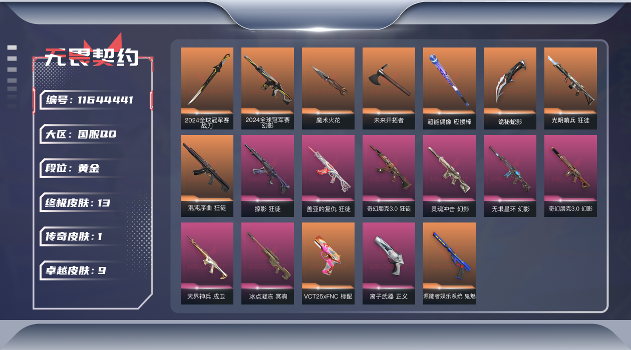 [11644441]【套装】:2025全球冠军赛套装,2024全球冠军赛套装 【英雄】:幻棱,炼狱,维斯,暮蝶,钛狐,壹决,铁臂,捷风,雷兹,幽影,不死鸟,贤者,猎枭,蝰蛇,零,芮娜,奇乐,尚勃勒,霓虹,斯凯,夜露,星礈,K/O,海神,盖可,黑梦,钢锁 【近战 武器】:近战武器-2025全球冠军赛 蝴蝶刀,近战武器-2024全球冠军赛 战刀,近战武器-魔术火花,近战武器-未来开拓者,近战武器-超能偶像 应援棒,近战武器-诡秘蛇影 军刀,近战武器-魔术火花 【狂徒】:狂徒-2025全球冠军赛,狂徒-光明哨兵,狂徒-混沌序曲,狂徒-掠影,狂徒-盖亚的复仇,狂徒-奇幻朋克//3.0,狂徒-超能偶像,狂徒-漫天彩霞,狂徒-诡秘蛇影 【幻影】:幻影-2024全球冠军赛,幻影-灵魂冲击,幻影-无垠星环,幻影-奇幻朋克//3.0,幻影-聚合之力,幻影-末日之翼 【戍卫】:戍卫-天界神兵,戍卫-超能偶像,戍卫-折光棱晶 【獠犬】:獠犬-采蜜小蜂队 【冥驹】:冥驹-冰点凝冻 【飞将】:飞将-聚合之力,飞将-末日之翼 【莽侠】:莽侠-诡秘蛇影 【战神】:战神-采蜜小蜂队 【奥丁】:奥丁-末日之翼 【判官】:判官-超能偶像,判官-诡秘蛇影,判官-采蜜小蜂队 【蜂刺】:蜂刺-聚合之力,蜂刺-折光棱晶 【标配】:标配-超能偶像,标配-折光棱晶 【VCT手枪】:标配-VCT25 x FNC 【正义】:正义-离子武器,正义-超限闪存 【鬼魅】:鬼魅-源能者娱乐系统,鬼魅-诡秘蛇影,鬼魅-采蜜小蜂队,鬼魅-数码咒术,鬼魅-星云暗涌 【狂怒】:狂怒-聚合之力 【短炮】:短炮-末日之翼 【卡面】:《双城之战》拥抱 卡面,精灵大战 卡面,欢迎来到底城 卡面,南瓜盛典 卡面,修车达人 卡面,正义的化身 卡面,终章:生意人麦宝 卡面,铁之华 卡面,2024全球冠军赛 卡面,失而复得 卡面,时间到 卡面,最高舞台 卡面,复活专家 卡面,归乡 // 蝰蛇 卡面,超能偶像 卡面,生意人麦宝 卡面,声感陷阱设计图 卡面,钢锁工牌 卡面,战术小伙伴的夏日 卡面,采蜜小蜂队 卡面,聚合之力 卡面,梦幻奶茶 卡面,源能反应 卡面,零点嗅探设计图 卡面,清除名单 卡面,无畏契约GO!第一卷:零 卡面,龍记 卡面,势不可挡//盖可 卡面,完美调谐 卡面 ,暗枪 卡面,夯实根基 卡面,"Luie" 卡面,热烈欢迎 卡面,铁臂设计图 卡面,代号红