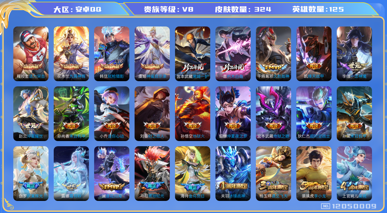 [12050009]【商品标题】:安卓Q-V8-至尊星耀IV段位-125英雄-324皮肤-4典藏-0珍品无双-0无双-2珍品传说-27传说-76史诗