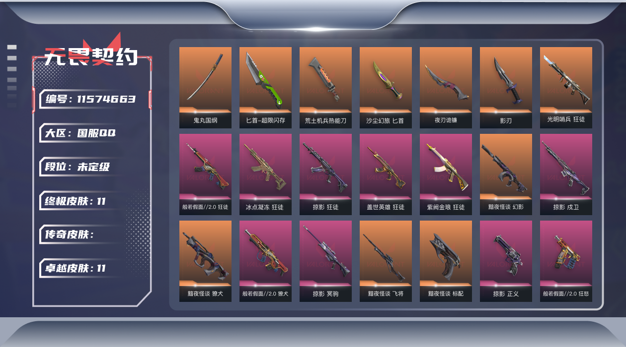 [11574663]【套装】:黯夜怪谈套装,般若假面//2.0套装,掠影套装 【英雄】:炼狱,维斯,暮蝶,壹决,铁臂,捷风,雷兹,幽影,不死鸟,贤者,猎枭,蝰蛇,零,芮娜,奇乐,尚勃勒,霓虹,斯凯,夜露,星礈,K/O,海神,盖可,黑梦,钢锁 【近战 武器】:近战武器-鬼丸国纲,近战武器-超限闪存 匕首,近战武器-荒土机兵 热能刀,近战武器-沙尘幻旅 匕首,近战武器-夜刃诡镰,近战武器-影刃 【狂徒】:狂徒-光明哨兵,狂徒-般若假面//2.0,狂徒-冰点凝冻,狂徒-掠影,狂徒-盖世英雄,狂徒-紫阙金琅,狂徒-荒土机兵,狂徒-沙尘幻旅 【幻影】:幻影-黯夜怪谈,幻影-超限闪存,幻影-纳米打击 【戍卫】:戍卫-掠影,戍卫-浮光跃金,戍卫-萌彩剪影,戍卫-逆冲蛮牛 【獠犬】:獠犬-黯夜怪谈,獠犬-般若假面//2.0,獠犬-胡桃狂想,獠犬-模拟赫兹,獠犬-逆冲蛮牛 【冥驹】:冥驹-掠影,冥驹-荒土机兵,冥驹-胡桃狂想,冥驹-模拟赫兹 【飞将】:飞将-黯夜怪谈,飞将-沙尘幻旅 【莽侠】:莽侠-超限闪存 【战神】:战神-般若假面//2.0,战神-浮光跃金,战神-萌彩剪影 【奥丁】:奥丁-纳米打击 【判官】:判官-萌彩剪影,判官-纳米打击x 【雄鹿】:雄鹿-模拟赫兹,雄鹿-逆冲蛮牛 【骇灵】:骇灵-荒土机兵,骇灵-沙尘幻旅,骇灵-浮光跃金 【蜂刺】:蜂刺-超限闪存,蜂刺-胡桃狂想 【标配】:标配-黯夜怪谈,标配-超能偶像,标配-荒土机兵,标配-浮光跃金 【正义】:正义-掠影,正义-超限闪存,正义-沙尘幻旅,正义-纳米打击 【鬼魅】:鬼魅-胡桃狂想,鬼魅-模拟赫兹 【狂怒】:狂怒-般若假面//2.0,狂怒-萌彩剪影,狂怒-逆冲蛮牛 【短炮】:短炮-弧光异彩 【卡面】:终章:激斗汉堡 卡面,进入射程 卡面,分崩离析 卡面,纳米打击 卡面,抑制技术 卡面,激斗汉堡 卡面,瓦娃脸雪糕 P2 卡面,从黄昏到黎明 卡面,荒土机兵 卡面,银弹猎手 卡面,逆冲蛮牛 卡面,《双城之战》拥抱 卡面,精灵大战 卡面,欢迎来到底城 卡面,南瓜盛典 卡面,VCT CN首冠 卡面,唱片的故事 卡面,钢弓与箭弦 卡面,排除故障 卡面,战术桌游 卡面,悠享食光 卡面,修车达人 卡面,热舞环节 卡面,模拟赫兹 卡面,浮光跃金 卡面,超限闪存 卡面,维斯工牌 卡面,正义的化身 卡面,终章:生意人麦宝 卡面,铁之华 卡面,时间到 卡面,
