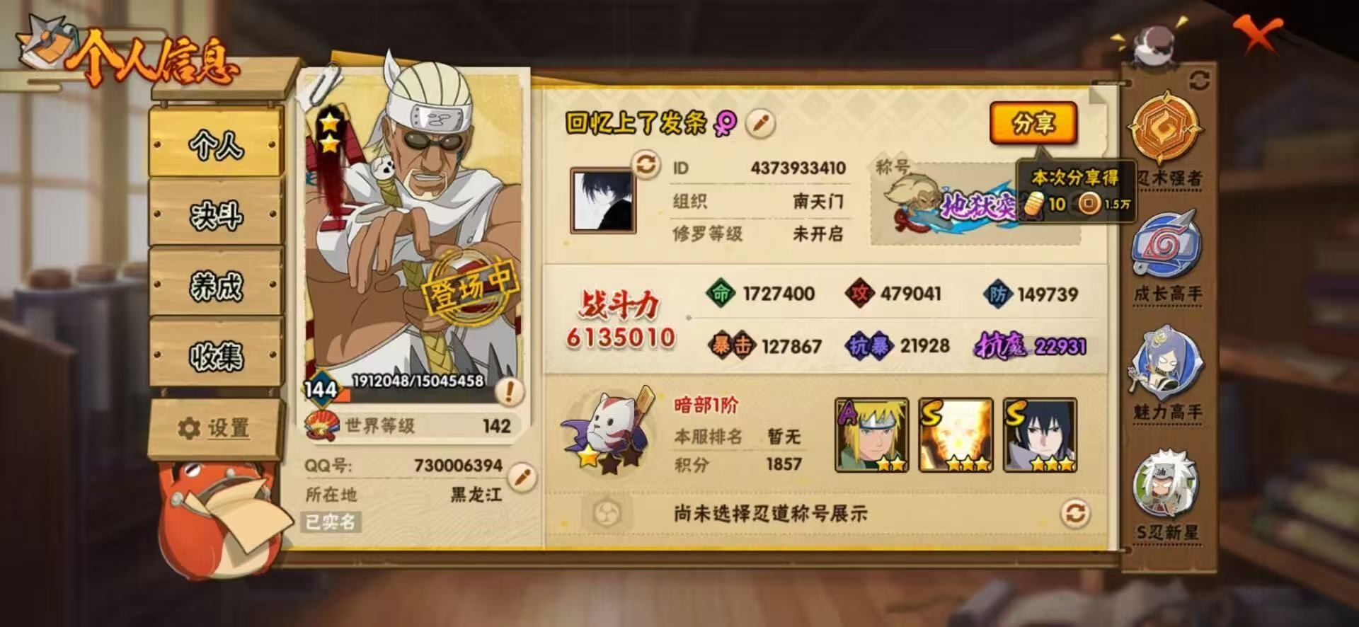 [12050109]V5 8S忍 20A忍 14通灵 613.5W战力 可二次 可修改实名 优质装备:漩涡鸣人 「九喇嘛连结」,宇智波佐助「永恒万花筒」,宇智波斑「秽土转生·解」 S级忍者:自来也 「舞之豪杰」,宇智波鼬 「须佐能乎」,佩恩「天道」,波风水门,大蛇丸