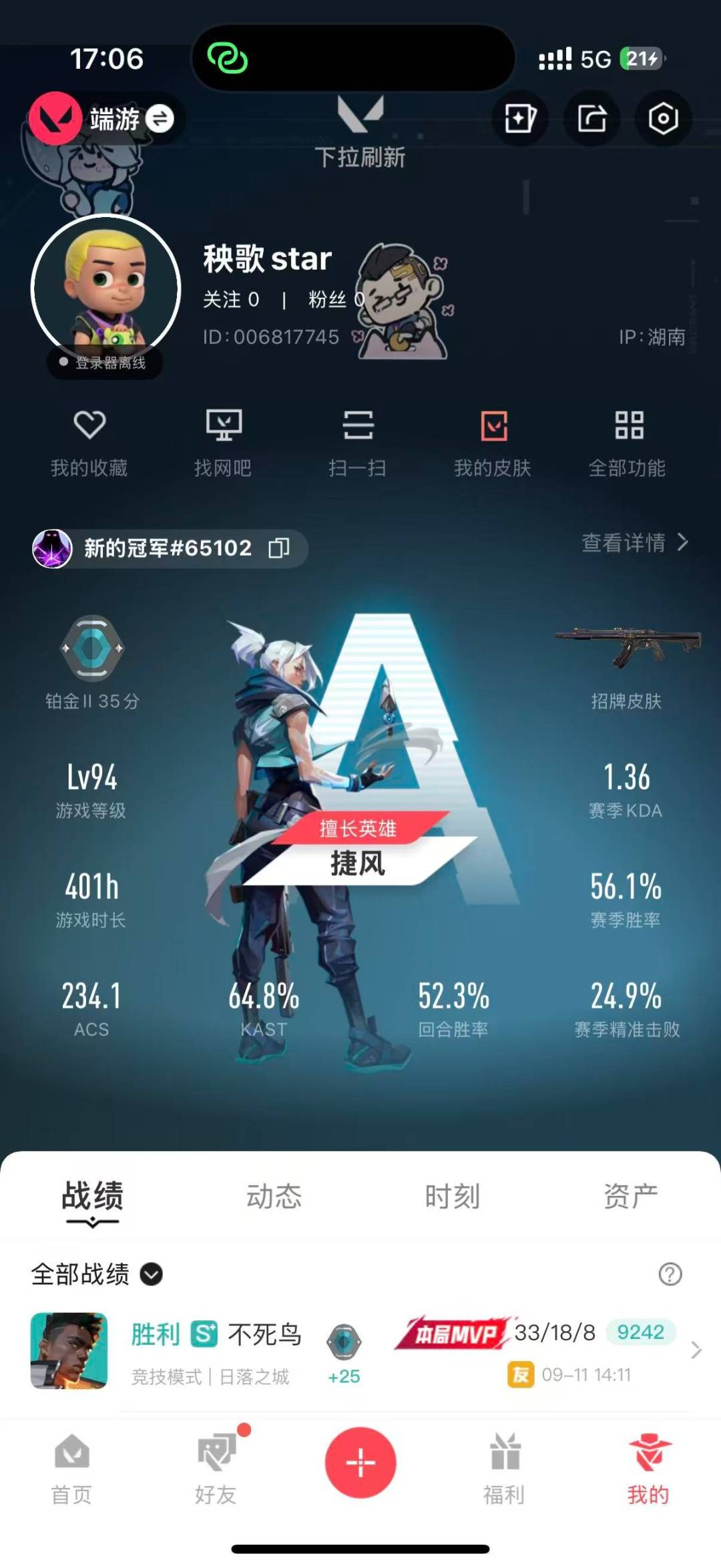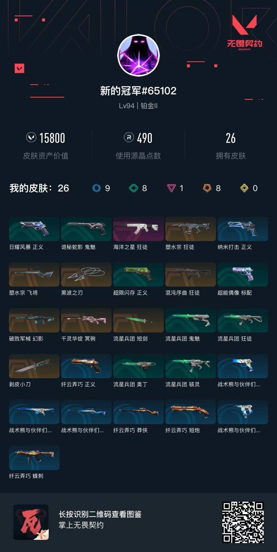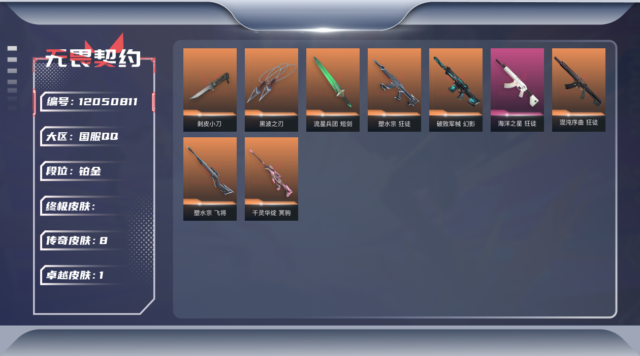 [12050811]8橙皮 1紫皮 26皮肤 25英雄 65卡面 490已用源晶 铂金 优质装备:狂徒-塑水宗,冥驹-千灵华绽,狂徒-混沌序曲,幻影-破败军械,剥皮小刀,黑波之刃,飞将-塑水宗 步枪皮肤:狂徒-海洋之星 近战武器皮肤:短剑-流星兵团