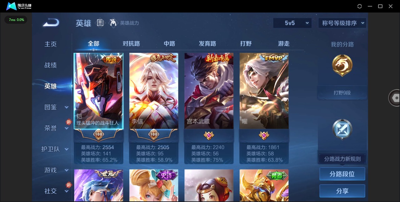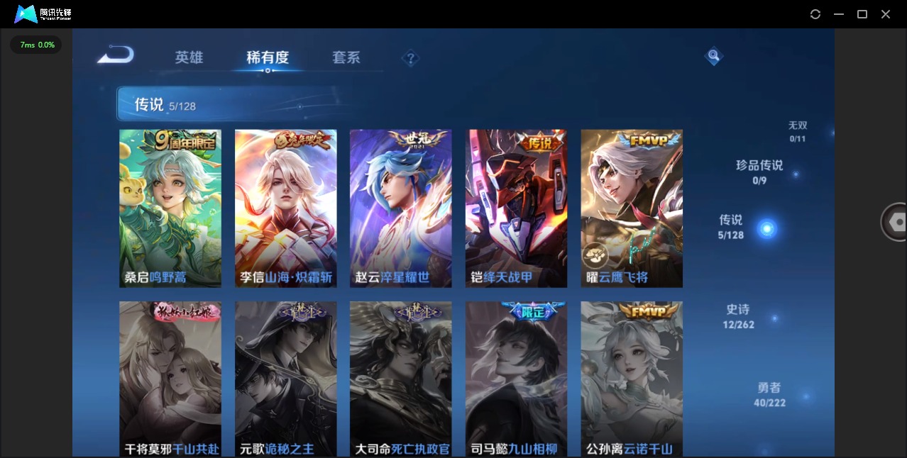 [12050054]V7 5传说 111英雄 76皮肤 可修改实名 优质装备:云鹰飞将(小将军),绛天战甲(鸡嘴战神),淬星耀世,山海·炽霜斩(李信年限) 限定皮:鸣野蒿,五谷丰年 史诗皮:织梦人,特工魅影,江河有灵,偶像歌手,水果甜心,乘风破浪,曙光守护者,赏金猎手