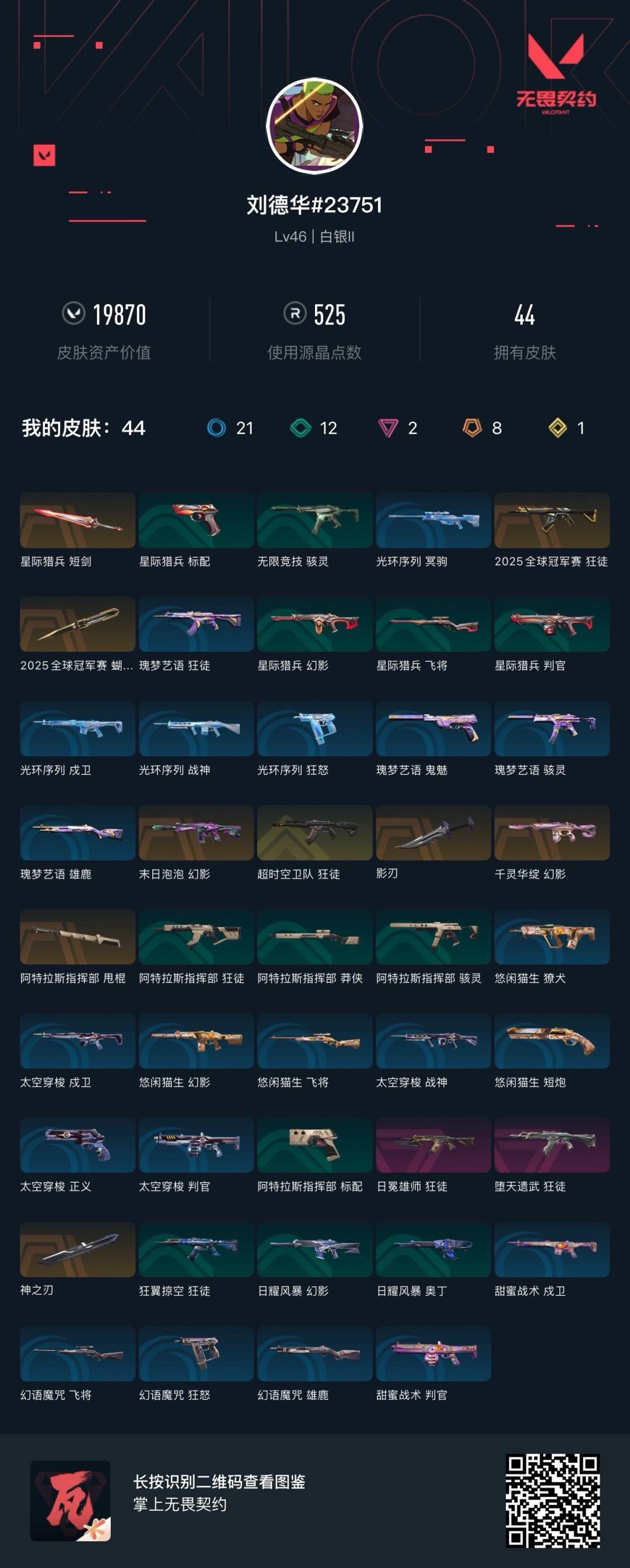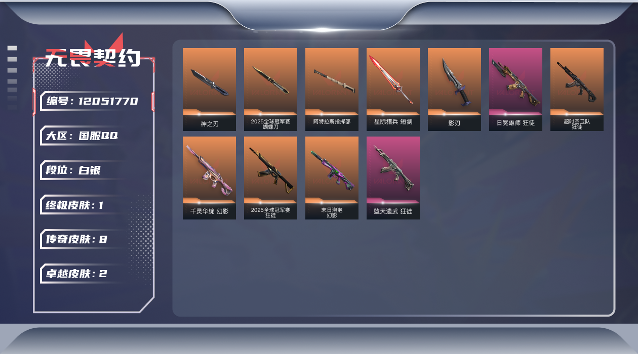 [12051770]8橙皮 1金皮 2紫皮 44皮肤 15英雄 59卡面 525已用源晶 白银 优质装备:2025全球冠军赛 蝴蝶刀,幻影-千灵华绽,狂徒-日冕雄师,影刃,神之刃,阿特拉斯指挥部,幻影-末日泡泡,星际猎兵 短剑,2025全球冠军赛 狂徒 步枪皮肤:狂徒-超时空卫队,狂徒-堕天遗武