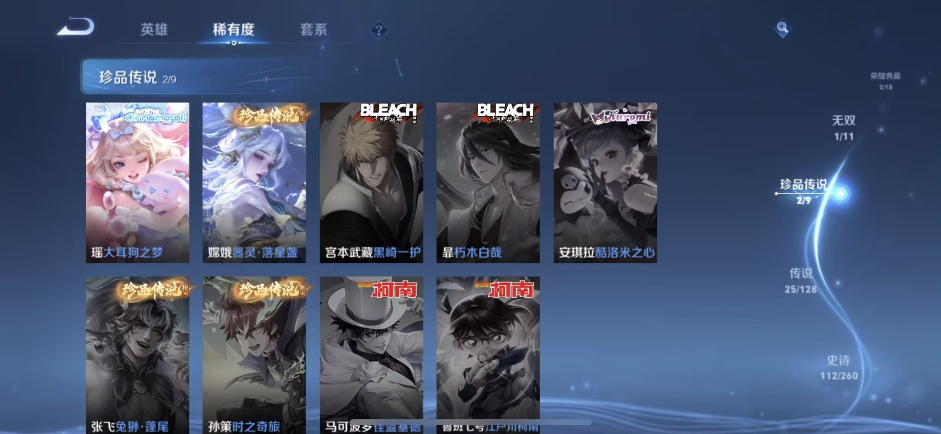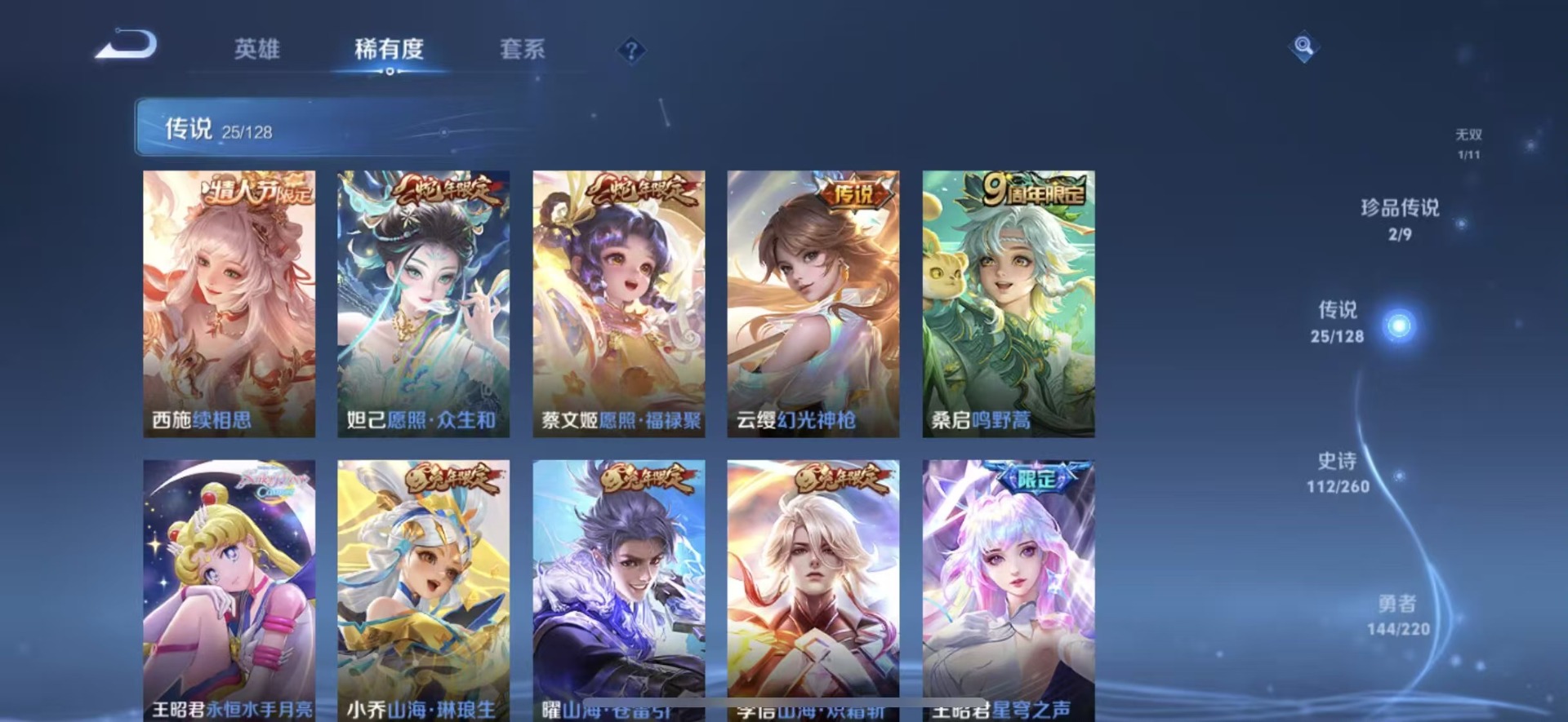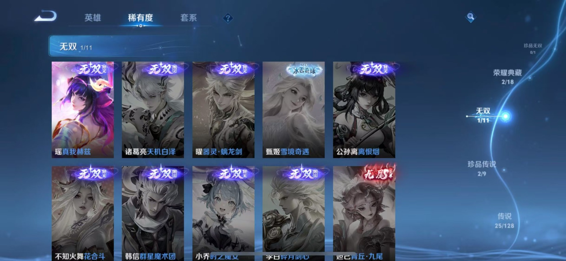 大乔白蛇,大乔猫狗日记,高渐离天秀·音浪,刘邦德古拉伯爵,夏侯惇乘风破浪,阿轲暗夜猫娘,阿轲节奏热浪,铠曙光守护者,曹操幽灵船长,伽罗箭羽风息,廉颇地狱岩魂,小乔缤纷独角兽,小乔青蛇,孙策猫狗日记,不知火舞魅语,赵怀真器灵·浮梦炉,吕布圣诞狂欢,吕布末日机甲,露娜紫霞仙子,司马懿暗渊魔法,刘禅天才门将,刘禅绅士熊喵,宫本武藏鬼剑武藏,兰陵王暗隐猎兽者,花木兰水晶猎龙者,李白千年之狐,夏洛特永昼,安琪拉心灵骇客,安琪拉时之奇旅,艾琳奇遇舞章,杨戬天秀·启明,白起星夜王子,西施诗语江南,嬴政摇滚巨星,嬴政暗夜贵公子,程咬金功夫厨神,百里玄策原初追逐者,雅典娜冰冠公主,雅典娜黎明之约,百里守约特工魅影,李元芳逐浪之夏,墨子金属风暴,蔡文姬舞动绿茵,瑶遇见神鹿,弈星滕王阁序,娜可露露晚萤,王昭君偶像歌手,嫦娥拒霜思,橘右京修罗