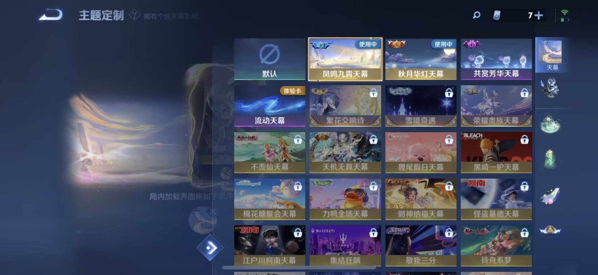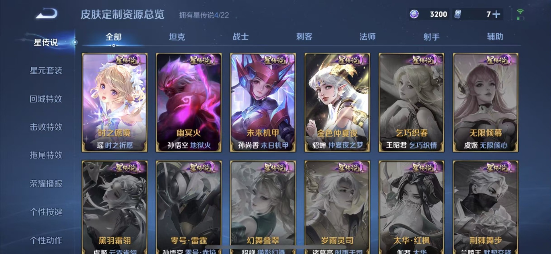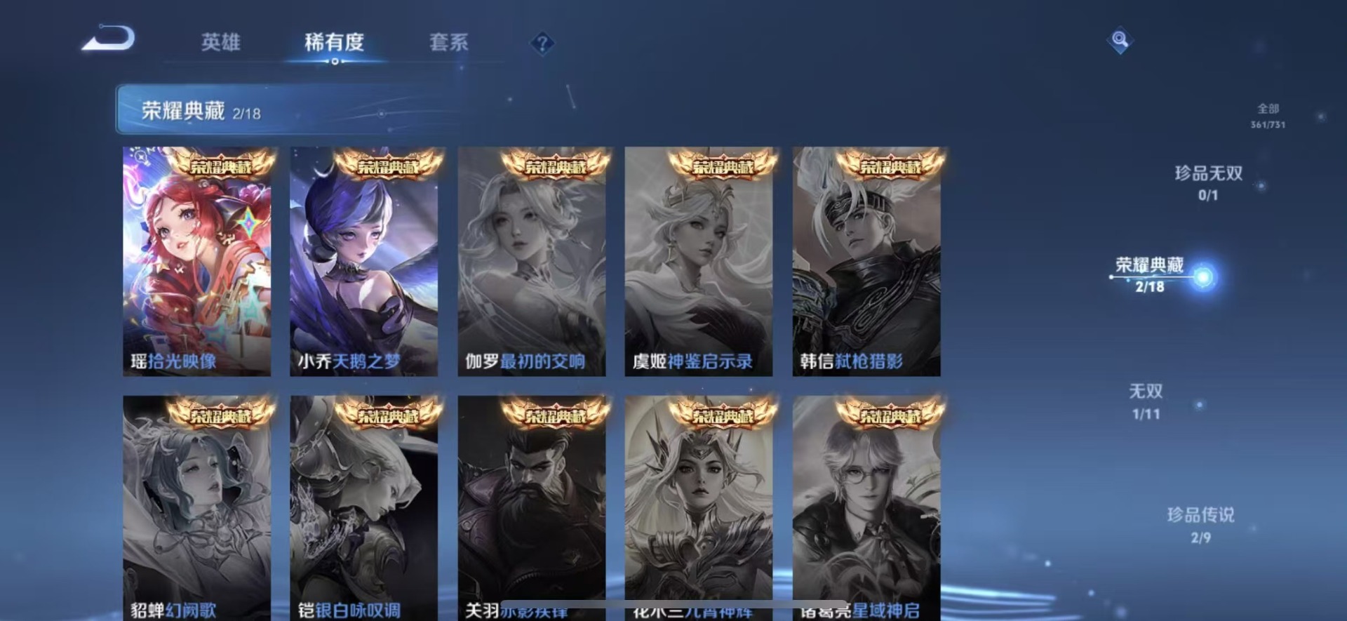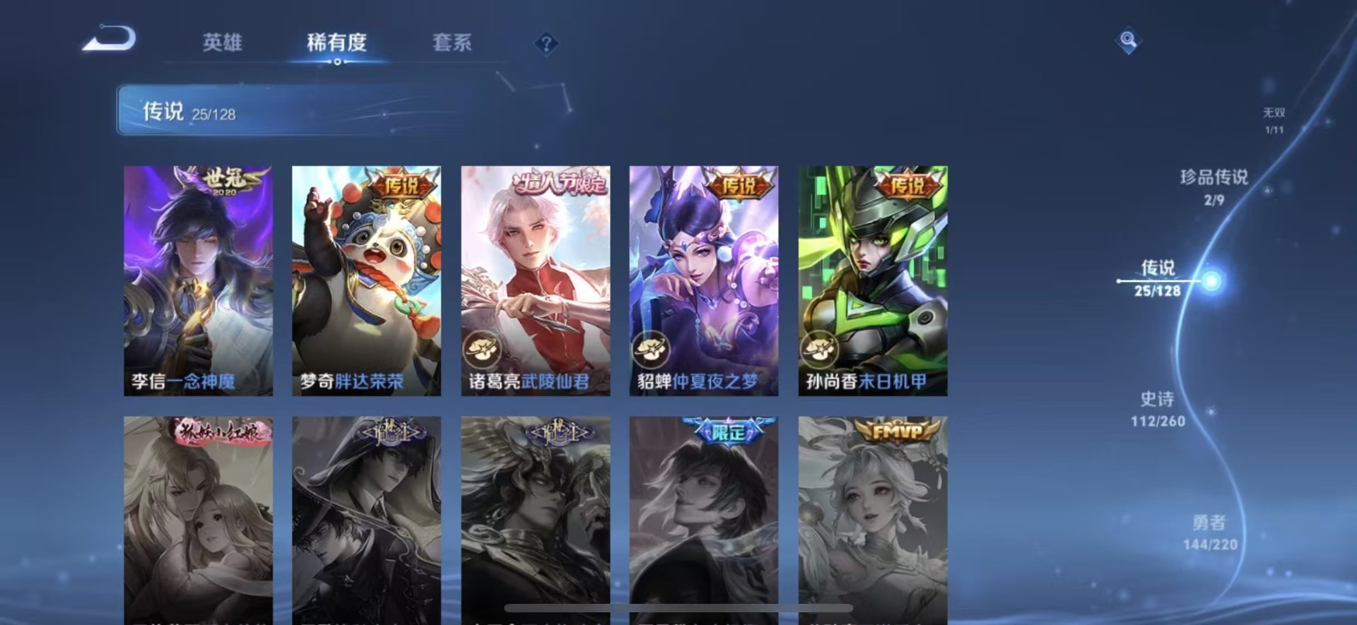 大乔白蛇,大乔猫狗日记,高渐离天秀·音浪,刘邦德古拉伯爵,夏侯惇乘风破浪,阿轲暗夜猫娘,阿轲节奏热浪,铠曙光守护者,曹操幽灵船长,伽罗箭羽风息,廉颇地狱岩魂,小乔缤纷独角兽,小乔青蛇,孙策猫狗日记,不知火舞魅语,赵怀真器灵·浮梦炉,吕布圣诞狂欢,吕布末日机甲,露娜紫霞仙子,司马懿暗渊魔法,刘禅天才门将,刘禅绅士熊喵,宫本武藏鬼剑武藏,兰陵王暗隐猎兽者,花木兰水晶猎龙者,李白千年之狐,夏洛特永昼,安琪拉心灵骇客,安琪拉时之奇旅,艾琳奇遇舞章,杨戬天秀·启明,白起星夜王子,西施诗语江南,嬴政摇滚巨星,嬴政暗夜贵公子,程咬金功夫厨神,百里玄策原初追逐者,雅典娜冰冠公主,雅典娜黎明之约,百里守约特工魅影,李元芳逐浪之夏,墨子金属风暴,蔡文姬舞动绿茵,瑶遇见神鹿,弈星滕王阁序,娜可露露晚萤,王昭君偶像歌手,嫦娥拒霜思,橘右京修罗