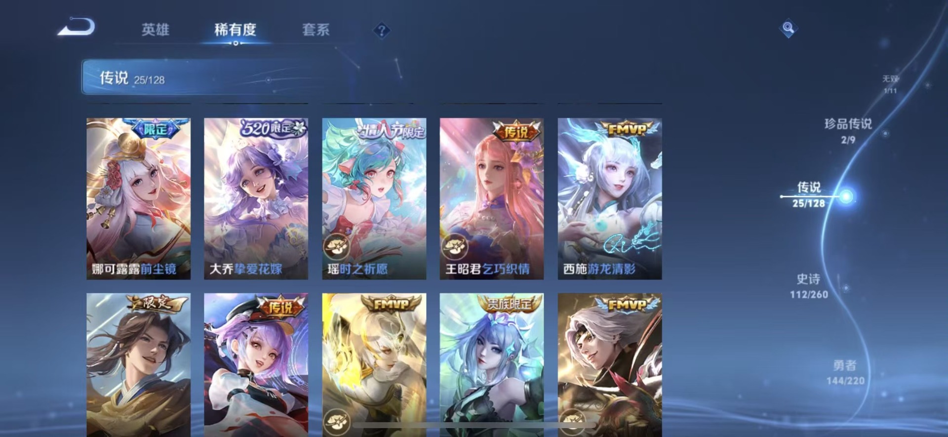 大乔白鹤梁神女,廉颇寅虎·御盾,孙膑天狼运算者,孙膑寅虎·展翼,小乔纯白花嫁,牛魔奔雷神使,杨玉环寅虎·心曲,公孙离蜜橘之夏,裴擒虎李小龙,裴擒虎天狼狩猎者,上官婉儿梁祝,上官婉儿天狼绘梦者,花木兰青春决赛季,马可波罗山海·玄木吟,西施至美·乘鲤谣,桑启鸣野蒿,马超神威,妲己时之奇旅,妲己愿照·众生和,蔡文姬奇迹圣诞,蔡文姬愿照·福禄聚,瑶时之祈愿,瑶山海·碧波行,娜可露露前尘镜,嫦娥如梦令,王昭君凤凰于飞,王昭君星穹之声