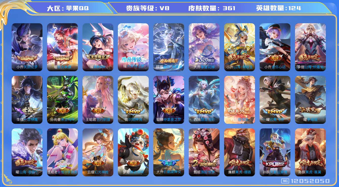 [12052050]V8 2典藏 1无双 2珍品传说 25传说 124英雄 361皮肤 可修改实名 优质装备:天鹅之梦(小乔典藏),真我赫兹(瑶)(瑶无双),拾光映像(瑶典藏),器灵·落星盏,大耳狗之梦,云鹰飞将(小将军),炽阳神光,一念神魔,末日机甲-孙尚香(绿蚂蚱),仲夏夜之梦(大飞蛾),音你心动-小乔,胖达荣荣,李逍遥,乞巧织情,游龙清影(小青龙),挚爱花嫁,山海·炽霜斩(李信年限),山海·琳琅生(小乔年限),山海·苍雷引(电光曜子),永恒水手月亮,涂山容容 传说皮:续相思,幻光神枪 珍宝阁皮:万物之道,优雅恋人,蔷薇恋人,女武神 限定皮:愿照·福禄聚(蔡文姬年限),愿照·众生和(妲己年限),逐霄战戟,鸣野蒿,凤凰于飞,武陵仙君(小桃花),寅虎·展翼(孙膑年限),前尘镜,星穹之声,白鹤梁神女,神威(电光马子),山海·碧波行(瑶年限),至美·乘鲤谣,高山流水,五谷丰年,天狼运算者,游园惊梦,梁祝,天狼狩猎者,奔雷神使(牛魔年限),天狼绘梦者,李小龙,如梦令-嫦娥,奇迹圣诞,纯白花嫁,青春决赛季,蜜橘之夏,寅虎·御盾(廉颇年限),寅虎·心曲(虎婆),时之祈愿-瑶(瑶传限),时之奇旅-妲己,山海·玄木吟(马可年限) 史诗皮:器灵·浮梦炉,化蝶舞,龙之律动,星界战将,石田雨龙,百相守梦-周瑜,茶境仙,百相守梦-黄忠,蔬乡物语(鲁班七号),幻珠鲛人,百相守梦-百里守约,织梦人,遇见神鹿,紫霞仙子,特工魅影,千年之狐,永昼,冰冠公主,白蛇,江河有灵,青蛇,蒙恬荣光圣徽,魅语,晚萤,偶像歌手,暗夜猫娘,末日机甲-吕布,猫狗日记-孙策,猫狗日记-大乔,乱世虎臣,节奏热浪,修罗,女仆咖啡,摇滚巨星,水果甜心,绅士熊喵,天才门将,星夜王子,心灵骇客,时之奇旅-安琪拉,功夫厨神,德古拉伯爵,暗隐猎兽者,幽灵船长,鬼剑武藏,暗渊魔法,天秀·启明,舞动绿茵,地狱岩魂,诗语江南,拒霜思,缤纷独角兽,乘风破浪,逐浪之夏,水晶猎龙者,曙光守护者,箭羽风息,金属风暴,原初追逐者,圣诞狂欢,鹰眼统帅,暗夜贵公子,魅力维加斯,黎明之约,奇遇舞章,天秀·音浪,滕王阁序,寅虎·御盾,无心,未来纪元-赵云