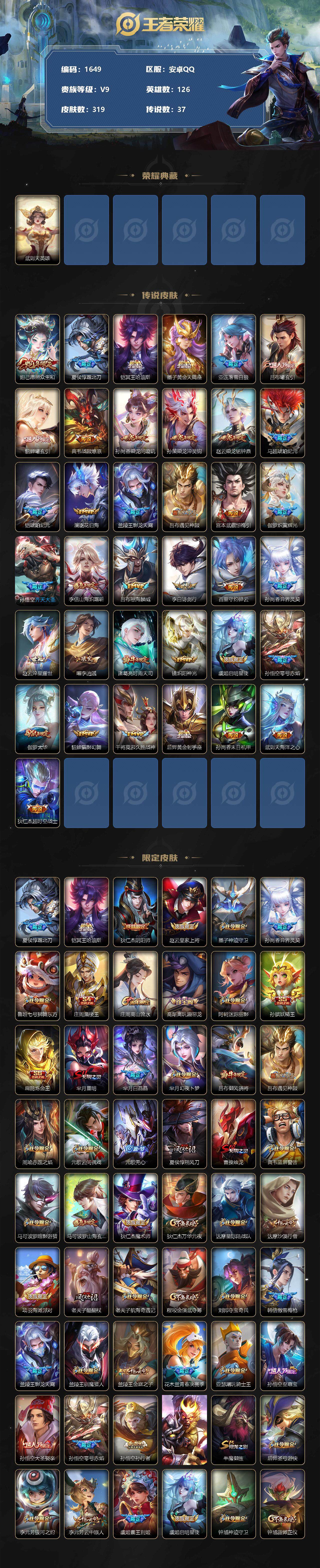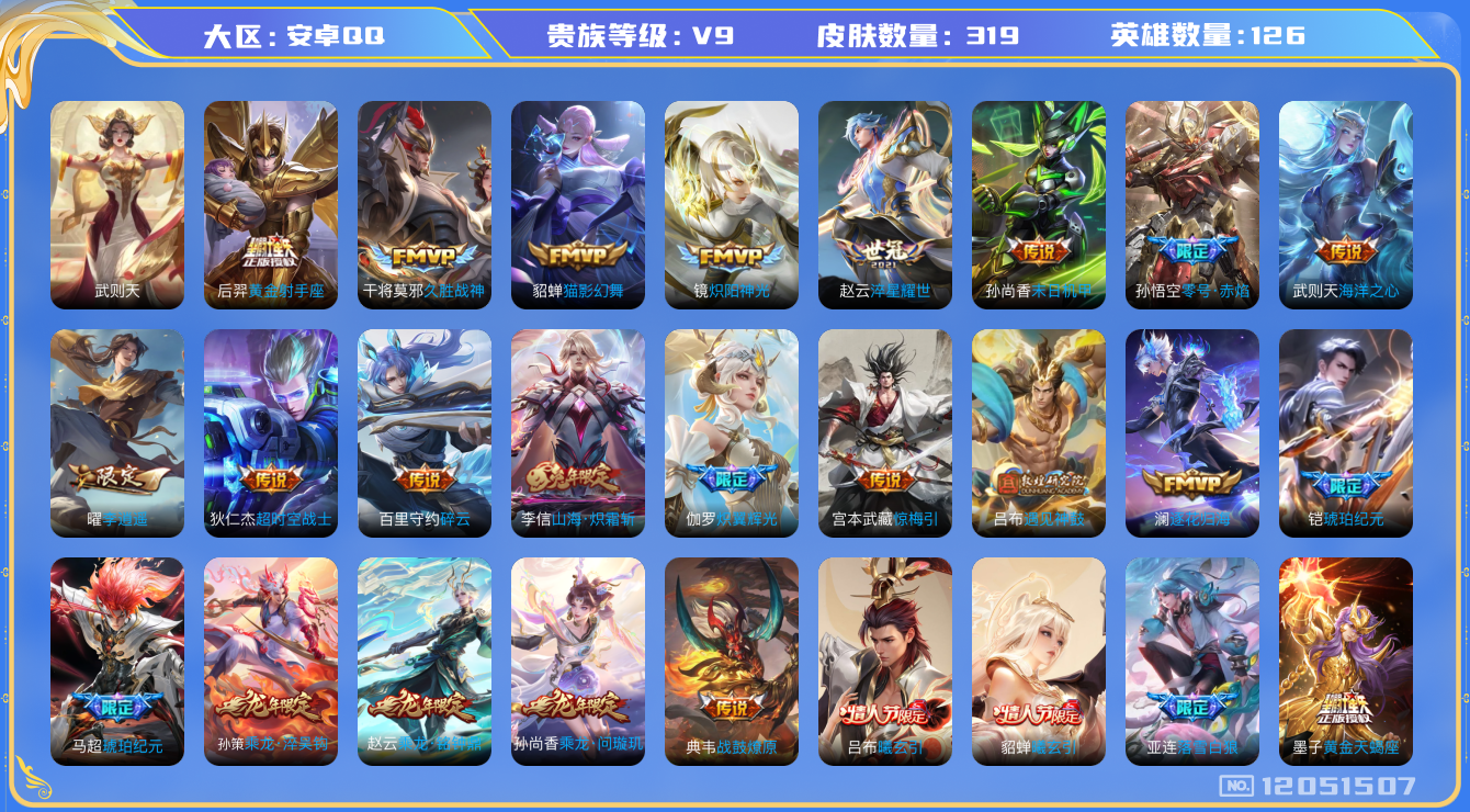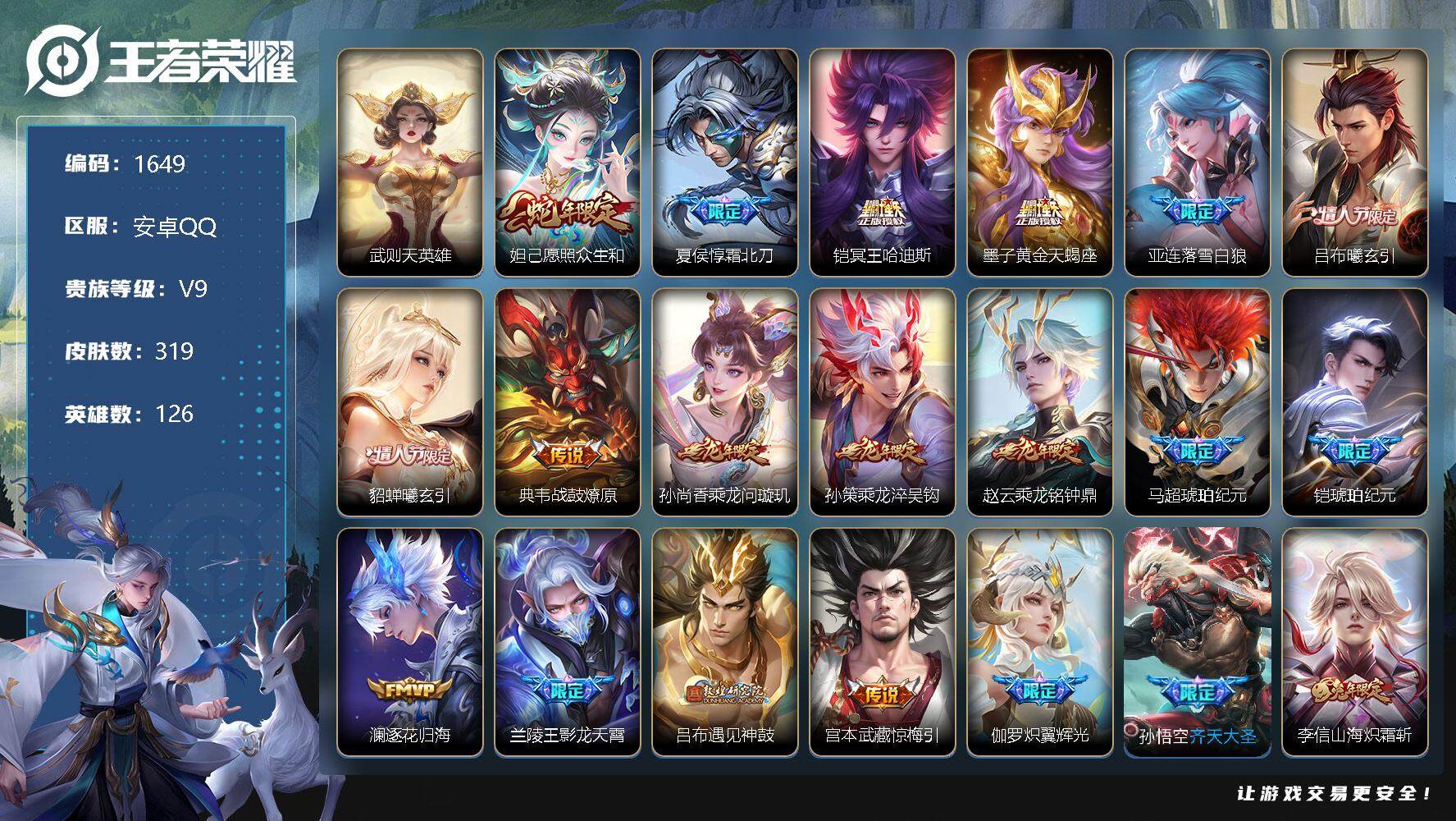[12051507]【商品标题】:安卓Q-V9-最强王者段位-126英雄-319皮肤-0典藏-0珍品无双-0无双-0珍品传说-37传说-100史诗