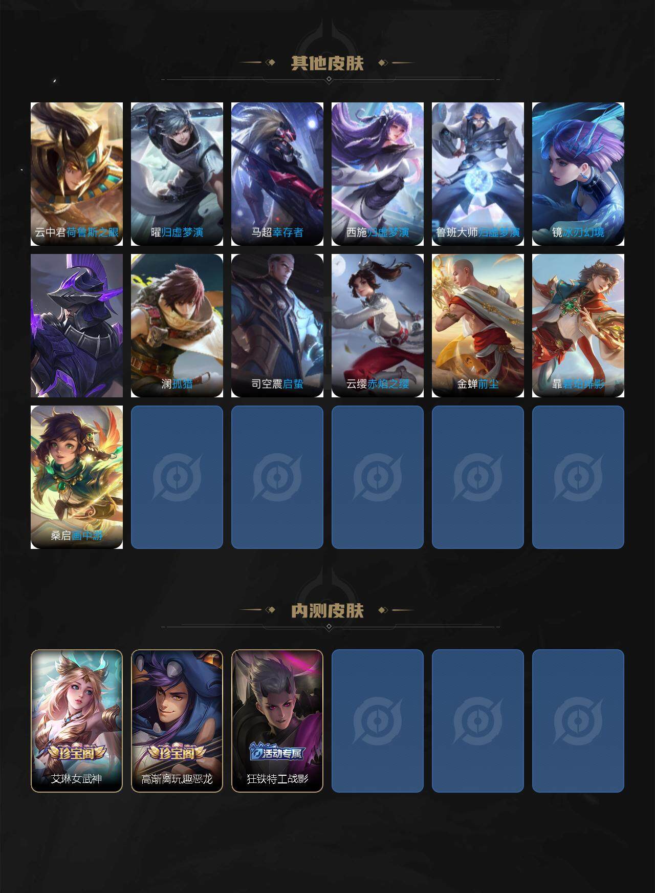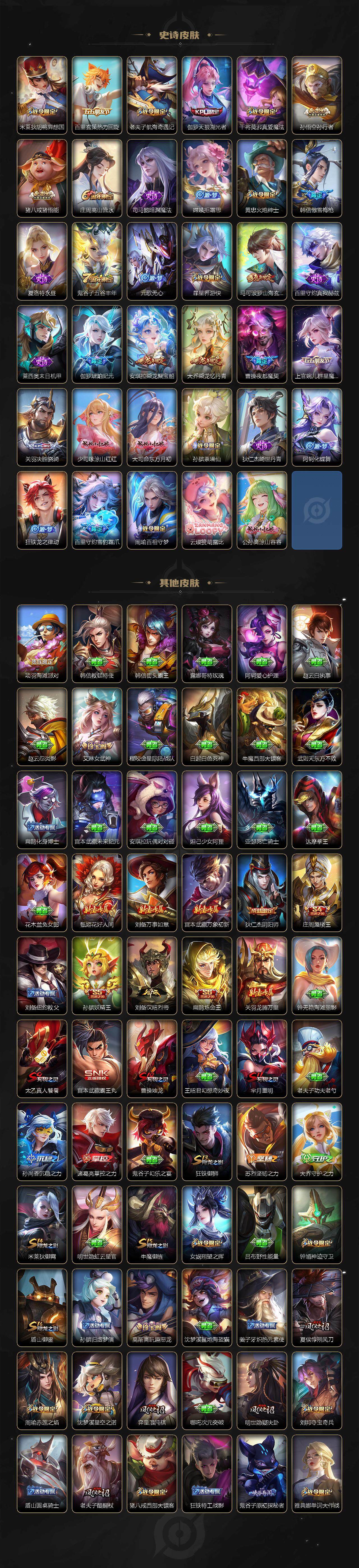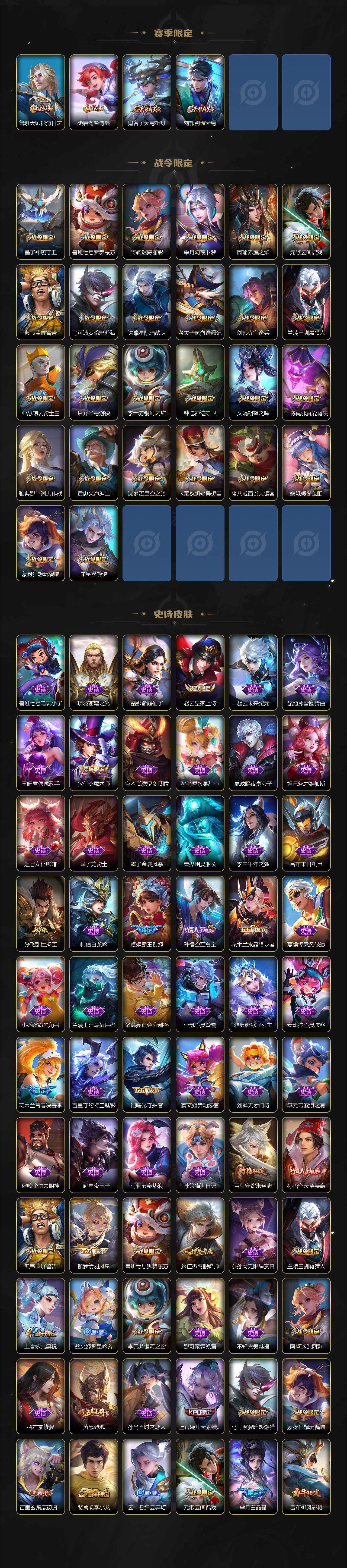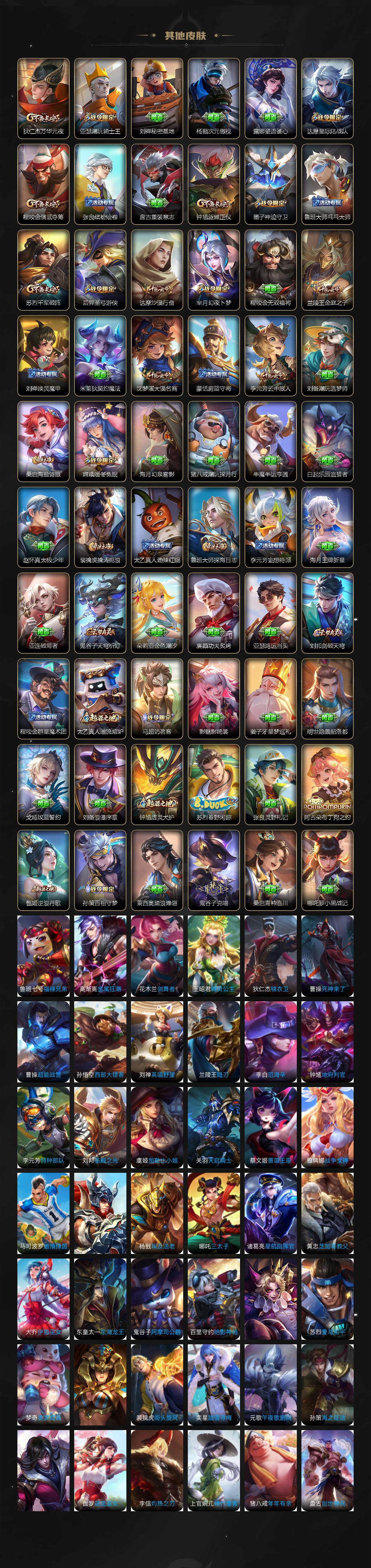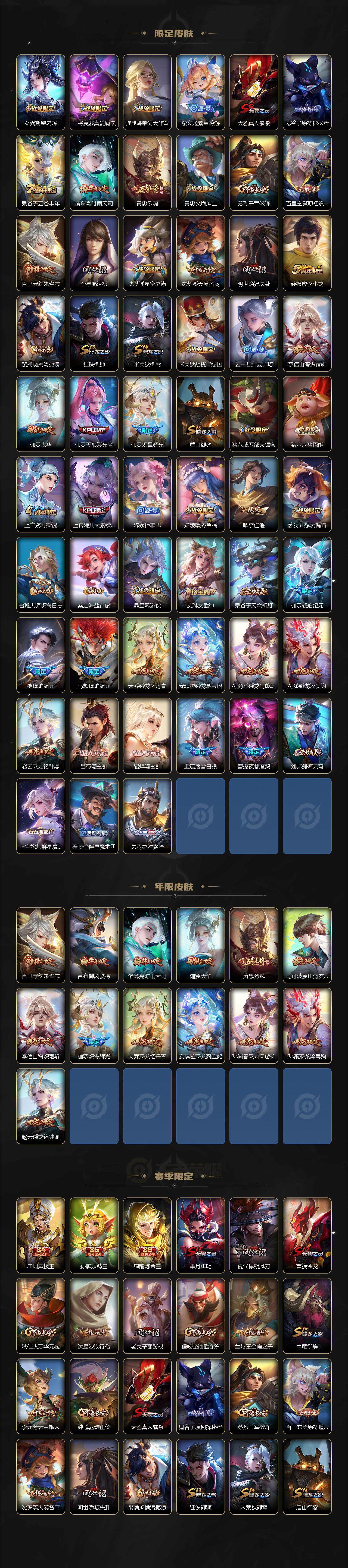 【限定皮肤】:夏侯惇霜北刀,铠冥王哈迪斯,狄仁杰阴阳师,赵云皇家上将,墨子神迹守卫,孙尚香异界灵契,鲁班七号狮舞东方,庄周蜃楼王,庄周高山流水,高渐离玩趣恶龙,阿轲迷踪丽影,孙膑妖精王,扁鹊炼金王,芈月重明,芈月白晶晶,芈月幻夜卜梦,吕布御风骁将,吕布遇见神鼓,周瑜赤莲之焰,元歌云间偶戏,元歌无心,夏侯惇朔风刀,曹操烛龙,典韦蓝屏警告,马可波罗暗影游猎,马可波罗山海玄木吟,狄仁杰魔术师,狄仁杰万华元夜,达摩星际陆战队,达摩沙漠行僧,项羽海滩派对,老夫子醍醐杖,老夫子航海奇遇记,程咬金演武夺筹,刘邦夺宝奇兵,韩信傲雪梅枪,兰陵王影龙天霄,兰陵王驯魔猎人,兰陵王金庭之子,花木兰青春决赛季,亚瑟潮玩骑士王,孙悟空至尊宝,孙悟空大圣娶亲,孙悟空零号赤焰,孙悟空孙行者,孙悟空齐天大圣,牛魔御旌,后羿圣弓游侠,李元芳银河之约,李元芳云中旅人,虞姬霸王别姬,虞姬启明星使,钟馗神迹守卫,钟馗驱傩正仪,女娲朔望之晖,干将莫邪真爱魔法,雅典娜单词大作战,蔡文姬繁星吟游,太乙真人饕餮,鬼谷子原初探秘者,鬼谷子五谷丰年,诸葛亮时雨天司,黄忠烈魂,黄忠火炮绅士,苏烈千军破阵,百里玄策原初追逐者,百里守约朱雀志,弈星混沌棋,沈梦溪星空之诺,沈梦溪大漠名商,明世隐疑决卦,裴擒虎李小龙,裴擒虎擒涛扼浪,狂铁御狮,米莱狄御霄,米莱狄胡桃异想国,云中君纤云弄巧,李信山海炽霜斩,伽罗太华,伽罗天狼溯光者,伽罗炽翼辉光,盾山御銮,猪八戒西部大镖客,猪八戒猪悟能,上官婉儿梁祝,上官婉儿天狼绘梦者,嫦娥拒霜思,嫦