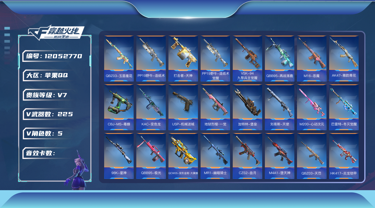 [12052770]可二次 可修改实名 V7 5王者武器 225英雄武器 5英雄角色 462万化 大师 武器:王者之心,王者之光,王者之怒,王者之狱,M200-幻神,AWM-妙才,81式-光明之神,王者之隐,M4A1-游骑兵,M4A1-黑龙,M4A1-黑骑士,AK47-木兰,AK47-死神,M4A1-死神,M4A1-雷神,M4A1-竞技战魂,M4A1-雷霆,M4A1-堕天神,巴雷特-极光,巴雷特-毁灭,AK47-火麒麟,AK47-无影,AK47-燎天净火,QBZ03-死神,MK47-机械纪元,QBZ19-天使,TAC-天使,98K-黑骑士,AWM-游骑兵,QBB95-极光,刘易斯-天使,MK5-极光,双持斯泰尔-天使,AK47-黑鲨,AK47-华夏传说,巴雷特-冬灭觉醒,M4A1-龙血,M4A1-运输船,M4A1-樱龙·二觉,M4A1-赛博雷神,M4A1-心动次元觉醒,巴雷特-安琪拉,AK47-麒麟,AK47-猩红传说,AK47-幸运日,AK12-天启,09式狙-天神,98K-星神,M200-心动次元,GM6-战争风云觉醒,MR1-幽暗骑士,AWM-天龙,AWM-裁决,QBZ03-玉面羞花,MK47-鼓龙,加特林-堡垒,VSK-94-九黎兵主觉醒,汤姆逊-烈龙,加特林-蟒蛇,QCW05-变形金刚·大黄蜂,寒霜烈龙,CBJ-MS-毒蜂,地狱烈樱·一觉,PP19野牛-造纸术觉醒,PP19野牛-造纸术,地狱火,CZS2-心动次元觉醒,地狱烈炎,CZS2-血月,打击者-天神,AK47-雅韵青花,KAC-变色龙,M16-恶魔,沙鹰-竞技战魂,沙鹰-修罗,USP-机械迷城,沙鹰-火麒麟,沙鹰-幻兽,QBB95-再战涿鹿,USP-太白诗仙,MK47-塔罗牌觉醒,沙鹰-飞电,沙鹰-天神,HK417-朱雀,AWM-指南针,AWM-指南针觉醒,HK417-炎龙铠甲,QBZ03-天罚,AWM-大湾溢彩