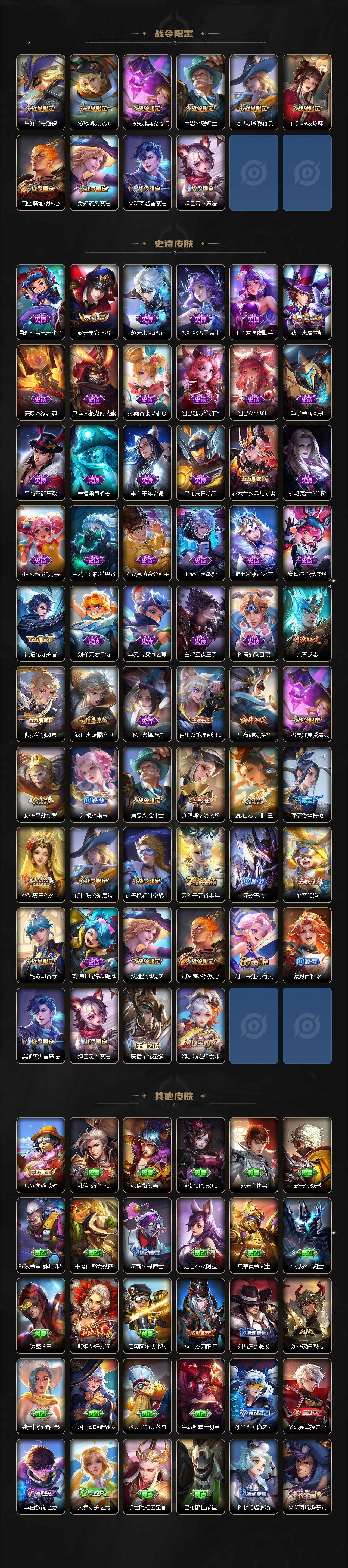 【限定皮肤】:狄仁杰阴阳师,赵云皇家上将,高渐离玩趣恶龙,钟无艳超时空战士,扁鹊奇幻香踪,白起夜都怪侠,芈月幻夜卜梦,吕布御风骁将,元歌无心,甄姬女儿国国王,甄姬落雪兰心,狄仁杰魔术师,达摩沙漠行僧,项羽海滩派对,韩信傲雪梅枪,兰陵王金庭之子,孙悟空孙行者,孙悟空齐天大圣,后羿圣弓游侠,李元芳云中旅人,杨戬潮玩骑兵,干将莫邪真爱魔法,雅典娜黎明之约,鬼谷子五谷丰年,诸葛亮武陵仙君,黄忠火炮绅士,铠青龙志,苏烈千军破阵,百里玄策原初追逐者,梦奇顽趣,公孙离玉兔公主,沈梦溪大漠名商,明世隐吟游魔法,裴擒虎擒涛扼浪,李信山海炽霜斩,嫦娥拒霜思,西施玲珑珍味,鲁班大师探海日志,桑启海盐诗旅,戈娅驭风魔法,艾琳流音漫舞,司空震地狱燃心,阿古朵江河有灵,张良古海寻踪,蒙犽百解令,蒙恬荣光圣徽,高渐离燃音魔法,妲己灵卜魔法,鬼谷子天穹祈灯,姬小满妄想食味,沈梦溪龙舞盛年,刘邦剑破天穹,程咬金群星魔术团