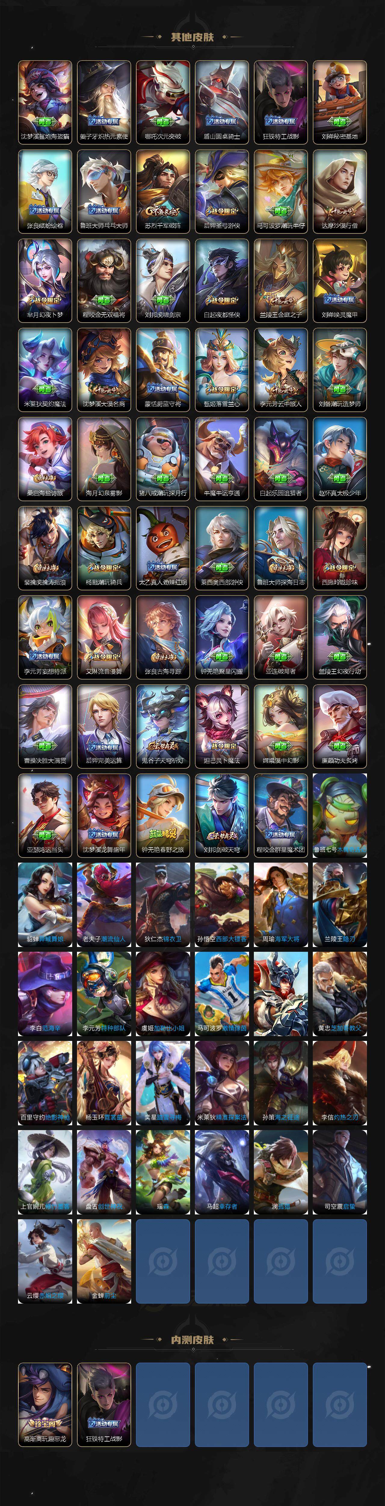 【赛季限定】:达摩沙漠行僧,兰陵王金庭之子,张良古海寻踪,李元芳云中旅人,雅典娜黎明之约,苏烈千军破阵,百里玄策原初追逐者,梦奇顽趣,沈梦溪大漠名商,裴擒虎擒涛扼浪,鲁班大师探海日志,桑启海盐诗旅,鬼谷子天穹祈灯,蒙恬荣光圣徽,刘邦剑破天穹
