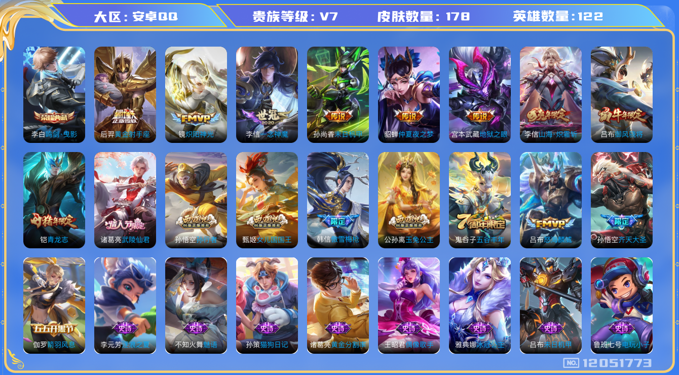 - [11968484]V7 1典藏 15传说 123英雄 301皮肤 可修改实名 优质装备:九霄神辉(木兰典藏),云鹰飞将(小将军),炽阳神光,一念神魔,地狱火,李逍遥,时之恋人-刘备(电焊工),无双飞将,霜月吟,澜逐花归海,涂山容容 传说皮:祥瑞亨通,幻光神枪 珍宝阁皮:蔷薇恋人,女武神,玩趣恶龙 限定皮:愿照·九州拓(澜年限),愿照·千秋盛(女娲年限),逐霄战戟,鸣野蒿,五谷丰年,匿光追影者,寅虎·赤拳(老虎年限),玉兔公主,山海·玄木吟(马可年限) 史诗皮:器灵·浮梦炉,糖绘人间,星界战将,谪仙醉月,龙之律动,百相守梦-周瑜,茶境仙,破空之剑,蔬乡物语(鲁班七号),超元猎域,百相守梦-百里守约,百相守梦-黄忠,紫霞仙子,特工魅影,江河有灵,雪夜绮愿(周瑜),魅语,百解令(蒙犽),高渐离燃音魔法,偶像歌手,末日机甲-吕布,猫狗日记-孙策,乱世虎臣,节奏热浪,修罗,女仆咖啡,摇滚巨星,水果甜心,星夜王子,心灵骇客,功夫厨神,德古拉伯爵,暗隐猎兽者,幽灵船长,鬼剑武藏,暗渊魔法,心灵战警,乐园奇幻夜,舞动绿茵,纤云弄巧,拒霜思,缤纷独角兽,乘风破浪,逐浪之夏,月团寄思,水晶猎龙者,曙光守护者,箭羽风息,金属风暴,圣诞狂欢,圣诞恋歌,鹰眼统帅,暗夜贵公子,魅力维加斯,赏金猎手,天秀·音浪,无心,未来纪元-赵云