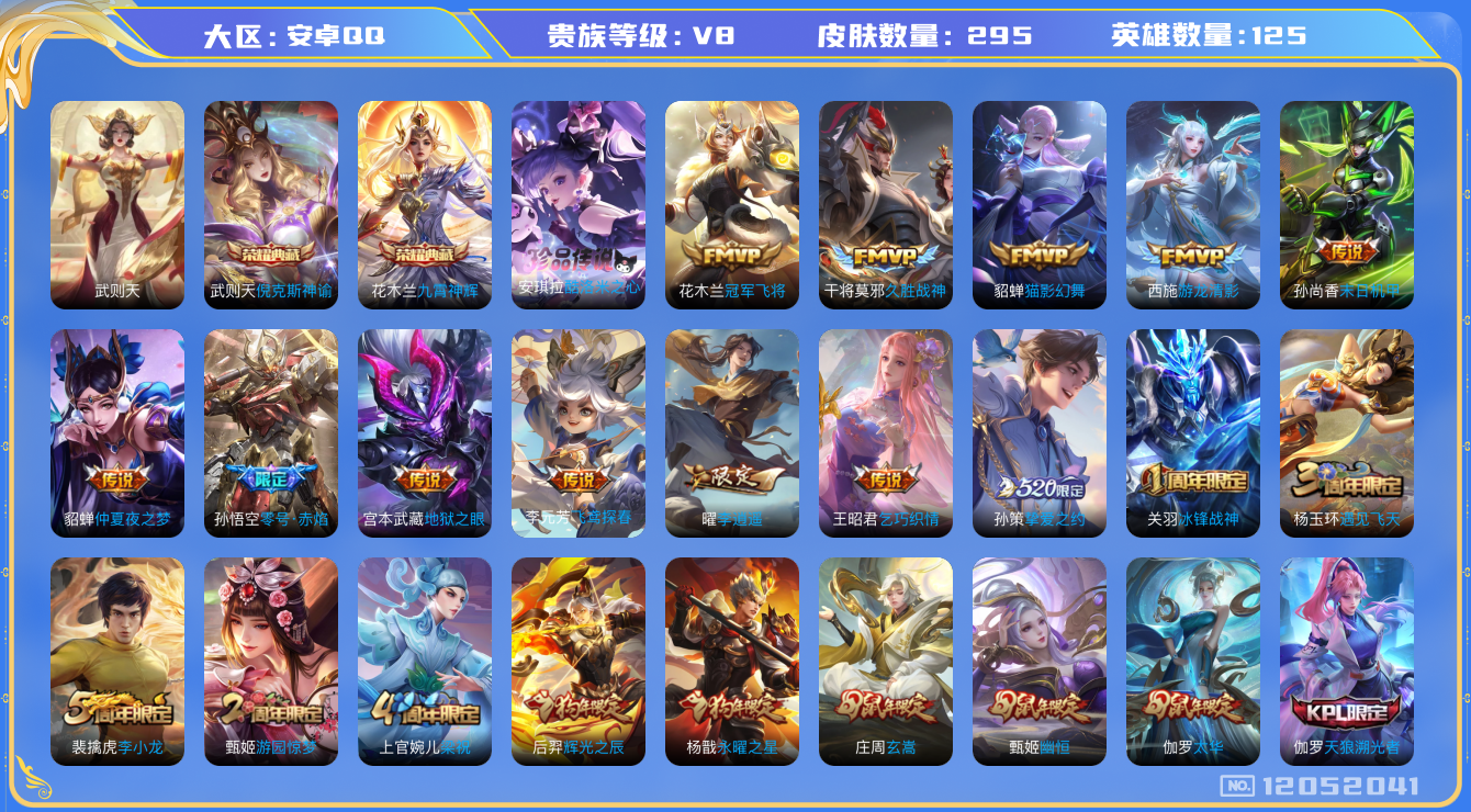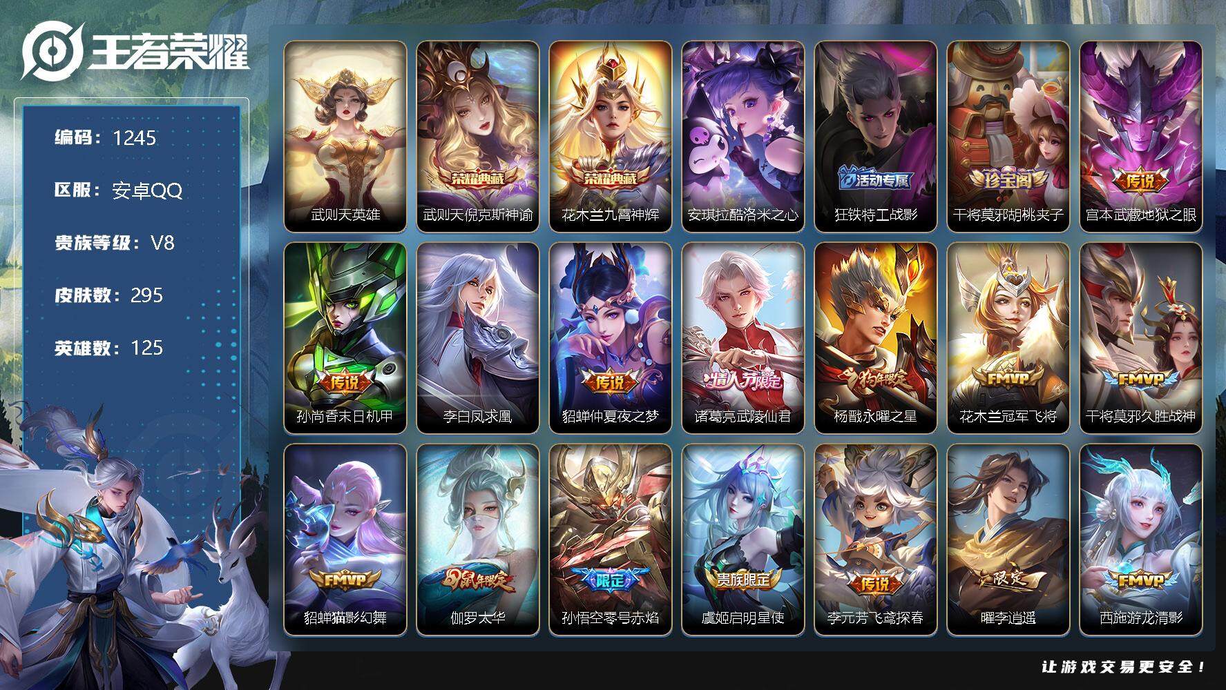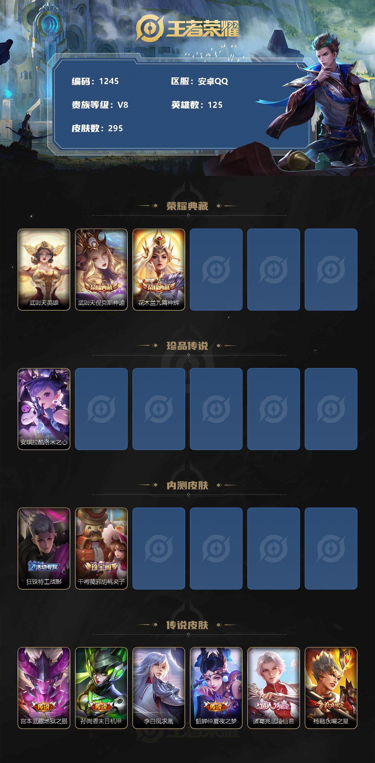 [12052041]【商品标题】:安卓Q-V8-至尊星耀V段位-125英雄-295皮肤-2典藏-0珍品无双-0无双-1珍品传说-17传说-88史诗