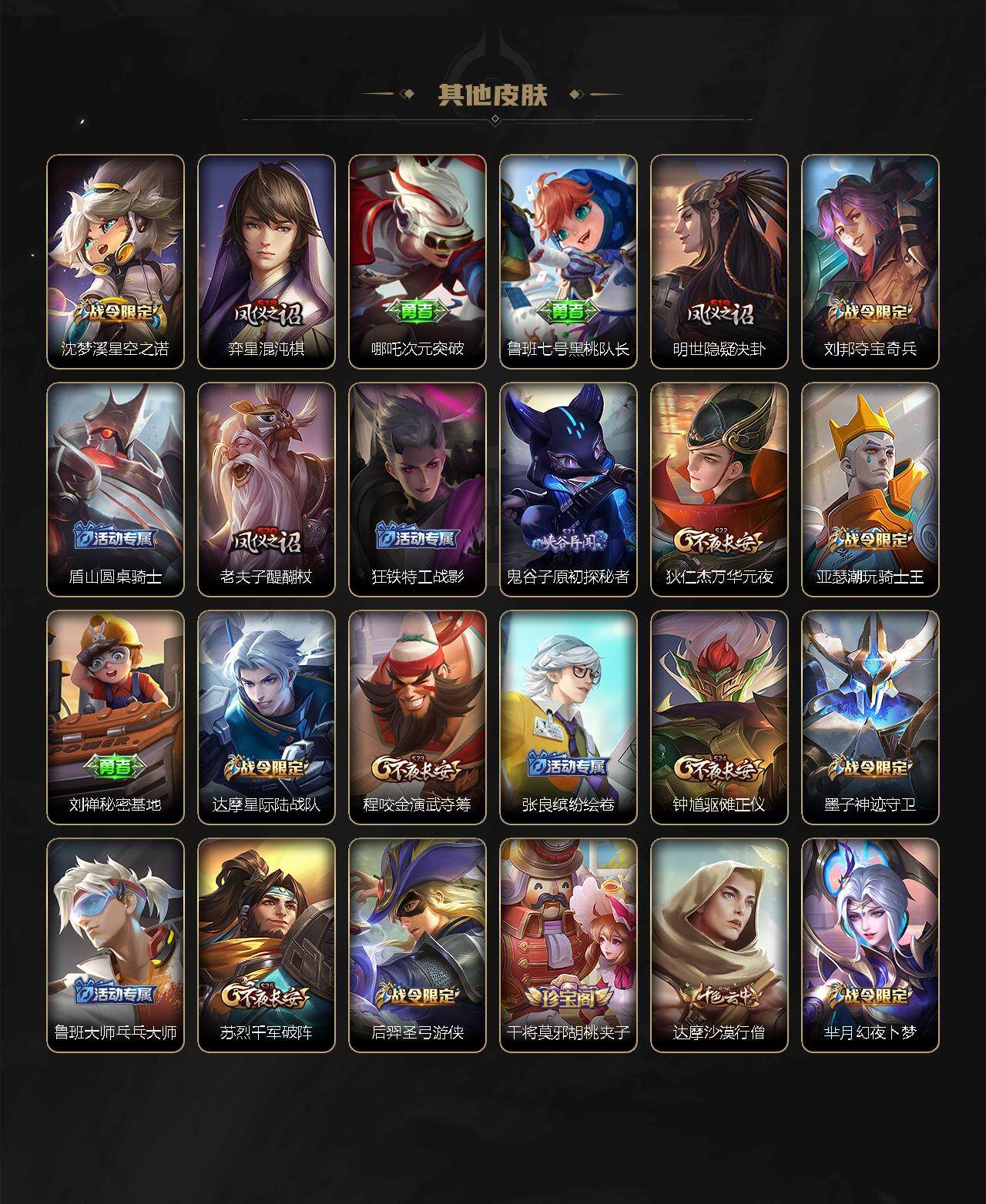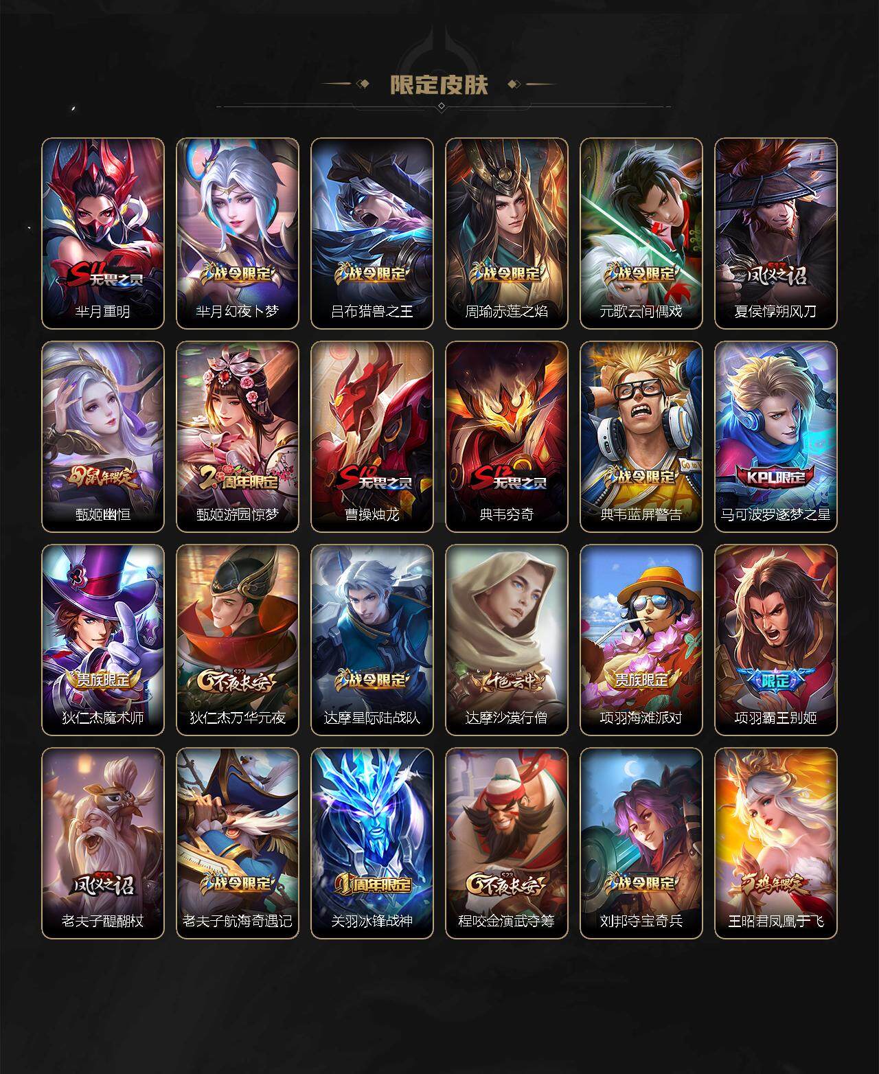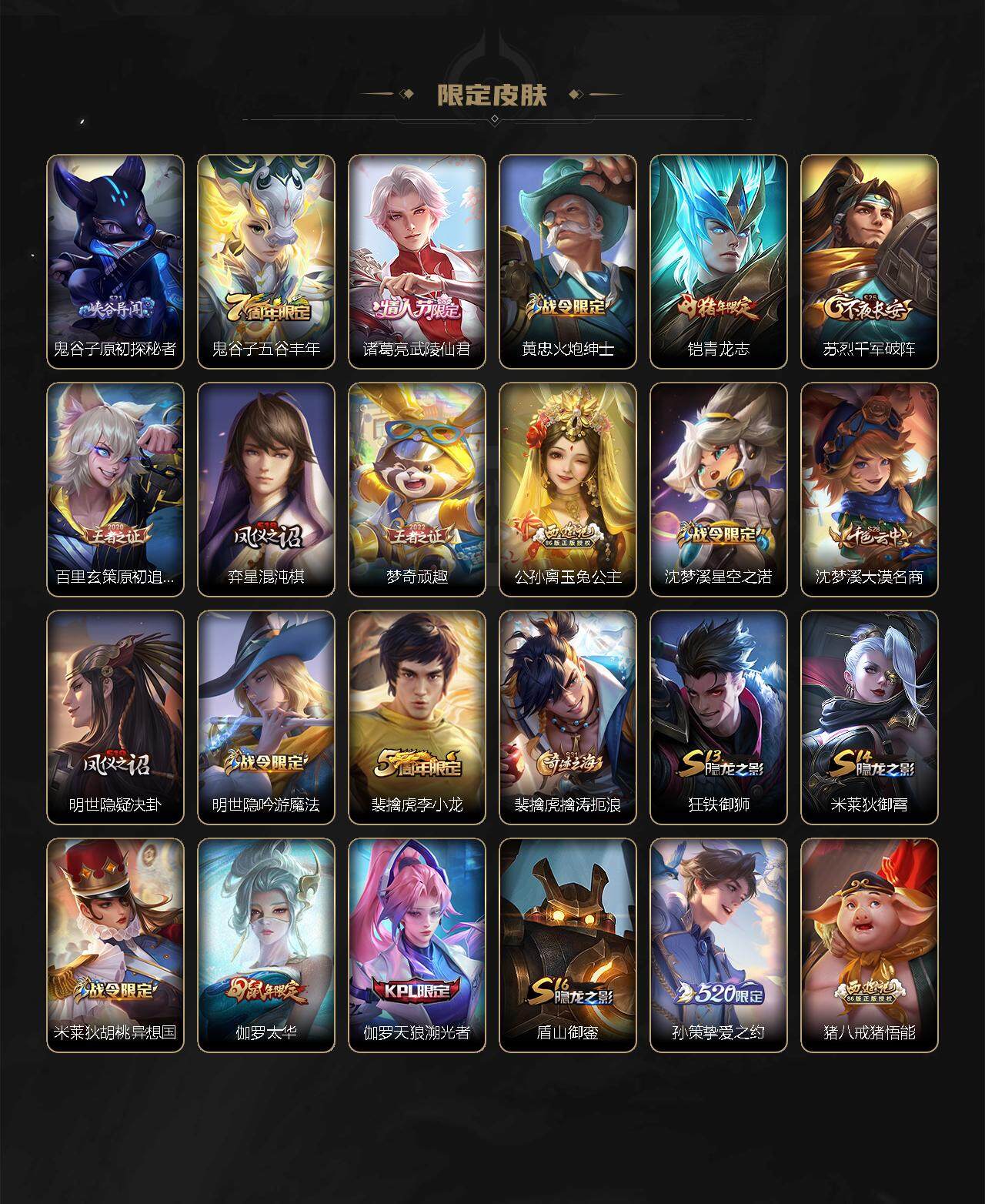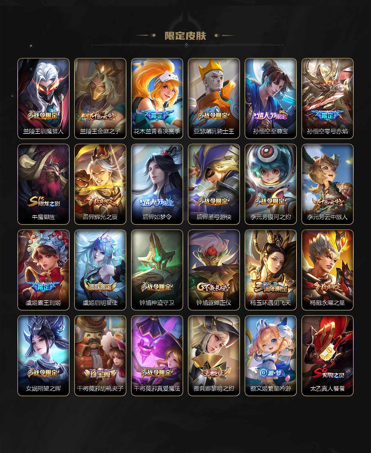 【限定皮肤】:白起狰,狄仁杰阴阳师,虞姬凯尔特女王,赵云皇家上将,墨子神迹守卫,妲己时之彼端,嬴政白昼王子,鲁班七号狮舞东方,庄周玄嵩,庄周高山流水,阿轲迷踪丽影,白起夜都怪侠,芈月重明,芈月幻夜卜梦,吕布猎兽之王,周瑜赤莲之焰,元歌云间偶戏,夏侯惇朔风刀,甄姬幽恒,甄姬游园惊梦,曹操烛龙,典韦穷奇,典韦蓝屏警告,马可波罗逐梦之星,狄仁杰魔术师,狄仁杰万华元夜,达摩星际陆战队,达摩沙漠行僧,项羽海滩派对,项羽霸王别姬,老夫子醍醐杖,老夫子航海奇遇记,关羽冰锋战神,程咬金演武夺筹,刘邦夺宝奇兵,王昭君凤凰于飞,兰陵王驯魔猎人,兰陵王金庭之子,花木兰青春决赛季,亚瑟潮玩骑士王,孙悟空至尊宝,孙悟空零号赤焰,牛魔御旌,后羿辉光之辰,后羿如梦令,后羿圣弓游侠,李元芳银河之约,李元芳云中旅人,虞姬霸王别姬,虞姬启明星使,钟馗神迹守卫,钟馗驱傩正仪,杨玉环遇见飞天,杨戬永曜之星,女娲朔望之晖,干将莫邪胡桃夹子,干将莫邪真爱魔法,雅典娜黎明之约,蔡文姬繁星吟游,太乙真人饕餮,鬼谷子原初探秘者,鬼谷子五谷丰年,诸葛亮武陵仙君,黄忠火炮绅士,铠青龙志,苏烈千军破阵,百里玄策原初追逐者,弈星混沌棋,梦奇顽趣,公孙离玉兔公主,沈梦溪星空之诺,沈梦溪大漠名商,明世隐疑决卦,明世隐吟游魔法,裴擒虎李小龙,裴擒虎擒涛扼浪,狂铁御狮,米莱狄御霄,米莱狄胡桃异想国,伽罗太华,伽罗天狼溯光者,盾山御銮,孙策挚爱之约,猪八戒猪悟能,上官婉儿梁祝,嫦娥如梦令,嫦娥拒霜思,曜李逍遥 ,鲁班大师探海日志,桑启海盐诗旅,张良古海寻踪,蒙恬荣光圣徽,鬼谷子天穹祈灯