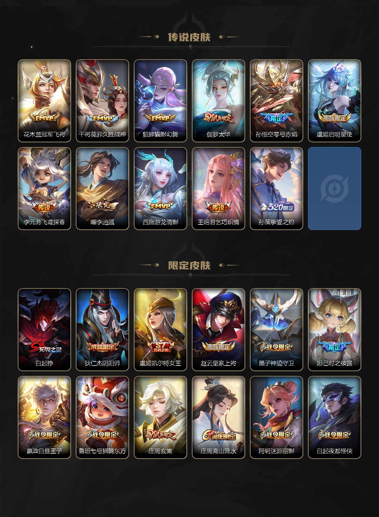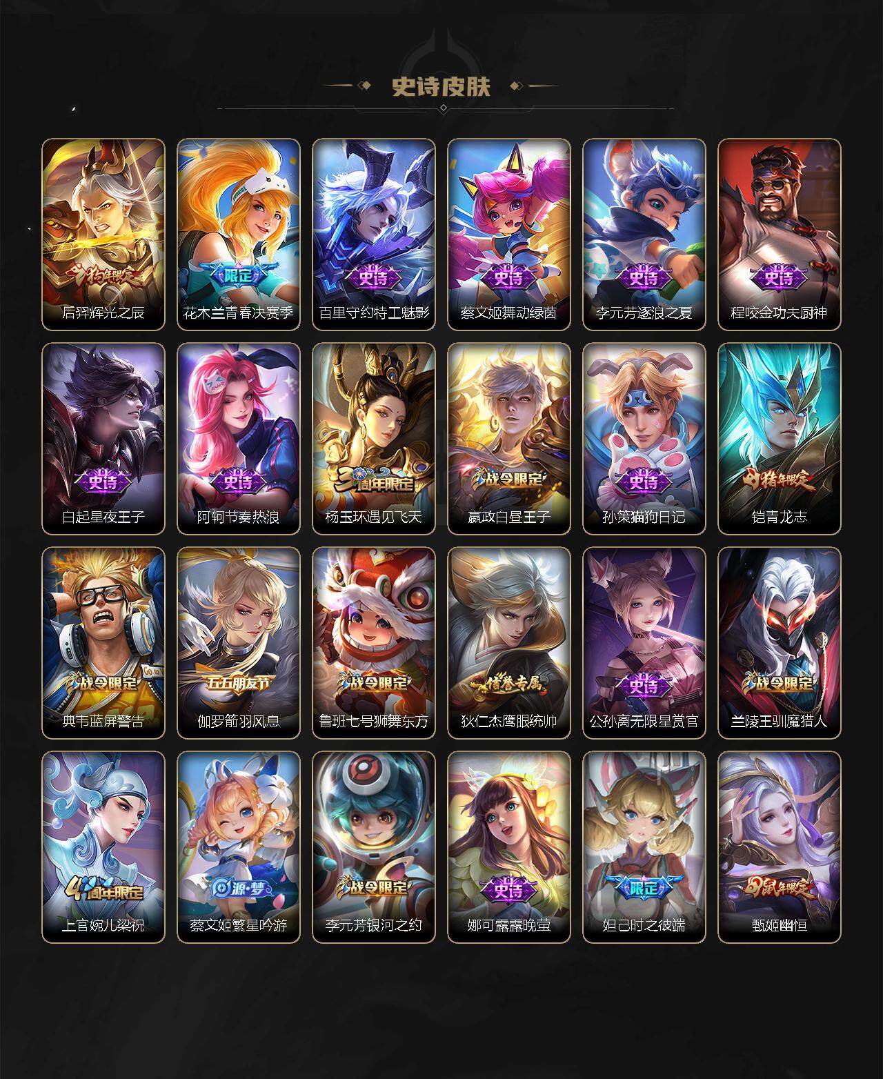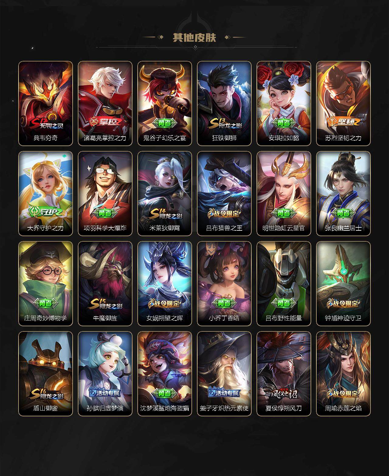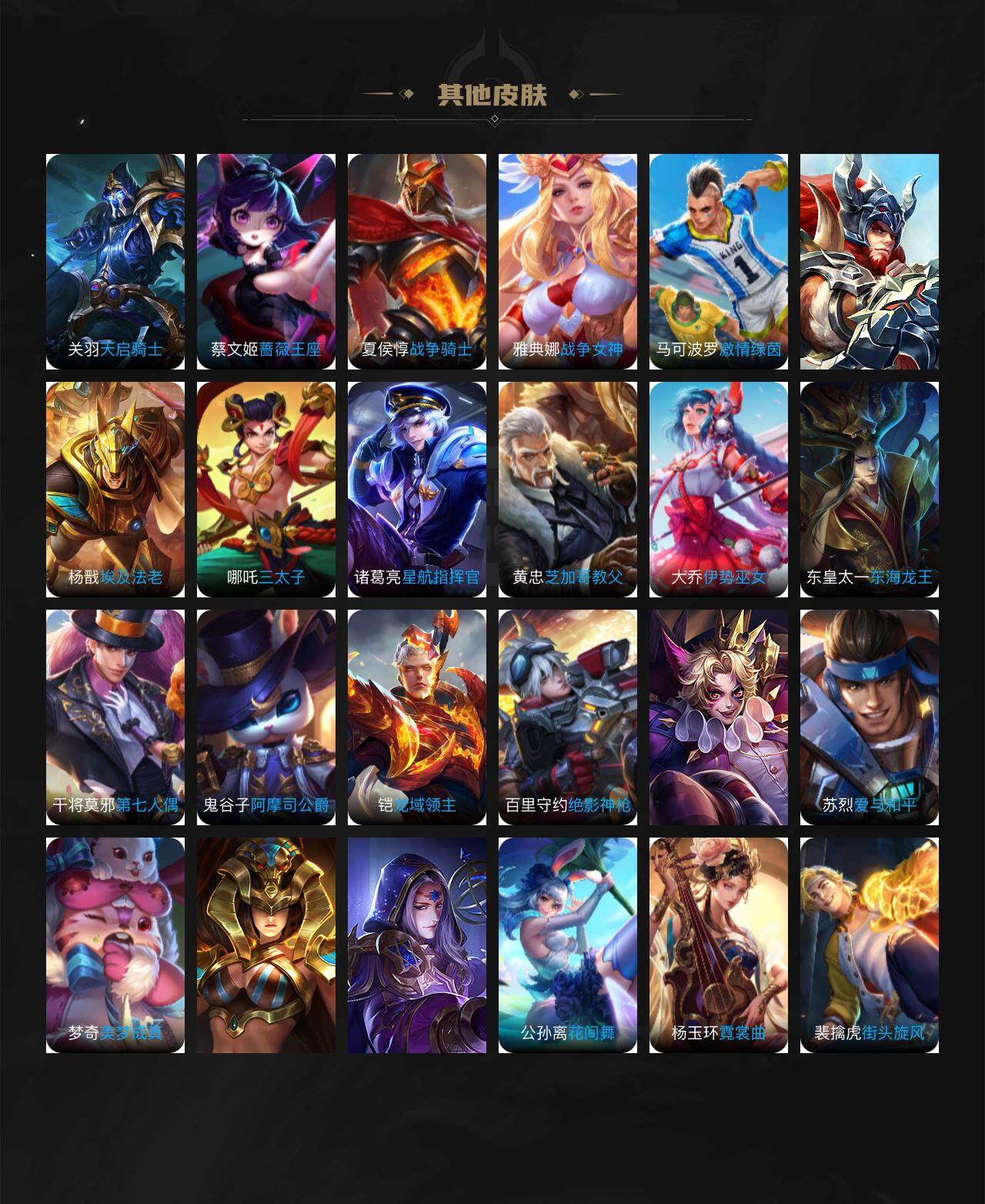 【限定皮肤】:白起狰,狄仁杰阴阳师,虞姬凯尔特女王,赵云皇家上将,墨子神迹守卫,妲己时之彼端,嬴政白昼王子,鲁班七号狮舞东方,庄周玄嵩,庄周高山流水,阿轲迷踪丽影,白起夜都怪侠,芈月重明,芈月幻夜卜梦,吕布猎兽之王,周瑜赤莲之焰,元歌云间偶戏,夏侯惇朔风刀,甄姬幽恒,甄姬游园惊梦,曹操烛龙,典韦穷奇,典韦蓝屏警告,马可波罗逐梦之星,狄仁杰魔术师,狄仁杰万华元夜,达摩星际陆战队,达摩沙漠行僧,项羽海滩派对,项羽霸王别姬,老夫子醍醐杖,老夫子航海奇遇记,关羽冰锋战神,程咬金演武夺筹,刘邦夺宝奇兵,王昭君凤凰于飞,兰陵王驯魔猎人,兰陵王金庭之子,花木兰青春决赛季,亚瑟潮玩骑士王,孙悟空至尊宝,孙悟空零号赤焰,牛魔御旌,后羿辉光之辰,后羿如梦令,后羿圣弓游侠,李元芳银河之约,李元芳云中旅人,虞姬霸王别姬,虞姬启明星使,钟馗神迹守卫,钟馗驱傩正仪,杨玉环遇见飞天,杨戬永曜之星,女娲朔望之晖,干将莫邪胡桃夹子,干将莫邪真爱魔法,雅典娜黎明之约,蔡文姬繁星吟游,太乙真人饕餮,鬼谷子原初探秘者,鬼谷子五谷丰年,诸葛亮武陵仙君,黄忠火炮绅士,铠青龙志,苏烈千军破阵,百里玄策原初追逐者,弈星混沌棋,梦奇顽趣,公孙离玉兔公主,沈梦溪星空之诺,沈梦溪大漠名商,明世隐疑决卦,明世隐吟游魔法,裴擒虎李小龙,裴擒虎擒涛扼浪,狂铁御狮,米莱狄御霄,米莱狄胡桃异想国,伽罗太华,伽罗天狼溯光者,盾山御銮,孙策挚爱之约,猪八戒猪悟能,上官婉儿梁祝,嫦娥如梦令,嫦娥拒霜思,曜李逍遥 ,鲁班大师探海日志,桑启海盐诗旅,张良古海寻踪,蒙恬荣光圣徽,鬼谷子天穹祈灯
