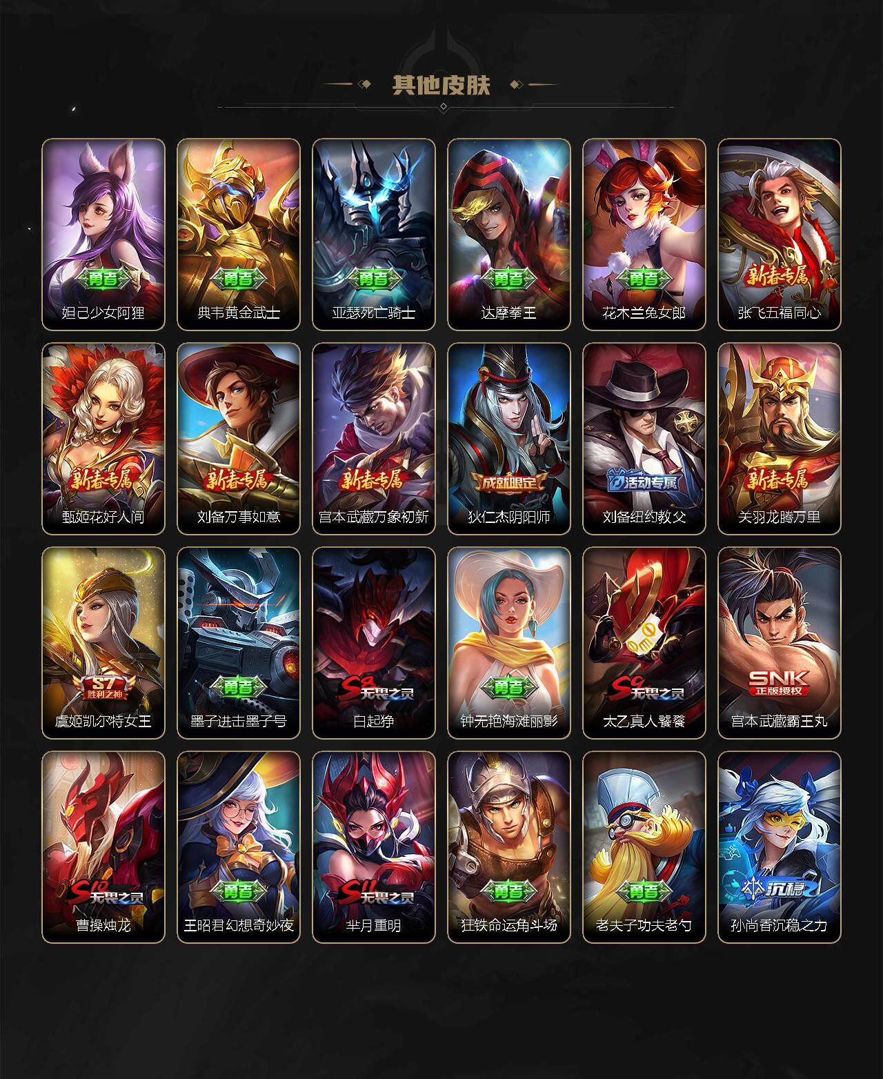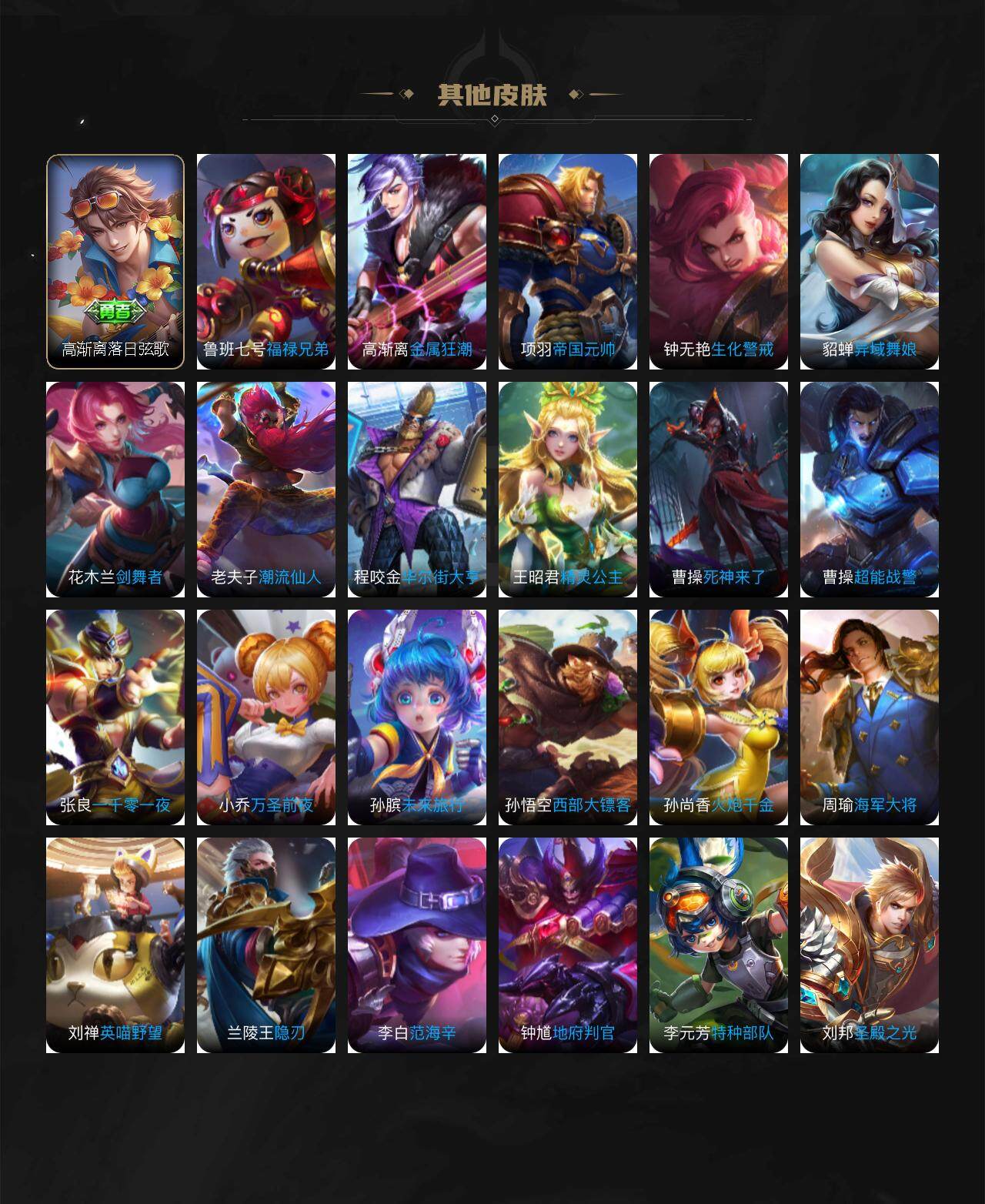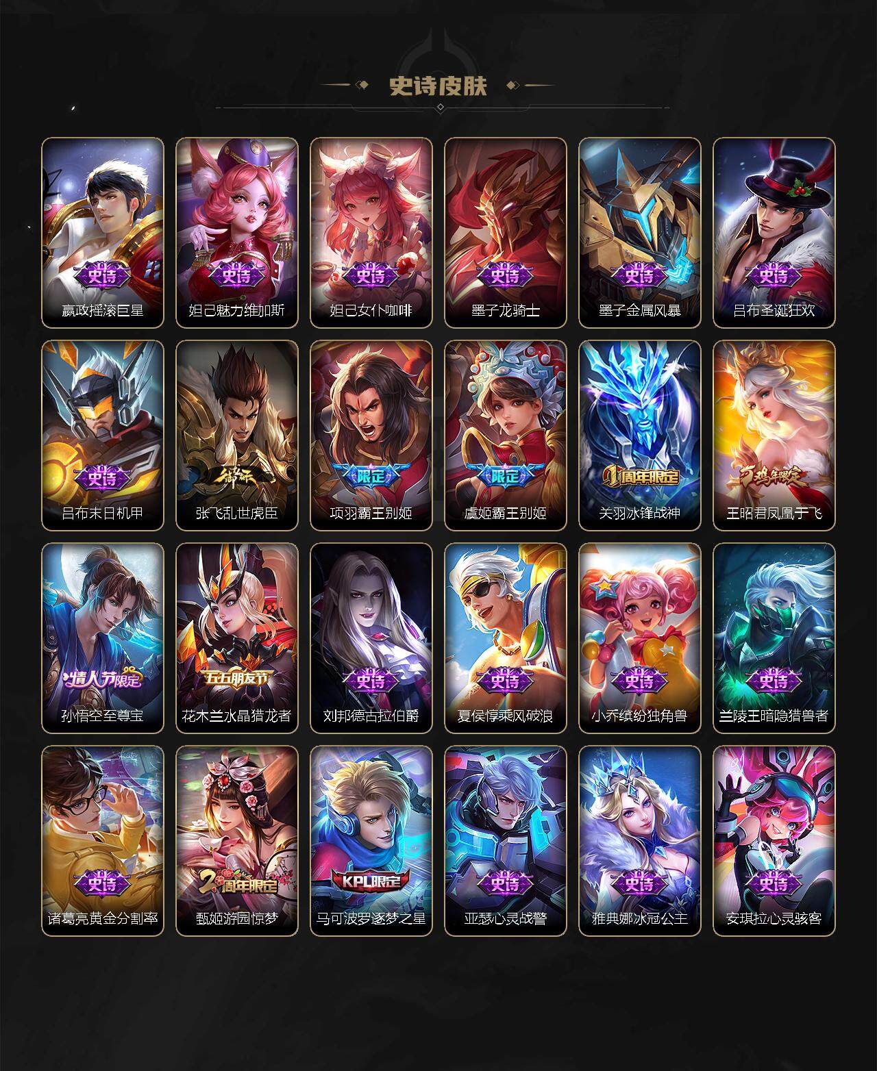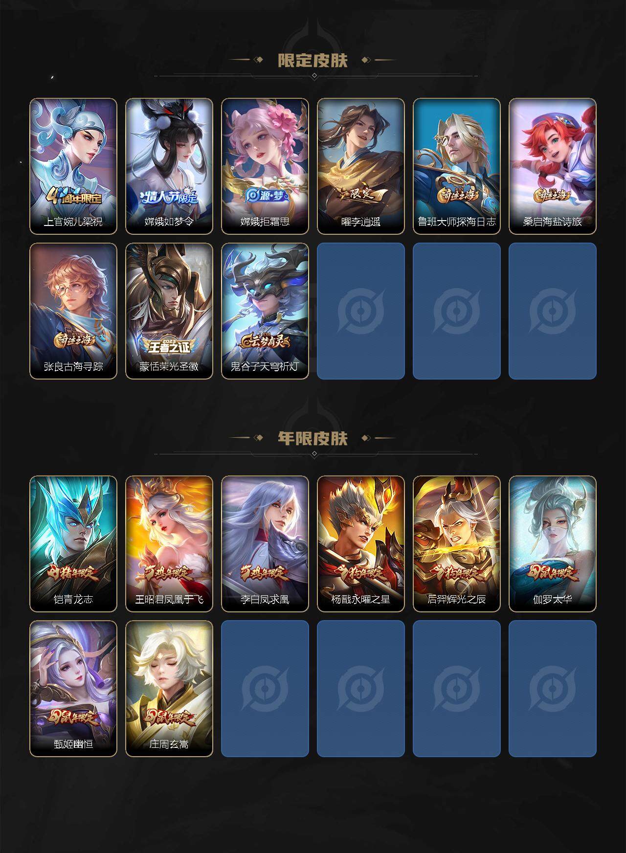 【限定皮肤】:白起狰,狄仁杰阴阳师,虞姬凯尔特女王,赵云皇家上将,墨子神迹守卫,妲己时之彼端,嬴政白昼王子,鲁班七号狮舞东方,庄周玄嵩,庄周高山流水,阿轲迷踪丽影,白起夜都怪侠,芈月重明,芈月幻夜卜梦,吕布猎兽之王,周瑜赤莲之焰,元歌云间偶戏,夏侯惇朔风刀,甄姬幽恒,甄姬游园惊梦,曹操烛龙,典韦穷奇,典韦蓝屏警告,马可波罗逐梦之星,狄仁杰魔术师,狄仁杰万华元夜,达摩星际陆战队,达摩沙漠行僧,项羽海滩派对,项羽霸王别姬,老夫子醍醐杖,老夫子航海奇遇记,关羽冰锋战神,程咬金演武夺筹,刘邦夺宝奇兵,王昭君凤凰于飞,兰陵王驯魔猎人,兰陵王金庭之子,花木兰青春决赛季,亚瑟潮玩骑士王,孙悟空至尊宝,孙悟空零号赤焰,牛魔御旌,后羿辉光之辰,后羿如梦令,后羿圣弓游侠,李元芳银河之约,李元芳云中旅人,虞姬霸王别姬,虞姬启明星使,钟馗神迹守卫,钟馗驱傩正仪,杨玉环遇见飞天,杨戬永曜之星,女娲朔望之晖,干将莫邪胡桃夹子,干将莫邪真爱魔法,雅典娜黎明之约,蔡文姬繁星吟游,太乙真人饕餮,鬼谷子原初探秘者,鬼谷子五谷丰年,诸葛亮武陵仙君,黄忠火炮绅士,铠青龙志,苏烈千军破阵,百里玄策原初追逐者,弈星混沌棋,梦奇顽趣,公孙离玉兔公主,沈梦溪星空之诺,沈梦溪大漠名商,明世隐疑决卦,明世隐吟游魔法,裴擒虎李小龙,裴擒虎擒涛扼浪,狂铁御狮,米莱狄御霄,米莱狄胡桃异想国,伽罗太华,伽罗天狼溯光者,盾山御銮,孙策挚爱之约,猪八戒猪悟能,上官婉儿梁祝,嫦娥如梦令,嫦娥拒霜思,曜李逍遥 ,鲁班大师探海日志,桑启海盐诗旅,张良古海寻踪,蒙恬荣光圣徽,鬼谷子天穹祈灯