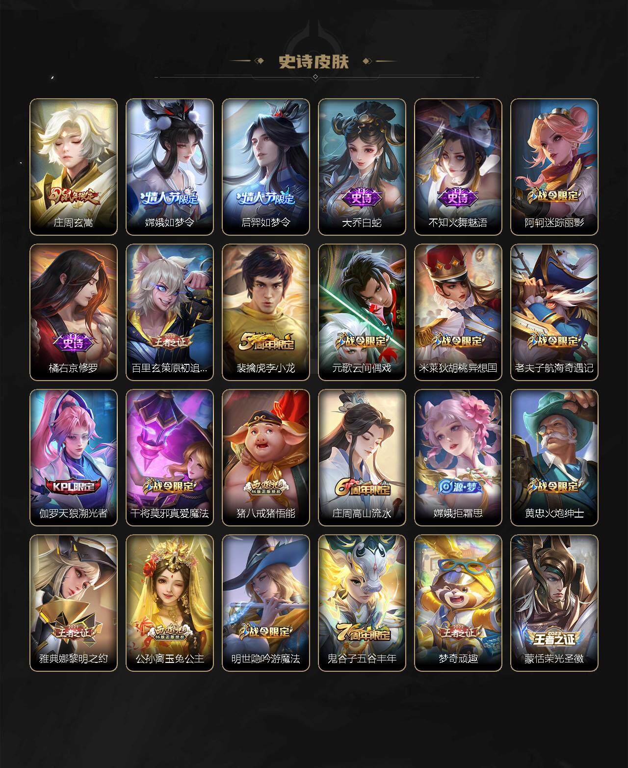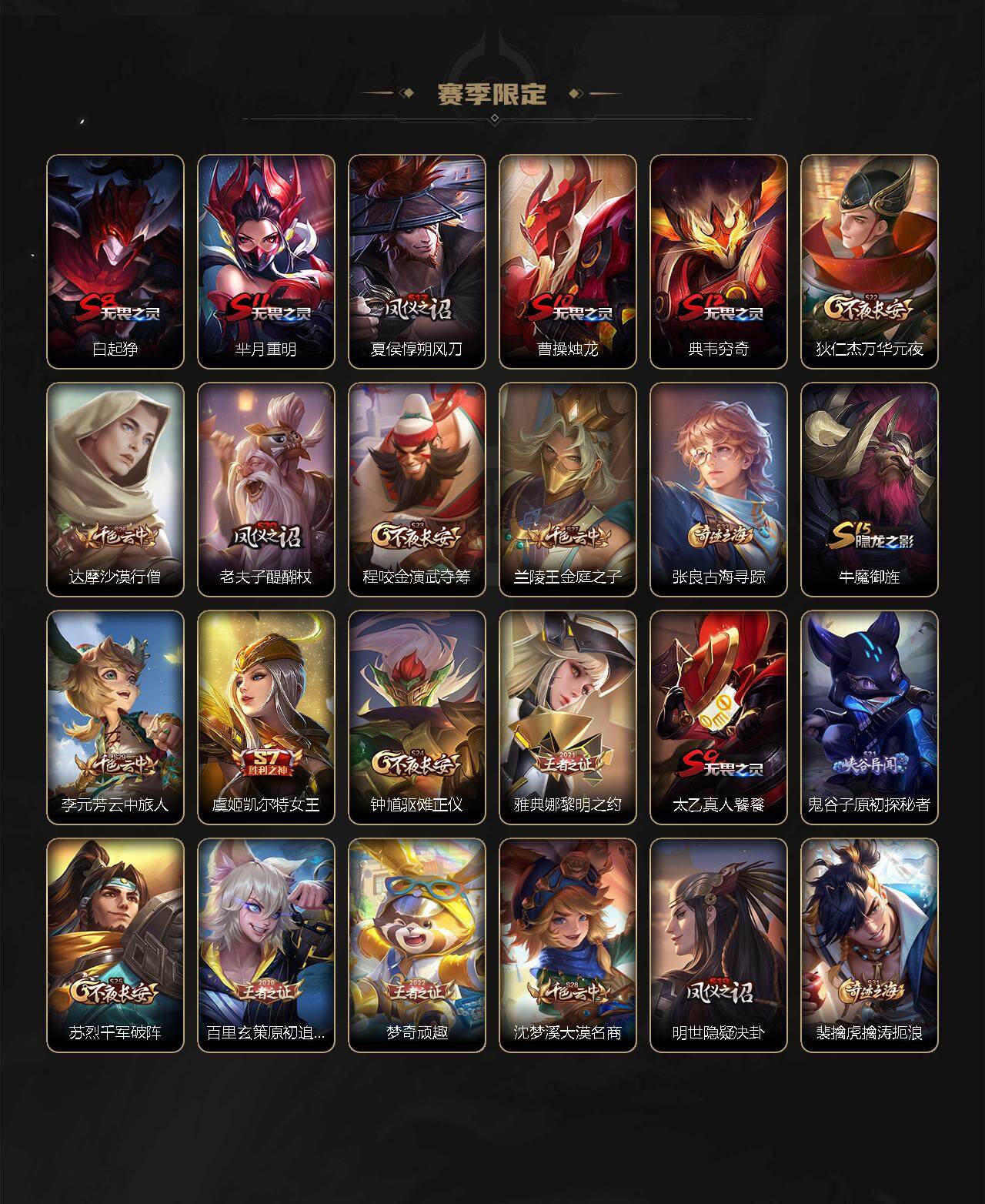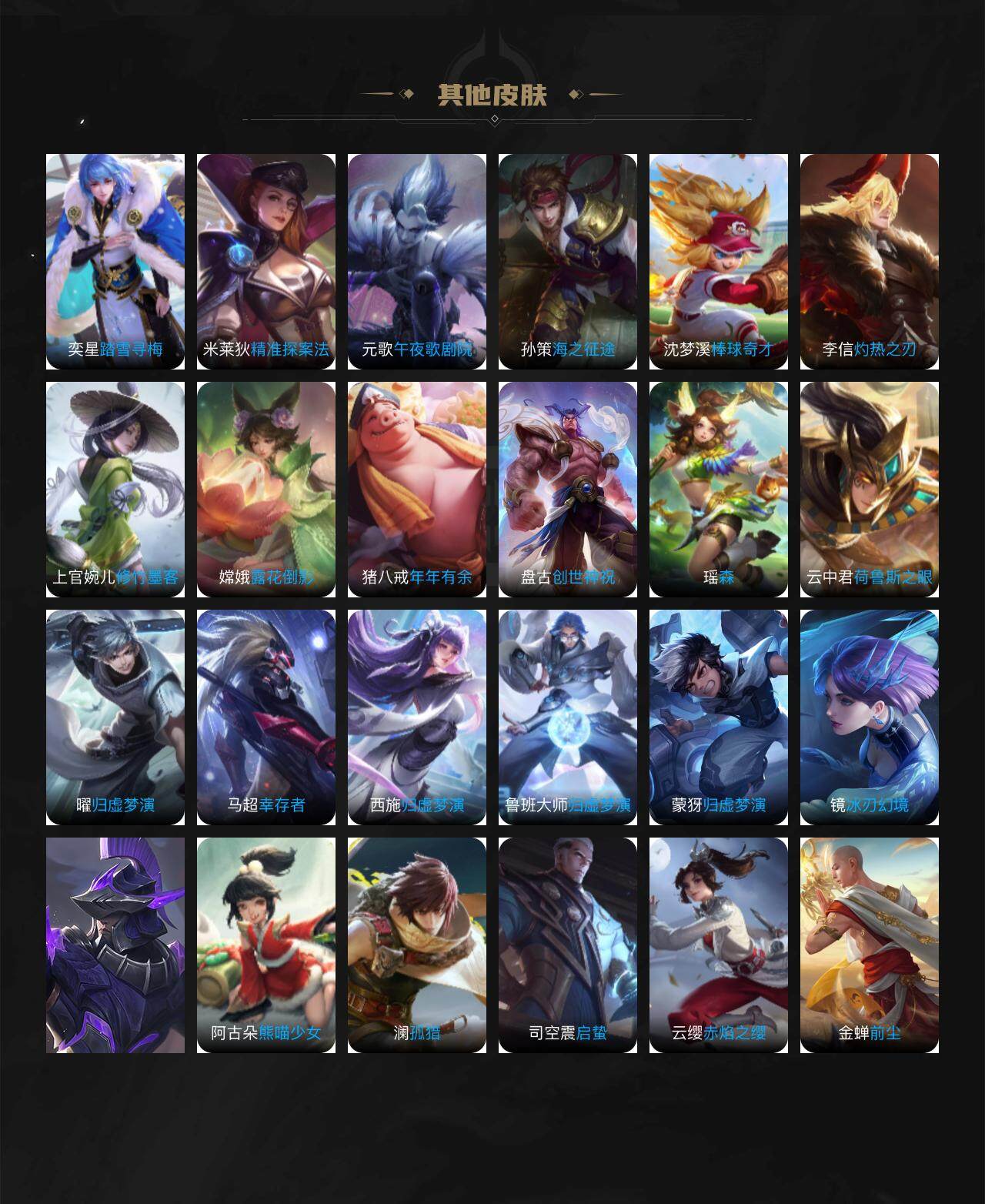 虞姬凯尔特女王,白起狰,太乙真人饕餮,曹操烛龙,芈月重明,典韦穷奇,狂铁御狮,米莱狄御霄,牛魔御旌,盾山御銮,夏侯惇朔风刀,明世隐疑决卦,老夫子醍醐杖,鬼谷子原初探秘者,狄仁杰万华元夜,程咬金演武夺筹,钟馗驱傩正仪,苏烈千军破阵,吕布猎兽之王,嬴政白昼王子,女娲朔望之晖,典韦蓝屏警告,钟馗神迹守卫,鲁班七号狮舞东方,沈梦溪星空之诺,李元芳银河之约,刘邦夺宝奇兵,元歌云间偶戏,弈星混沌棋,达摩沙漠行僧,兰陵王金庭之子,沈梦溪大漠名商,李元芳云中旅人,桑启海盐诗旅,裴擒虎擒涛扼浪,鲁班大师探海日志,张良古海寻踪