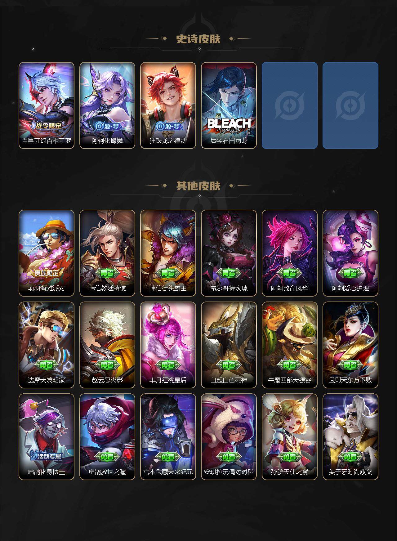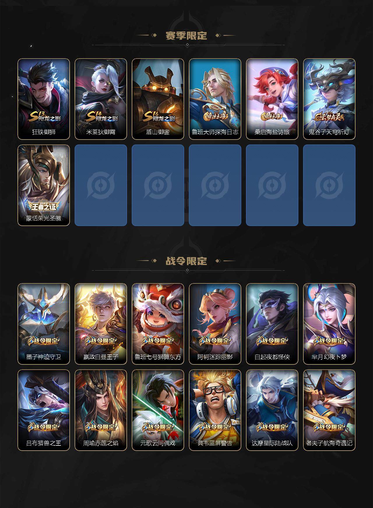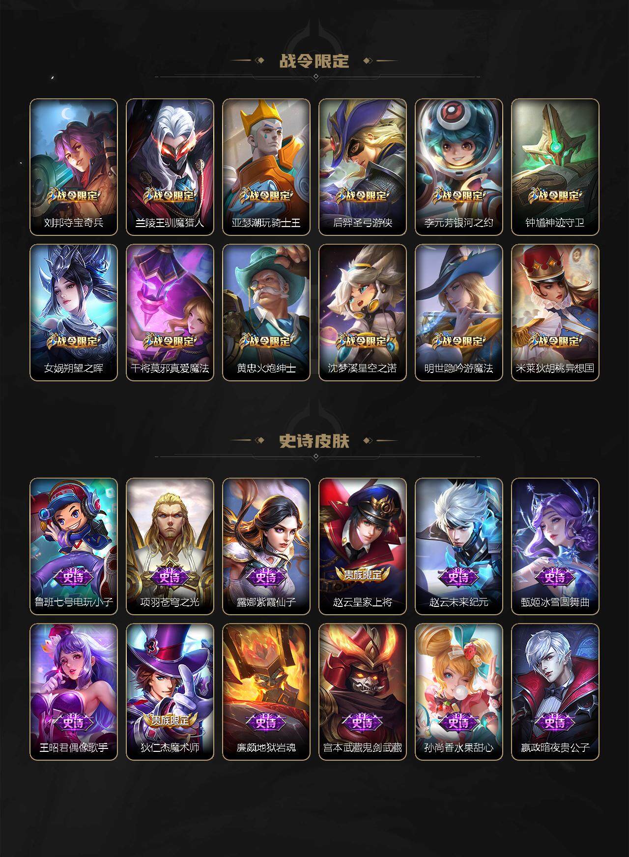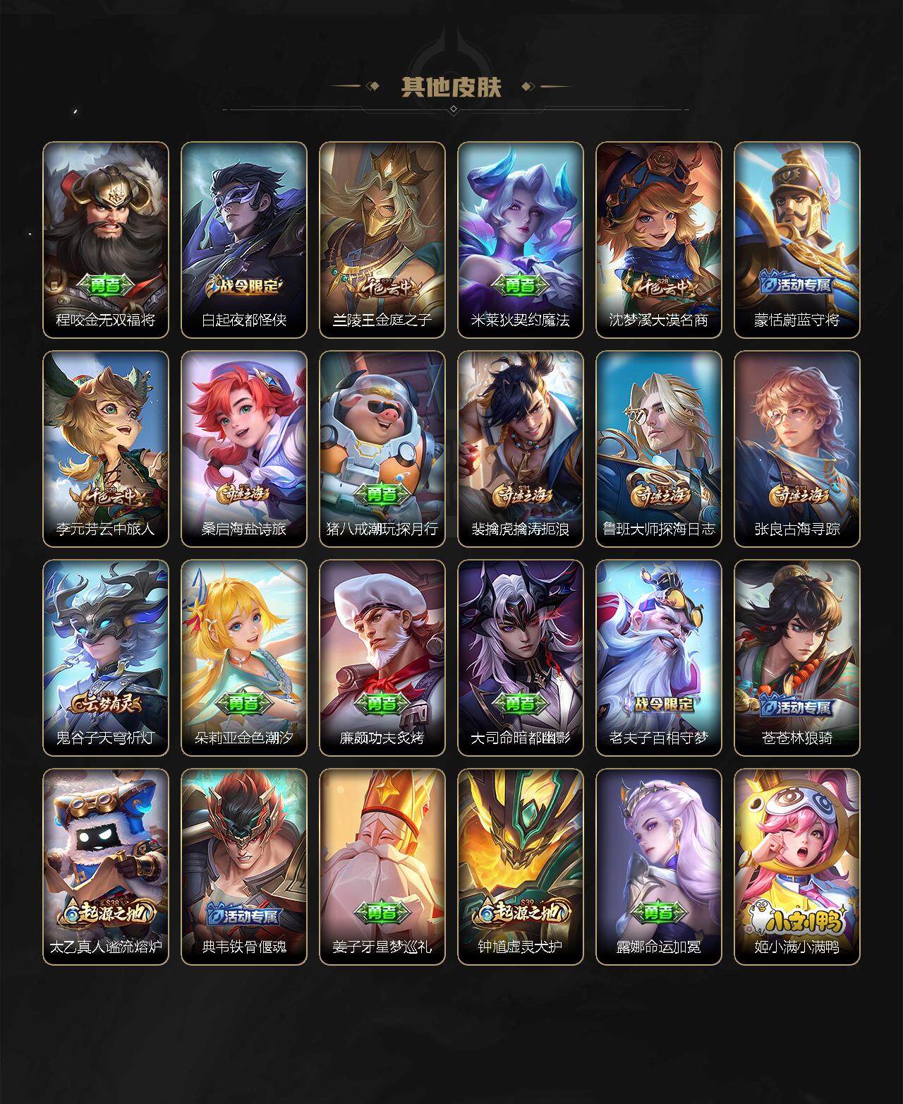 虞姬凯尔特女王,白起狰,太乙真人饕餮,曹操烛龙,芈月重明,典韦穷奇,狂铁御狮,米莱狄御霄,牛魔御旌,盾山御銮,夏侯惇朔风刀,明世隐疑决卦,老夫子醍醐杖,鬼谷子原初探秘者,狄仁杰万华元夜,程咬金演武夺筹,钟馗驱傩正仪,苏烈千军破阵,吕布猎兽之王,嬴政白昼王子,女娲朔望之晖,典韦蓝屏警告,钟馗神迹守卫,鲁班七号狮舞东方,沈梦溪星空之诺,李元芳银河之约,刘邦夺宝奇兵,元歌云间偶戏,弈星混沌棋,达摩沙漠行僧,兰陵王金庭之子,沈梦溪大漠名商,李元芳云中旅人,桑启海盐诗旅,裴擒虎擒涛扼浪,鲁班大师探海日志,张良古海寻踪