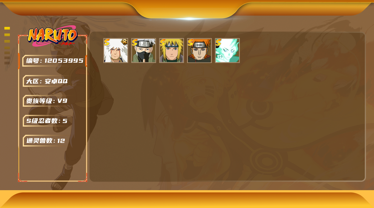 [12053995]V9 5S忍 18A忍 12通灵 326.4W战力 可二次 可修改实名 优质装备:旗木卡卡西「须佐能乎」,大筒木舍人 「最终章」 S级忍者:自来也 「舞之豪杰」,佩恩「天道」,波风水门