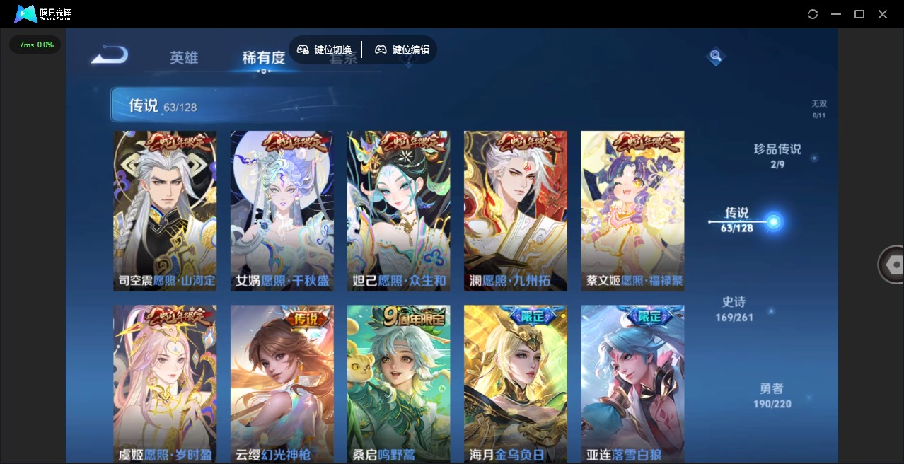 - [12170505]V9 2典藏 19传说 124英雄 248皮肤 可修改实名 优质装备:杀手不太冷,全息碎影(猴子典藏),黄金狮子座,黄金射手座,冠军飞将,云鹰飞将(小将军),久胜战神,炽阳神光,云霓雀翎,末日机甲-孙尚香(绿蚂蚱),地狱火,仲夏夜之梦(大飞蛾),地狱之眼,胖达荣荣,时之恋人-刘备(电焊工),超时空战士-狄仁杰,妄想实况 限定皮:至尊宝,白虎志(电光耗子),凤求凰(白切鸡),神威(电光马子),飞衡(韩信年限),梁祝,天狼狩猎者,李小龙,大圣娶亲,引擎之心,天魔缭乱,蜜橘之夏,神奇女侠 史诗皮:龙之律动,紫霞仙子,电玩小子(小书包),白龙吟,黄金分割率,特工魅影,千年之狐,冰冠公主,江河有灵,魅语,无限星赏官,偶像歌手,末日机甲-吕布,猫狗日记-孙策,猫狗日记-大乔,乱世虎臣,节奏热浪,女仆咖啡,摇滚巨星,水果甜心,绅士熊喵,天才门将,星夜王子,心灵骇客,功夫厨神,德古拉伯爵,暗隐猎兽者,幽灵船长,鬼剑武藏,心灵战警,舞动绿茵,纤云弄巧,缤纷独角兽,乘风破浪,逐浪之夏,水晶猎龙者,曙光守护者,箭羽风息,金属风暴,圣诞狂欢,圣诞恋歌,鹰眼统帅,暗夜贵公子,魅力维加斯,未来纪元-赵云