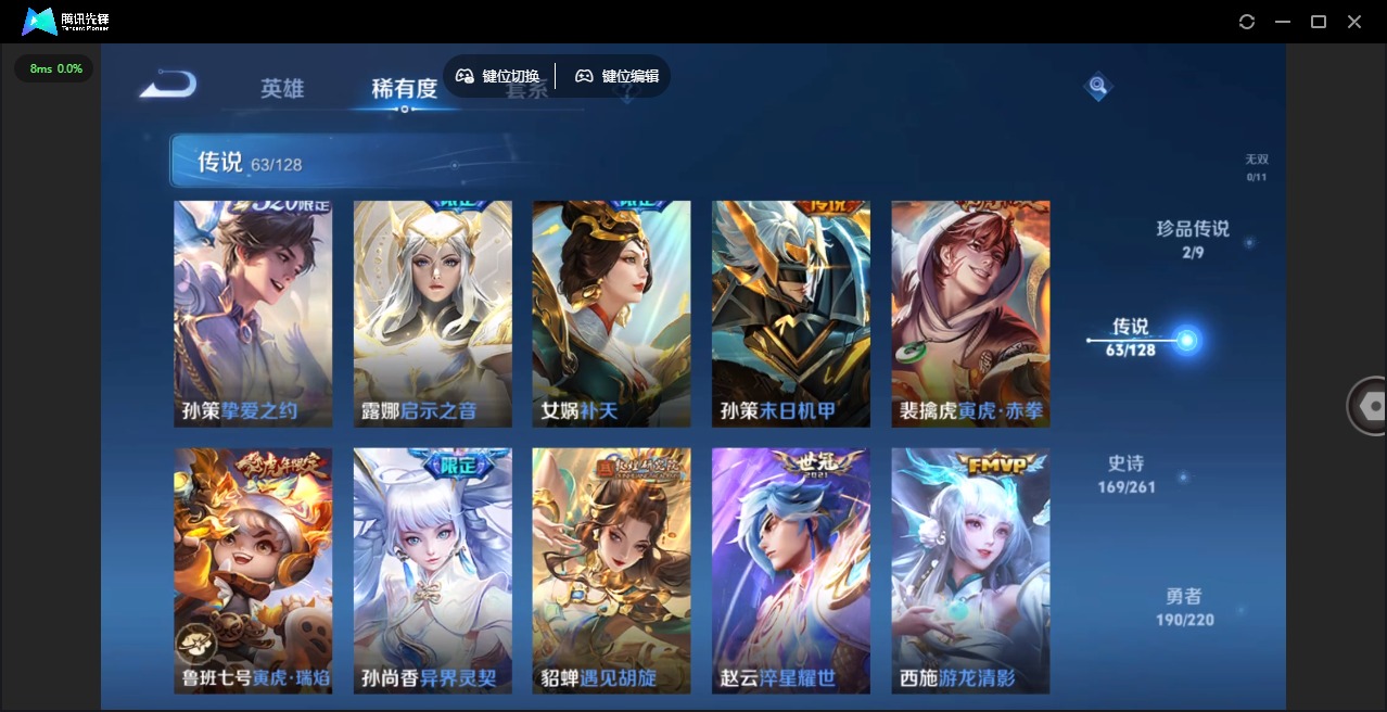 - PX_2096181-57 安卓QQ/永恒钻石/186皮肤/124英雄/1典藏/0珍品无双/0无双/2珍品传说/11传说/35史诗/9稀有英雄 【2 珍品传说】朽木白哉 暃,黑崎一护 宫本武藏, 【1 典藏皮肤】鸣剑·曳影 李白, 【11 传说皮肤】无双飞将 马超,云鹰飞将 曜,诗剑行 李白,燃星之曲 花木兰,地狱之眼 宫本武藏,鹤羽星尊 诸葛亮,战鼓燎原 典韦,超时空战士 狄仁杰,愿照·众生和