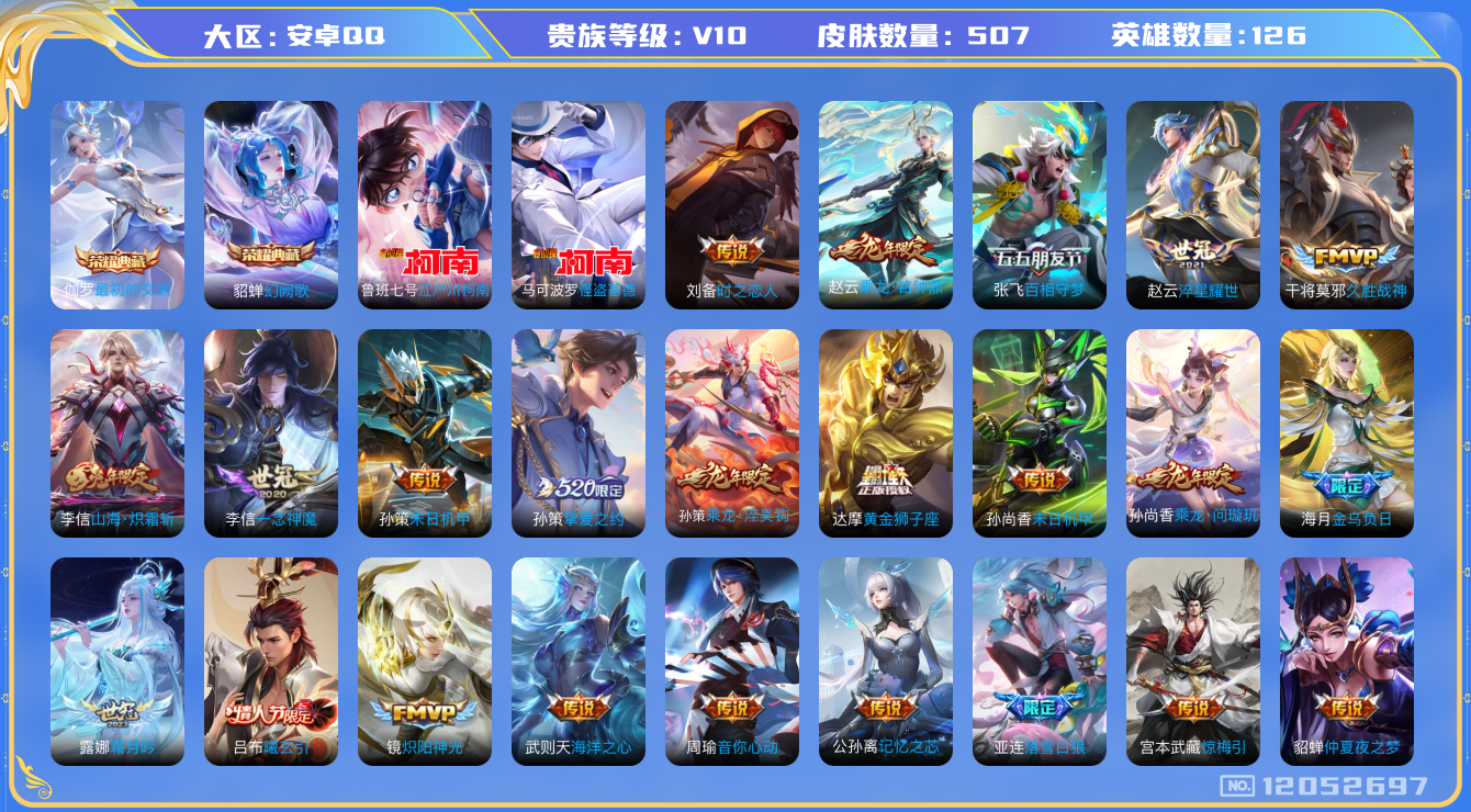 [12052697]V10 2典藏 2珍品传说 63传说 126英雄 507皮肤 典藏英雄武则天 可修改实名 优质装备:幻阙歌(貂蝉典藏),最初的交响(伽罗典藏),江户川柯南,怪盗基德,黄金狮子座,云鹰飞将(小将军),久胜战神,炽阳神光,一念神魔,云霓雀翎,末日机甲-孙尚香(绿蚂蚱),仲夏夜之梦(大飞蛾),海洋之心,飞鸢探春,音你心动-周瑜,胖达荣荣,李逍遥,时之恋人-刘备(电焊工),游龙清影(小青龙),淬星耀世,超时空战士-狄仁杰,遇见胡旋,末日机甲-孙策,挚爱之约,无双飞将,神器·狴犴令,山海·炽霜斩(李信年限),燃星之曲,浮生妄,记忆之芯(机甲兔),百相守梦(张飞),鹤归松栖(云缨),惊梅引,霜月吟,澜逐花归海,艾琳觅芳踪,琥珀纪元马超,金乌负日,涂山容容 传说皮:乘龙·问璇玑(孙尚香年限),乘龙·铭钟鼎(赵云年限),乘龙·淬吴钩(孙策年限),貂蝉曦玄引,吕布曦玄引,落雪白狼,幻光神枪 珍宝阁皮:妄想食味,女武神,玩趣恶龙 限定皮:愿照·九州拓(澜年限),愿照·福禄聚(蔡文姬年限),愿照·岁时盈(虞姬年限),愿照·山河定(司空震年限),愿照·众生和(妲己年限),愿照·千秋盛(女娲年限),陌上桑,鸣野蒿,白虎志(电光耗子),凤求凰(白切鸡),太华(伽罗年限),异界灵契(白毛香),傲雪梅枪,补天,寅虎·展翼(孙膑年限),绯月行,白晶晶,时雨天司(水龙头),神威(电光马子),飞衡(韩信年限),玄嵩(庄周年限),遇见飞天,高山流水,匿光决锋者,五谷丰年,青龙志(铠年限),冰锋战神,幽恒(沐浴露),武圣,游园惊梦,梁祝,御风骁将(吕布年限),天狼狩猎者,逐梦之星,岱宗(典韦年限),天狼溯光者,祈雪灵祝(雪兔子),天狼绘梦者,李小龙,逐梦之影,玄武志(苏烈年限),朱雀志(守约年限),永曜之星,辉光之辰,如梦令-嫦娥,如梦令-后羿,霸王别姬-项羽,霸王别姬-虞姬,孙行者,猪悟能,一生所爱,青春决赛季,蜜橘之夏,神奇女侠,匿光追影者,女儿国国王,寅虎·御盾(廉颇年限),寅虎·瑞焰(虎皮蛋子),寅虎·心曲(虎婆),寅虎·赤拳(老虎年限),时之祈愿-云中君,玉兔公主,启示之音,深海之息(深海大菠萝),山海·玄木吟(马可年限) 史诗皮:飞车小橘子,器灵·浮梦炉,灵蛊蚀心,星界战将,石田雨龙,茶境仙,怒海争锋,破空之剑,战舞者,涂山红红,东方月初,蒙犽顽岩魄,埋骨钱,芈月浮光幕影,上官婉儿群星魔术团