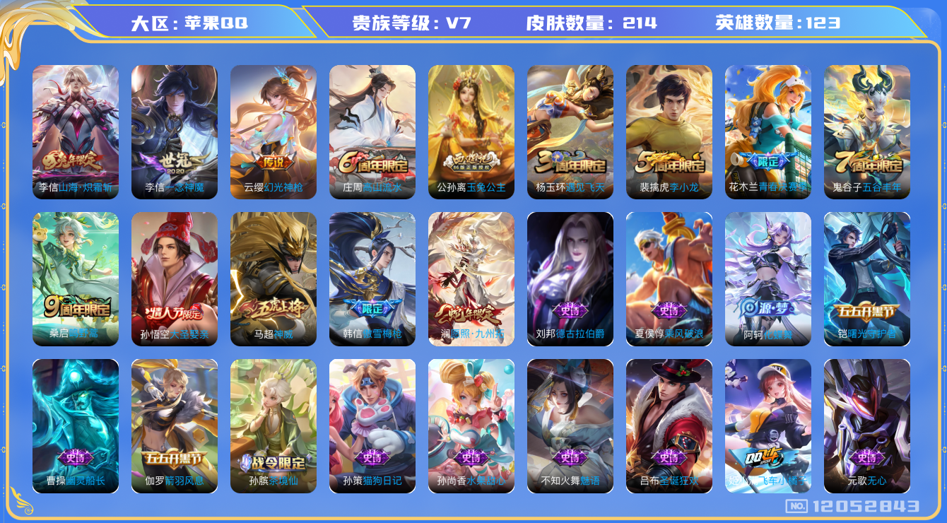 [12052843]V7 5传说 123英雄 214皮肤 可修改实名 优质装备:一念神魔,山海·炽霜斩(李信年限) 传说皮:幻光神枪 珍宝阁皮:女武神 限定皮:愿照·九州拓(澜年限),鸣野蒿,傲雪梅枪,神威(电光马子),遇见飞天,高山流水,五谷丰年,李小龙,大圣娶亲,青春决赛季,玉兔公主 史诗皮:飞车小橘子,苍鳞隐世,化蝶舞,茶境仙,百相守梦-百里守约,白龙吟,特工魅影,永昼,魅语,偶像歌手,猫狗日记-孙策,修罗,女仆咖啡,水果甜心,功夫厨神,德古拉伯爵,暗隐猎兽者,幽灵船长,鬼剑武藏,心灵战警,舞动绿茵,纤云弄巧,繁星吟游(呼啦呼啦),乘风破浪,水晶猎龙者,曙光守护者,箭羽风息,唤灵魅影,金属风暴,原初追逐者,圣诞狂欢,鹰眼统帅,魅力维加斯,赏金猎手,滕王阁序,无心