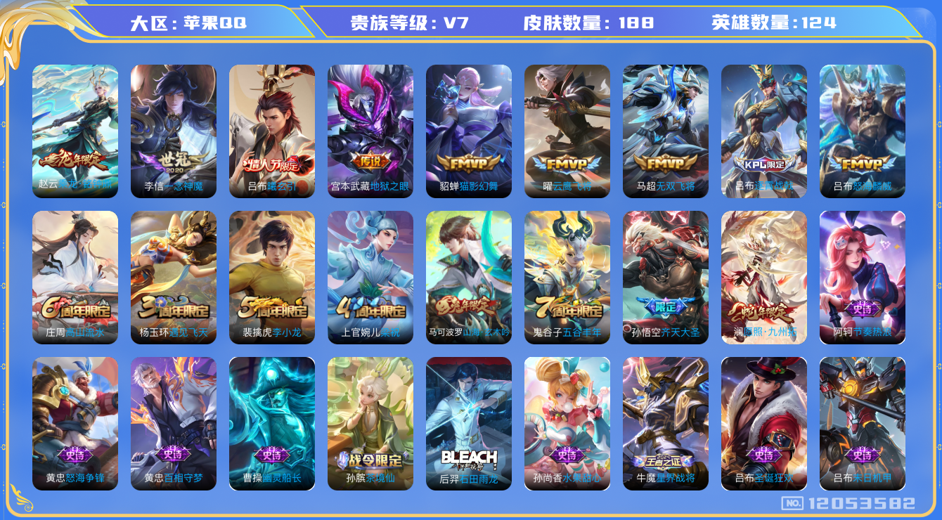 [12053582]V7 10传说 124英雄 188皮肤 可修改实名 优质装备:云鹰飞将(小将军),猫影幻舞,一念神魔,地狱之眼,无双飞将 传说皮:乘龙·铭钟鼎(赵云年限),吕布曦玄引 珍宝阁皮:妄想食味,优雅恋人 限定皮:愿照·九州拓(澜年限),逐霄战戟,遇见飞天,高山流水,齐天大圣,怒海麟威,五谷丰年,梁祝,李小龙,山海·玄木吟(马可年限) 史诗皮:灵蛊蚀心,星界战将,龙之律动,石田雨龙,茶境仙,怒海争锋,超元猎域,百相守梦-黄忠,紫霞仙子,特工魅影,末日机甲-莱西奥,百解令(蒙犽),蒙恬荣光圣徽,末日机甲-吕布,节奏热浪,修罗,女仆咖啡,摇滚巨星,水果甜心,绅士熊喵,心灵骇客,暗隐猎兽者,幽灵船长,鬼剑武藏,暗渊魔法,乐园奇幻夜,纤云弄巧,繁星吟游(呼啦呼啦),拒霜思,逐浪之夏,水晶猎龙者,金属风暴,圣诞狂欢,圣诞恋歌,鹰眼统帅,魅力维加斯,无心