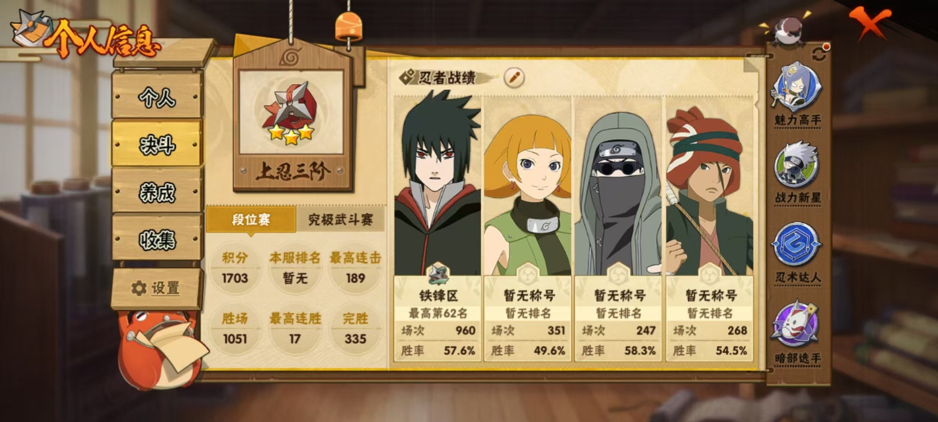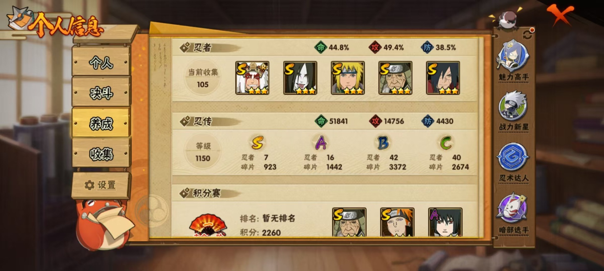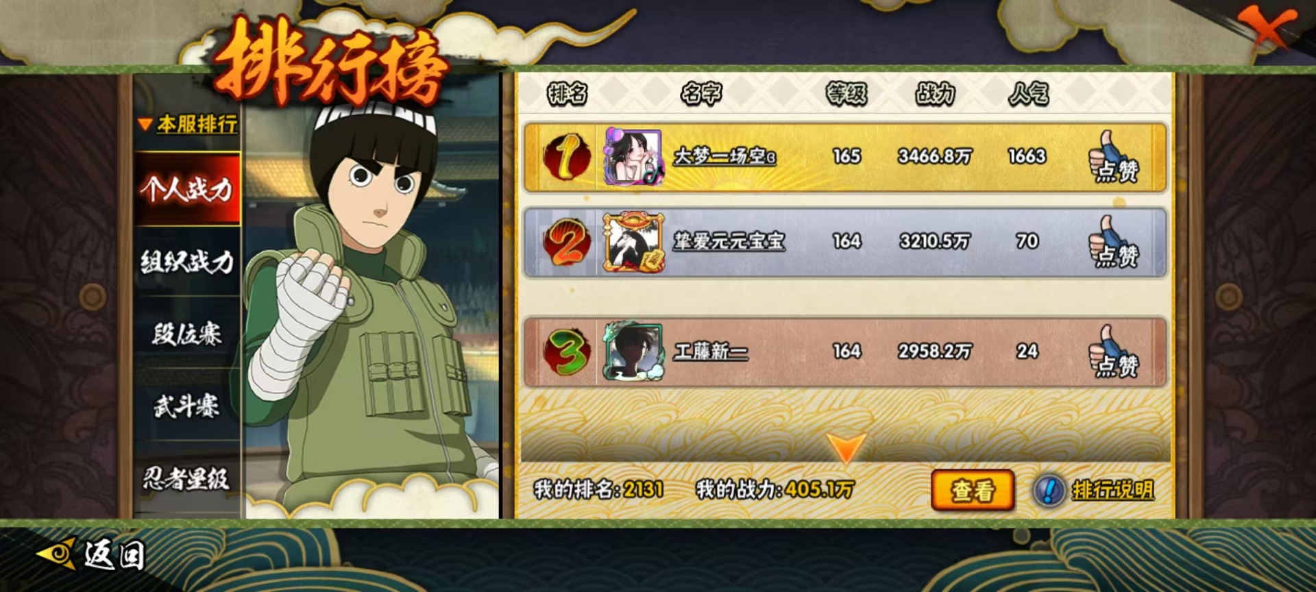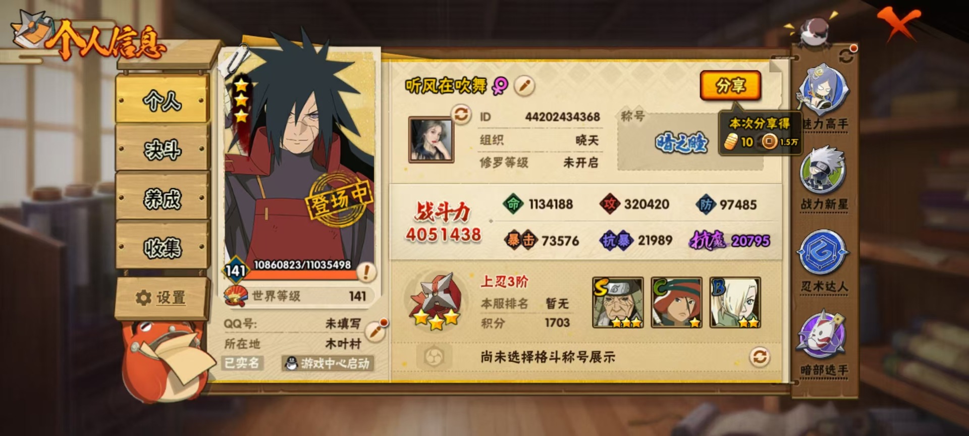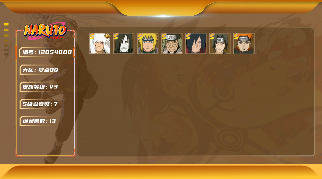 [12054000]V3 7S忍 16A忍 13通灵 405.1W战力 可二次 可修改实名 优质装备:猿飞日斩「秽土转生」,宇智波斑「秽土转生·解」 S级忍者:自来也 「舞之豪杰」,宇智波鼬 「须佐能乎」,佩恩「天道」,波风水门,大蛇丸