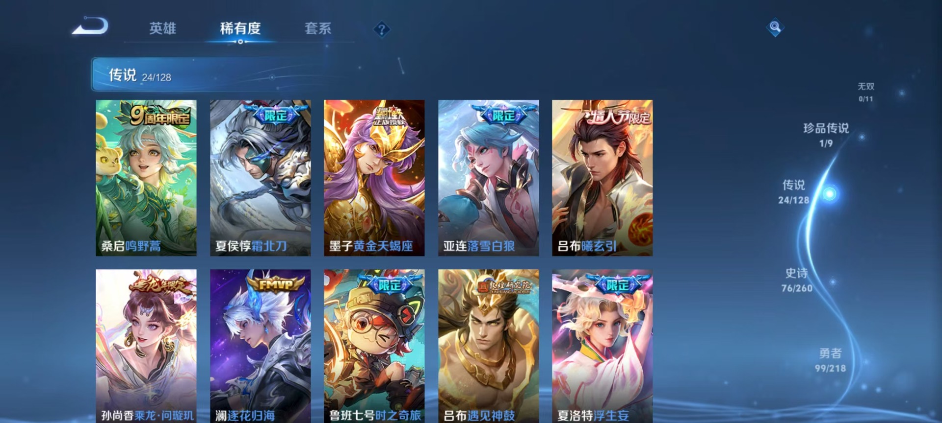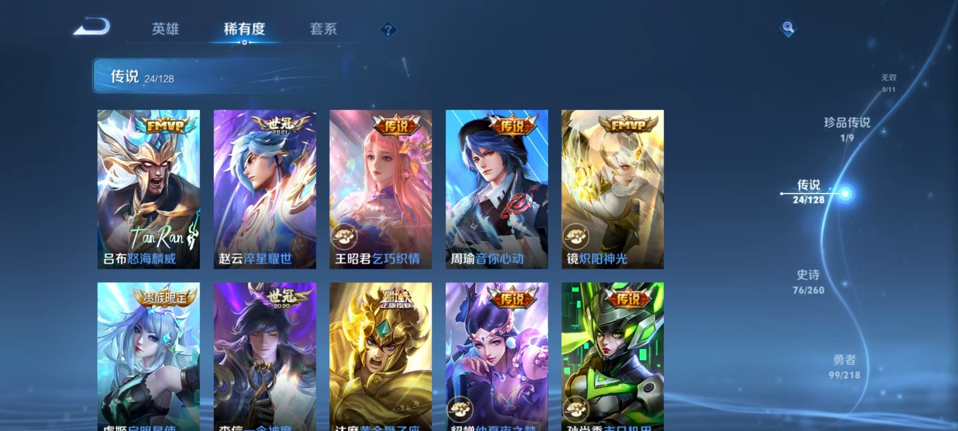 - PX_2111810-Q/最强王者/96皮肤/98英雄/0典藏/0珍品无双/0无双/1珍品传说/6传说/27史诗/4稀有英雄 【1 珍品传说】怪盗基德 马可波罗, 【6 传说皮肤】逐花归海 澜,炽阳神光 镜,霜月吟 露娜,黄金狮子座 达摩,幻光神枪 云缨,鸣野蒿 桑启, 【27 史诗皮肤】紫霞仙子 露娜,天秀·启明 杨戬,鬼剑武藏 宫本武藏,星夜王子 白起,摇滚巨星 嬴政,魅力维加斯 妲己,黄金分