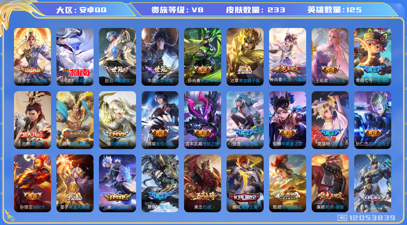 [12053839]V8 1典藏 1珍品传说 24传说 125英雄 233皮肤 可修改实名 女号 优质装备:九霄神辉(木兰典藏),怪盗基德,黄金狮子座,炽阳神光,一念神魔,末日机甲-孙尚香(绿蚂蚱),地狱火,仲夏夜之梦(大飞蛾),地狱之眼,音你心动-周瑜,乞巧织情,淬星耀世,超时空战士-狄仁杰,浮生妄,遇见神鼓,鲁班七号-时之奇旅,澜逐花归海,黄金天蝎座 传说皮:乘龙·问璇玑(孙尚香年限),吕布曦玄引,落雪白狼 珍宝阁皮:妄想食味 限定皮:逐霄战戟,鸣野蒿,夏侯惇霜北刀,遇见飞天,怒海麟威,御风骁将(吕布年限),逐梦之翼,烈魂,默契交锋-花木兰,天魔缭乱,女儿国国王,寅虎·御盾(廉颇年限),玉兔公主,山海·玄木吟(马可年限) 史诗皮:鸭鸭历险记-刘禅,苍鳞隐世,器灵·浮梦炉,糖绘人间,星界战将,龙之律动,石田雨龙,怒海争锋,炽弈燎原,撼地雄心,破空之剑,战舞者,蒙犽顽岩魄,芈月浮光幕影,琥珀纪元伽罗,蔬乡物语(鲁班七号),百相守梦-百里守约,百相守梦-黄忠,电玩小子(小书包),特工魅影,永昼,江河有灵,匿光侦查者,雪夜绮愿(周瑜),浮梦罗烟,魅语,百解令(蒙犽),高渐离燃音魔法,蒙恬荣光圣徽,冰冠公主,青蛇,偶像歌手,末日机甲-吕布,猫狗日记-孙策,节奏热浪,修罗,女仆咖啡,摇滚巨星,水果甜心,星夜王子,心灵骇客,功夫厨神,德古拉伯爵,暗隐猎兽者,鬼剑武藏,心灵战警,乐园奇幻夜,天秀·启明,地狱岩魂,纤云弄巧,拒霜思,逐浪之夏,水晶猎龙者,曙光守护者,金属风暴,圣诞狂欢,鹰眼统帅,雪上飞焰,寅虎·御盾