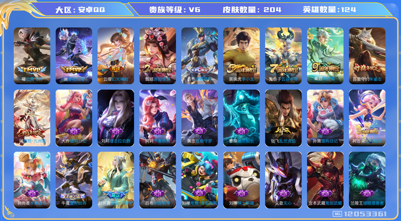 [12053361]V6 5传说 124英雄 204皮肤 可修改实名 优质装备:云鹰飞将(小将军),澜逐花归海 传说皮:幻光神枪 珍宝阁皮:妄想食味,万物之道,玩趣恶龙 限定皮:愿照·九州拓(澜年限),逐霄战戟,鸣野蒿,五谷丰年,游园惊梦,李小龙,朱雀志(守约年限) 史诗皮:器灵·浮梦炉,星界战将,谪仙醉月,龙之律动,破空之剑,百相守梦-黄忠,特工魅影,江河有灵,百解令(蒙犽),蒙恬荣光圣徽,偶像歌手,电玩·爆裂旋风,末日机甲-吕布,猫狗日记-孙策,猫狗日记-大乔,乱世虎臣,节奏热浪,修罗,女仆咖啡,摇滚巨星,水果甜心,绅士熊喵,星夜王子,功夫厨神,德古拉伯爵,暗隐猎兽者,幽灵船长,鬼剑武藏,心灵战警,舞动绿茵,逐浪之夏,水晶猎龙者,金属风暴,鹰眼统帅,魅力维加斯,黎明之约,无心,未来纪元-赵云