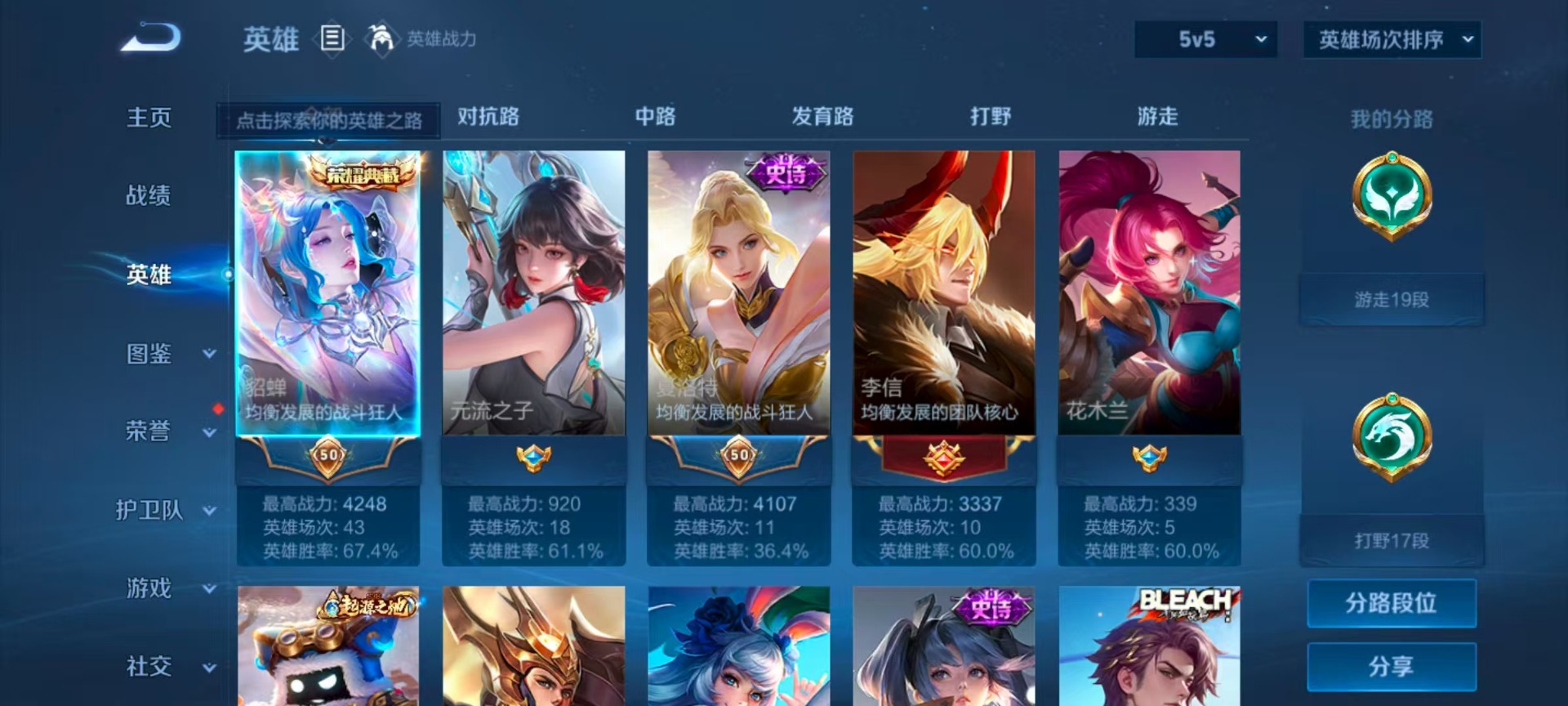 - PX_2089073- 包人脸 V6 贵族积分14002 安卓QQ/58皮肤/75英雄/0典藏/0珍品无双/0无双/1珍品传说/8传说/15史诗/4稀有英雄 【1 珍品传说】,黑崎一护 宫本武藏, 【8 传说皮肤】,逐花归海 澜,浮生妄 夏洛特,炽阳神光 镜,战鼓燎原 典韦,愿照·九州拓 澜,幻光神枪 云缨,愿照·山河定 司空震,云诺千山 公孙离, 【15 史诗皮肤】,苍穹之光 项羽,魅力维加斯