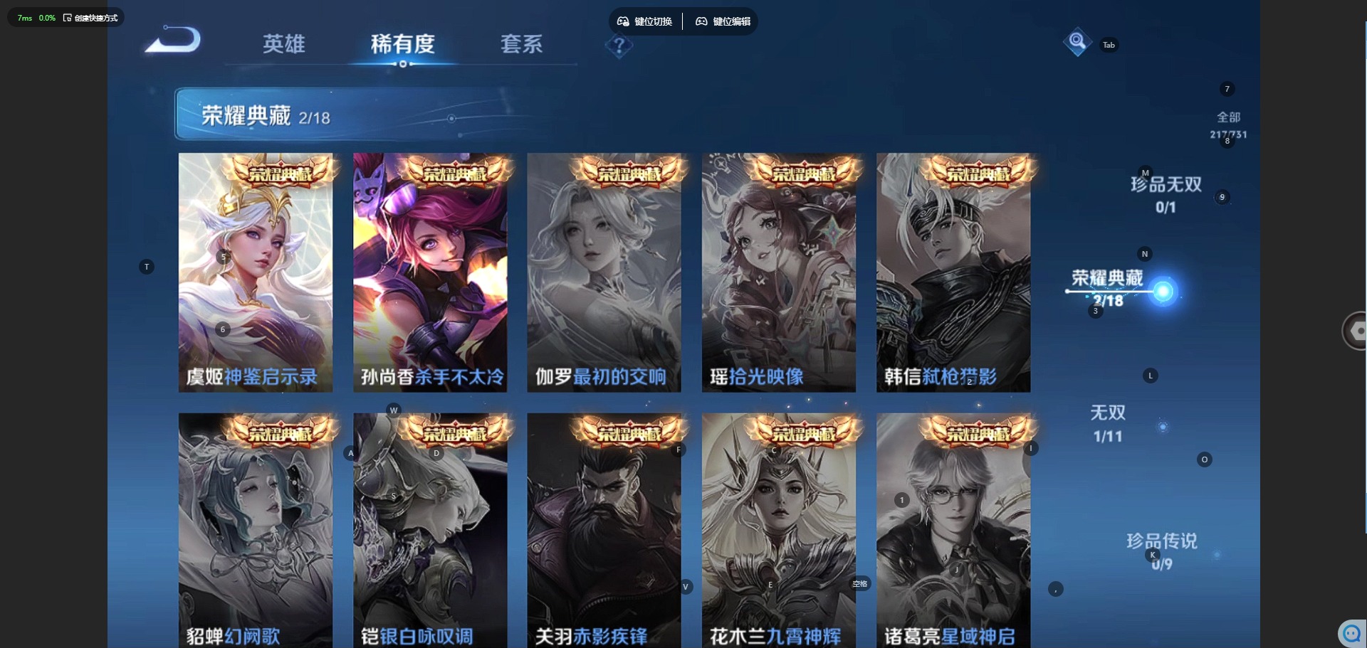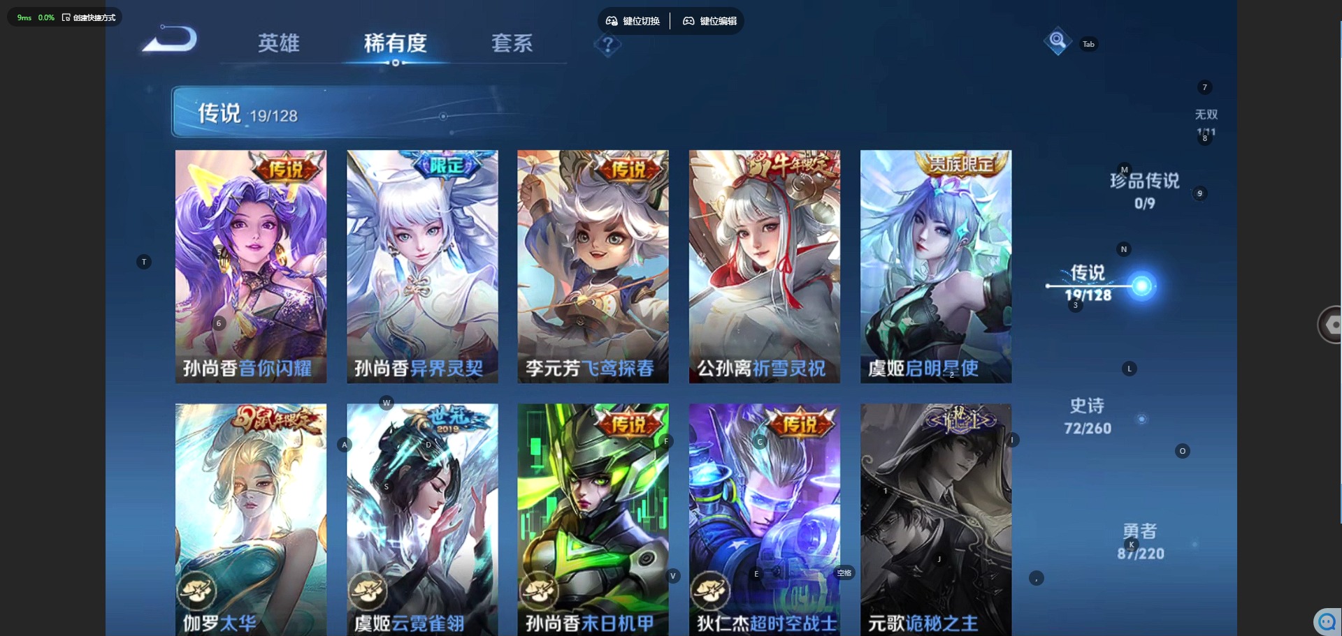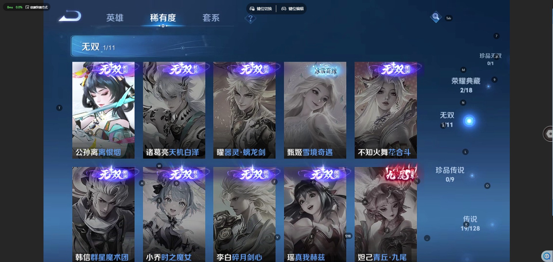 - [11744059]V7 1无双 2传说 122英雄 132皮肤 可修改实名 优质装备:器灵·螭龙剑,零号·赤焰 珍宝阁皮:妄想食味,蔷薇恋人 限定皮:愿照·九州拓(澜年限),高山流水,五谷丰年,游园惊梦,李小龙,默契交锋-花木兰,大圣娶亲 史诗皮:特工魅影,晚萤,猫狗日记-孙策,乱世虎臣,节奏热浪,修罗,女仆咖啡,水果甜心,星夜王子,暗隐猎兽者,鬼剑武藏,纤云弄巧,繁星吟游(呼啦呼啦),缤纷独角兽,乘风破浪,金属风暴,鹰眼统帅,魅力维加斯,黎明之约