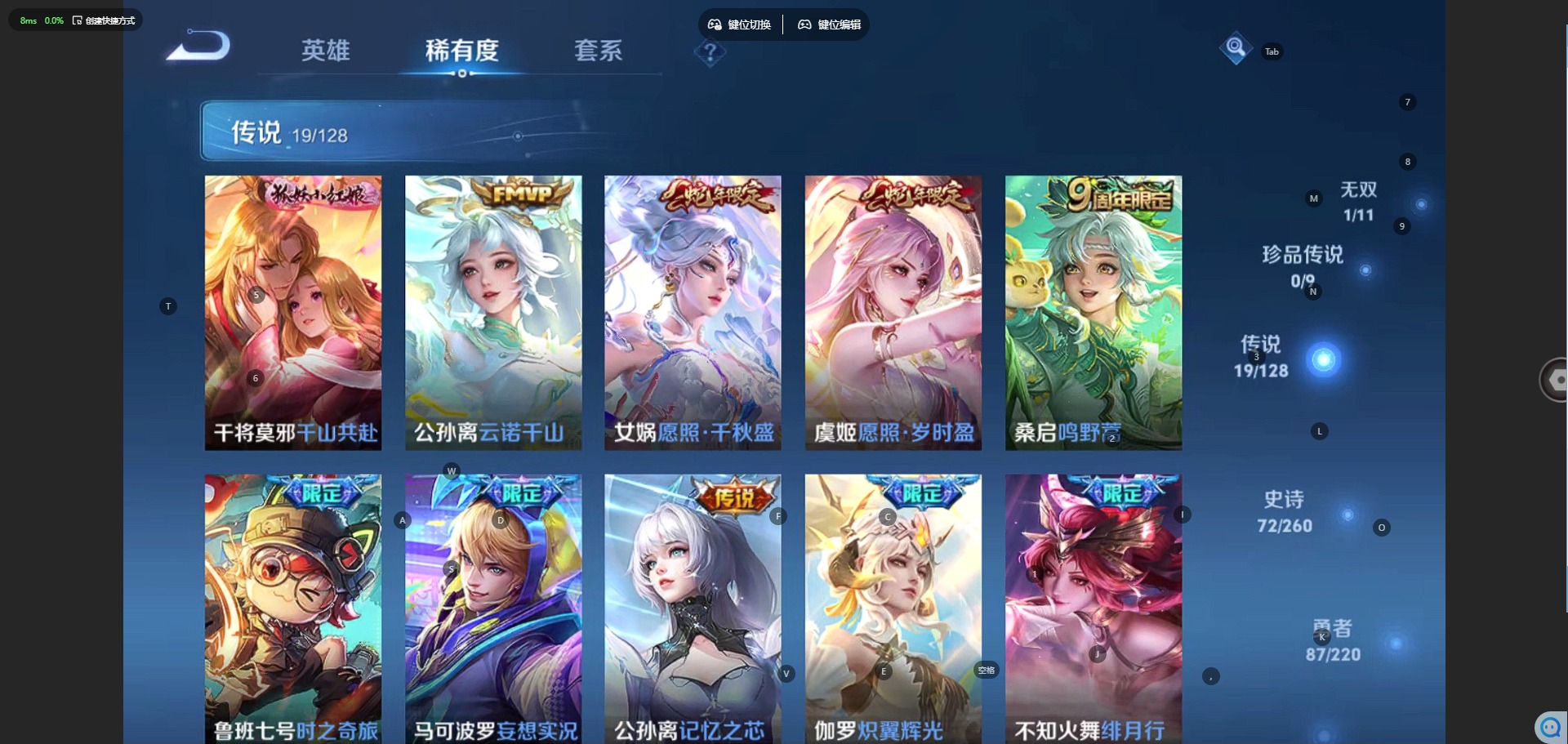 - 安卓QQ 可二次 贵族8 段位至尊星耀IV 皮肤价值160228 英雄数量124 皮肤数量222 荣耀水晶1 传说皮肤11 珍品0 限定皮肤25 无双皮肤0 内测2 赛季皮肤23 史诗皮肤28 普通皮肤22 其他226