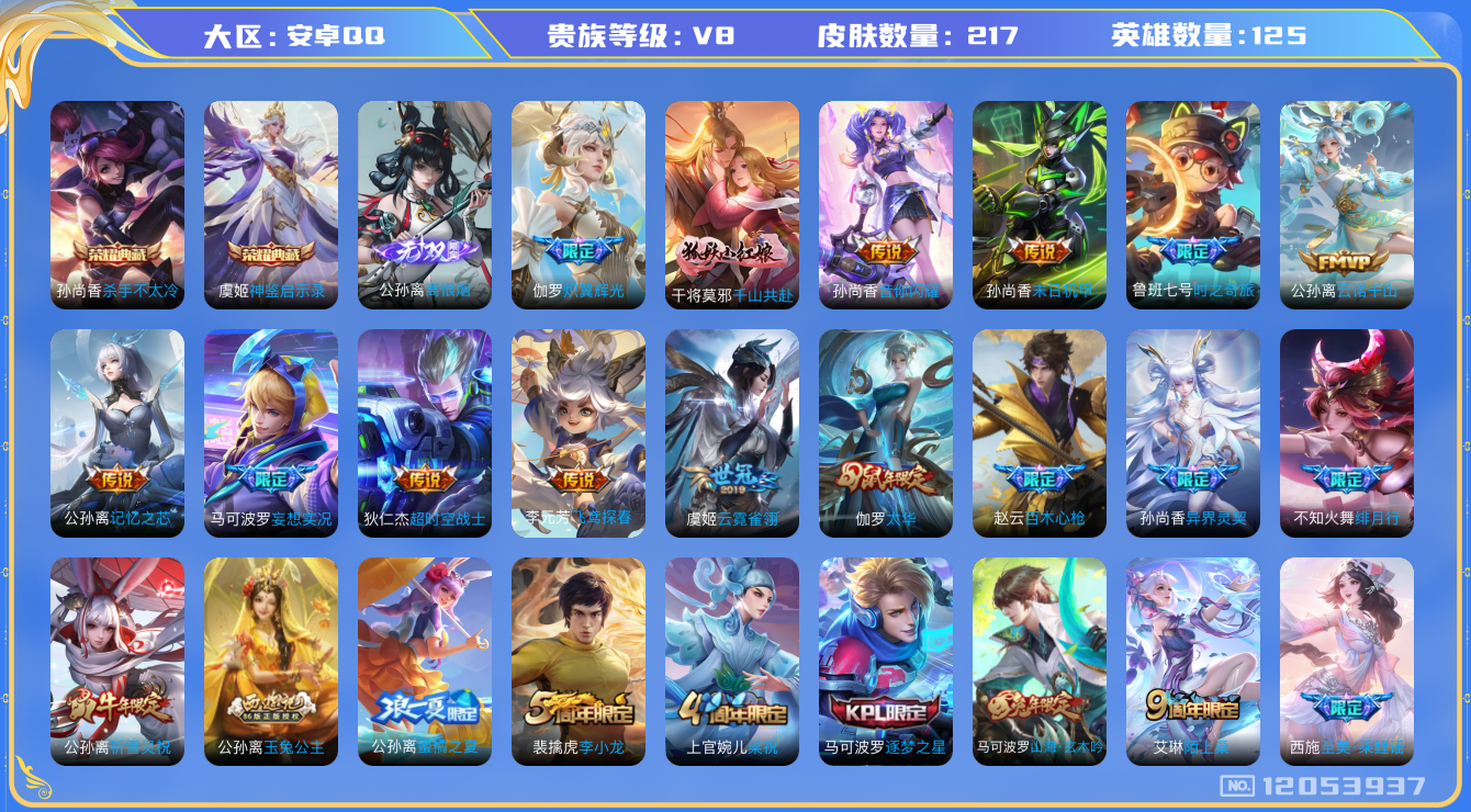 [12053937]V8 2典藏 1无双 19传说 125英雄 217皮肤 可修改实名 优质装备:杀手不太冷,神鉴启示录,离恨烟(公孙离无双),云霓雀翎,末日机甲-孙尚香(绿蚂蚱),飞鸢探春,超时空战士-狄仁杰,音你闪耀(rap皮),炽翼辉光(娃娃菜牛角包),记忆之芯(机甲兔),妄想实况,鲁班七号-时之奇旅,千山共赴,涂山容容 传说皮:云诺千山 珍宝阁皮:女武神 限定皮:愿照·岁时盈(虞姬年限),愿照·千秋盛(女娲年限),陌上桑,鸣野蒿,太华(伽罗年限),异界灵契(白毛香),绯月行,至美·乘鲤谣,冰锋战神,梁祝,逐梦之星,祈雪灵祝(雪兔子),李小龙,蜜橘之夏,百木心枪,玉兔公主,山海·玄木吟(马可年限) 史诗皮:赞萌露比,鸭鸭历险记-刘禅,绮世丹青,化蝶舞,星界战将,谪仙醉月,龙之律动,雪豹·霜爪,石田雨龙,百相守梦-周瑜,茶境仙,炽弈燎原,撼地雄心,破空之剑,蒙犽顽岩魄,芈月浮光幕影,百相守梦-百里守约,百相守梦-黄忠,织梦人,守夜人,电玩小子(小书包),黄金分割率,末日机甲-莱西奥,魅语,无限星赏官,冰冠公主,偶像歌手,末日机甲-吕布,乱世虎臣,女仆咖啡,摇滚巨星,水果甜心,天才门将,星夜王子,鬼剑武藏,心灵战警,地狱岩魂,纤云弄巧,拒霜思,缤纷独角兽,逐浪之夏,箭羽风息,金属风暴,圣诞狂欢,圣诞恋歌,鹰眼统帅,暗夜贵公子,魅力维加斯,黎明之约,奇遇舞章
