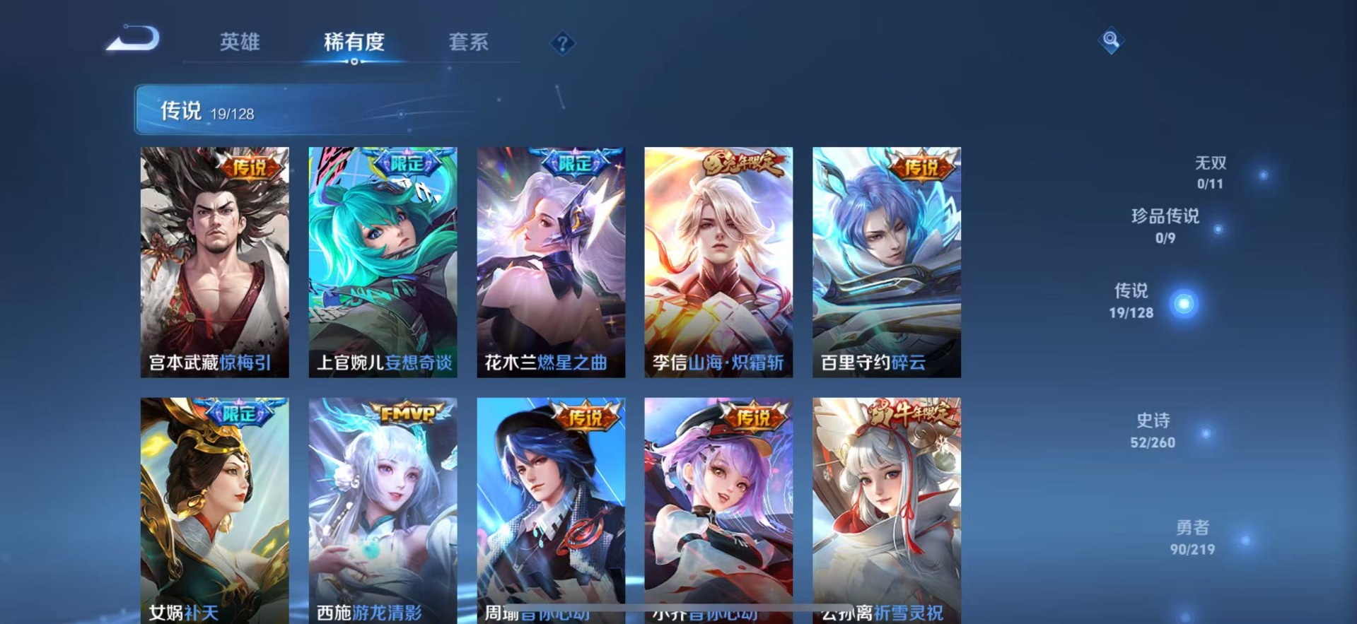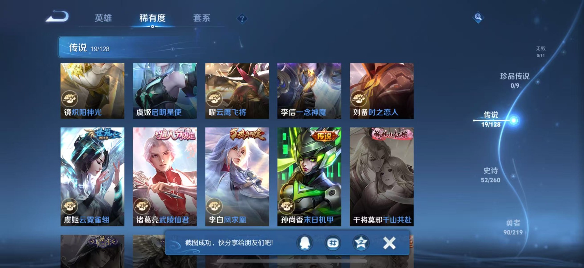 - [11966735]V4 1典藏 2传说 122英雄 126皮肤 可修改实名 优质装备:弑枪猎影(韩信典藏) 传说皮:幻光神枪 珍宝阁皮:蔷薇恋人 限定皮:逐霄战戟,鸣野蒿,五谷丰年,游园惊梦,孙行者 史诗皮:百相守梦-黄忠,紫霞仙子,千年之狐,江河有灵,百解令(蒙犽),电玩·爆裂旋风,末日机甲-吕布,乱世虎臣,节奏热浪,女仆咖啡,水果甜心,天才门将,德古拉伯爵,暗隐猎兽者,鬼剑武藏,乘风破浪,水晶猎龙者,金属风暴,圣诞恋歌,鹰眼统帅,魅力维加斯,无心,未来纪元-赵云