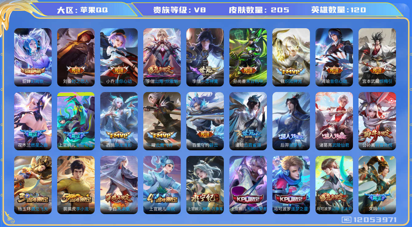 [12053971]V8 1典藏 19传说 120英雄 205皮肤 可修改实名 优质装备:幻阙歌(貂蝉典藏),云鹰飞将(小将军),炽阳神光,一念神魔,云霓雀翎,末日机甲-孙尚香(绿蚂蚱),音你心动-小乔,音你心动-周瑜,时之恋人-刘备(电焊工),游龙清影(小青龙),碎云,山海·炽霜斩(李信年限),燃星之曲,妄想奇谈,惊梅引 珍宝阁皮:优雅恋人,女武神 限定皮:至尊宝,凤求凰(白切鸡),武陵仙君(小桃花),傲雪梅枪,补天,神威(电光马子),遇见飞天,梁祝,逐梦之星,祈雪灵祝(雪兔子),天狼绘梦者,李小龙,如梦令-后羿,神器·万象笔,山海·玄木吟(马可年限) 史诗皮:紫霞仙子,白龙吟,黄金分割率,特工魅影,千年之狐,永昼,江河有灵,魅语,蒙恬荣光圣徽,冰冠公主,偶像歌手,晚萤,龙骑士(小龙虾),末日机甲-吕布,时之恋人-孙尚香,修罗,水果甜心,星夜王子,暗隐猎兽者,鬼剑武藏,纤云弄巧,缤纷独角兽,逐浪之夏,箭羽风息,金属风暴,原初追逐者,圣诞恋歌,鹰眼统帅,魅力维加斯,黎明之约,赏金猎手