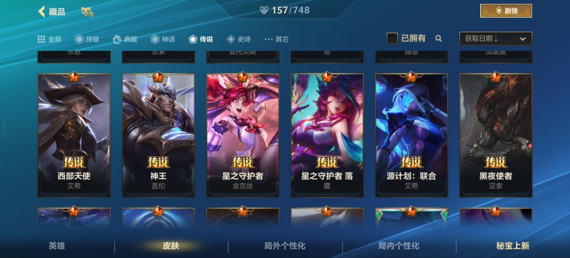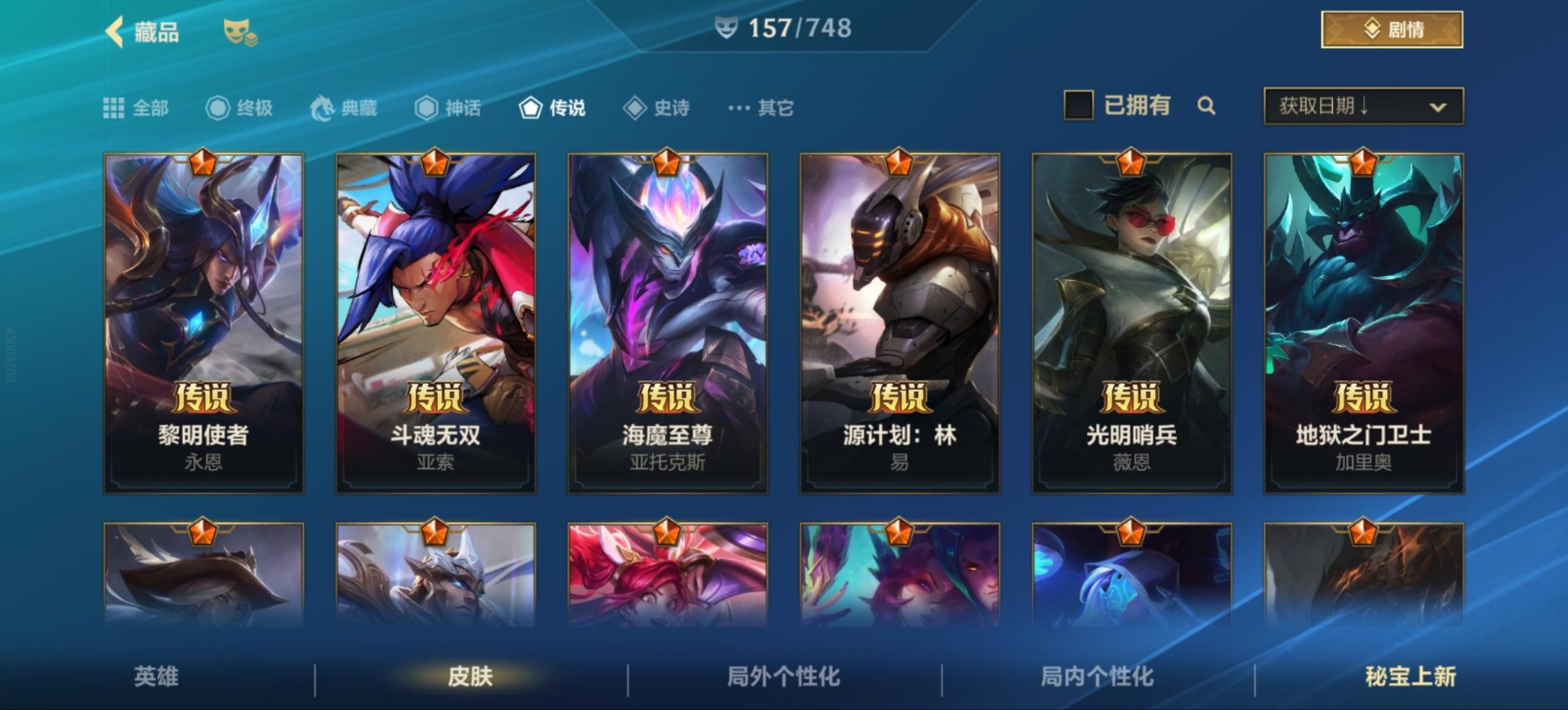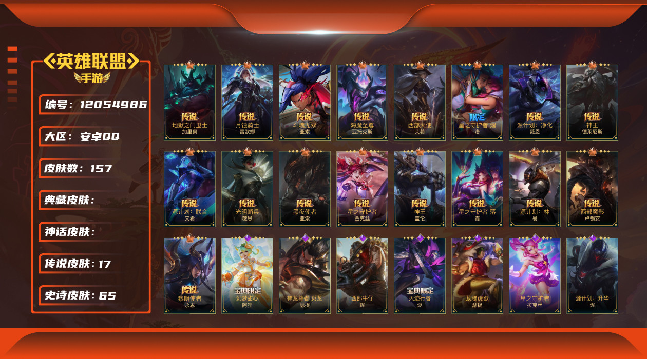 [12054986]17传说 65史诗 157皮肤 可二次 可修改实名 优质装备:光明哨兵薇恩,黑夜使者亚索,神王盖伦,神王诺手,西部魔影卢锡安,西部天使寒冰,星之守护者金克丝,星之守护者 落,星之守护者 熠,源计划:净化,源计划:联合,月蚀骑士蕾欧娜,玉剑传说 武剑仙,源计划:林,喵喵魅影金克丝 段位:翡翠 限定皮肤:星之守护者霞,星之守护者洛,山海绘卷泰坦,山海绘卷狗熊 传说皮:斗魂无双亚索,海魔至尊 亚托克斯,地狱之门卫士,黎明使者永恩