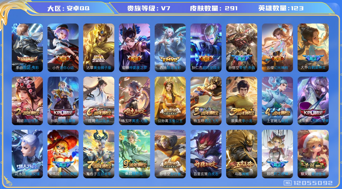 [12055092]V7 1典藏 9传说 123英雄 291皮肤 可修改实名 优质装备:鸣剑·曳影,黄金狮子座,仲夏夜之梦(大飞蛾),音你心动-小乔,零号·赤焰,游龙清影(小青龙),超时空战士-狄仁杰,涂山容容 传说皮:幻光神枪 珍宝阁皮:万物之道,蔷薇恋人,女武神 限定皮:鸣野蒿,白虎志(电光耗子),时之彼端,白鹤梁神女,魔法小厨娘,神威(电光马子),遇见飞天,高山流水,五谷丰年,天狼运算者,游园惊梦,梁祝,天狼绘梦者,李小龙,奇迹圣诞,默契交锋-花木兰,孙行者,寅虎·心曲(虎婆),玉兔公主 史诗皮:鸭鸭历险记-刘禅,器灵·浮梦炉,龙之律动,石田雨龙,破空之剑,百相守梦-黄忠,遇见神鹿,紫霞仙子,白龙吟,黄金分割率,特工魅影,千年之狐,江河有灵,高渐离燃音魔法,无限星赏官,偶像歌手,晚萤,末日机甲-吕布,猫狗日记-孙策,猫狗日记-大乔,时之恋人-孙尚香,节奏热浪,修罗,女仆咖啡,摇滚巨星,水果甜心,绅士熊喵,天才门将,星夜王子,心灵骇客,时之奇旅-安琪拉,功夫厨神,德古拉伯爵,暗隐猎兽者,幽灵船长,鬼剑武藏,暗渊魔法,心灵战警,天秀·启明,舞动绿茵,地狱岩魂,诗语江南,纤云弄巧,繁星吟游(呼啦呼啦),拒霜思,缤纷独角兽,乘风破浪,逐浪之夏,月团寄思,水晶猎龙者,曙光守护者,箭羽风息,金属风暴,原初追逐者,圣诞狂欢,圣诞恋歌,鹰眼统帅,暗夜贵公子,魅力维加斯,雪上飞焰,无心,未来纪元-赵云