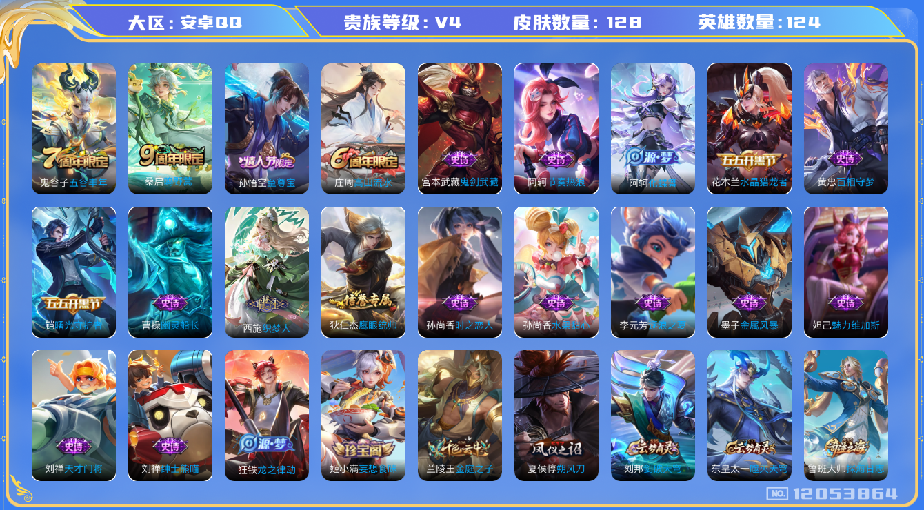 [12053864]V4 1传说 124英雄 128皮肤 可修改实名 珍宝阁皮:妄想食味 限定皮:鸣野蒿,至尊宝,高山流水,五谷丰年 史诗皮:化蝶舞,龙之律动,百相守梦-黄忠,织梦人,时之恋人-孙尚香,节奏热浪,水果甜心,绅士熊喵,天才门将,幽灵船长,鬼剑武藏,逐浪之夏,水晶猎龙者,曙光守护者,金属风暴,鹰眼统帅,魅力维加斯