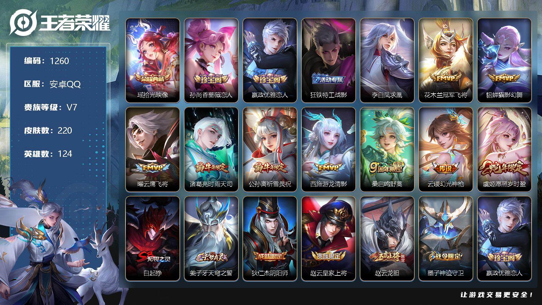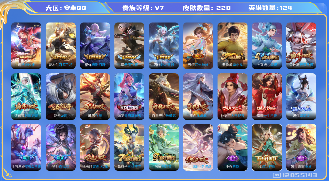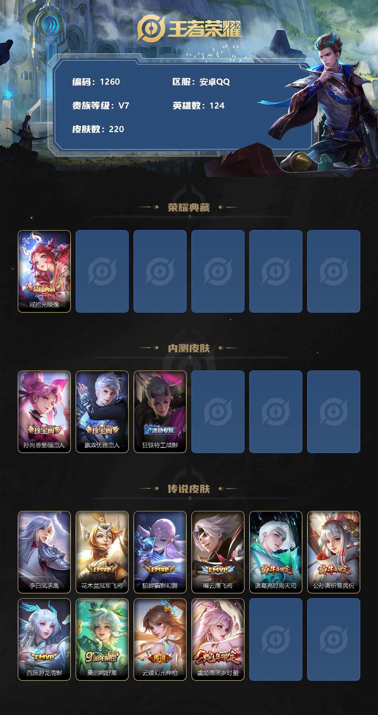 [12055143]【商品标题】:安卓Q-V7-永恒钻石I段位-124英雄-220皮肤-1典藏-0珍品无双-0无双-0珍品传说-10传说-63史诗