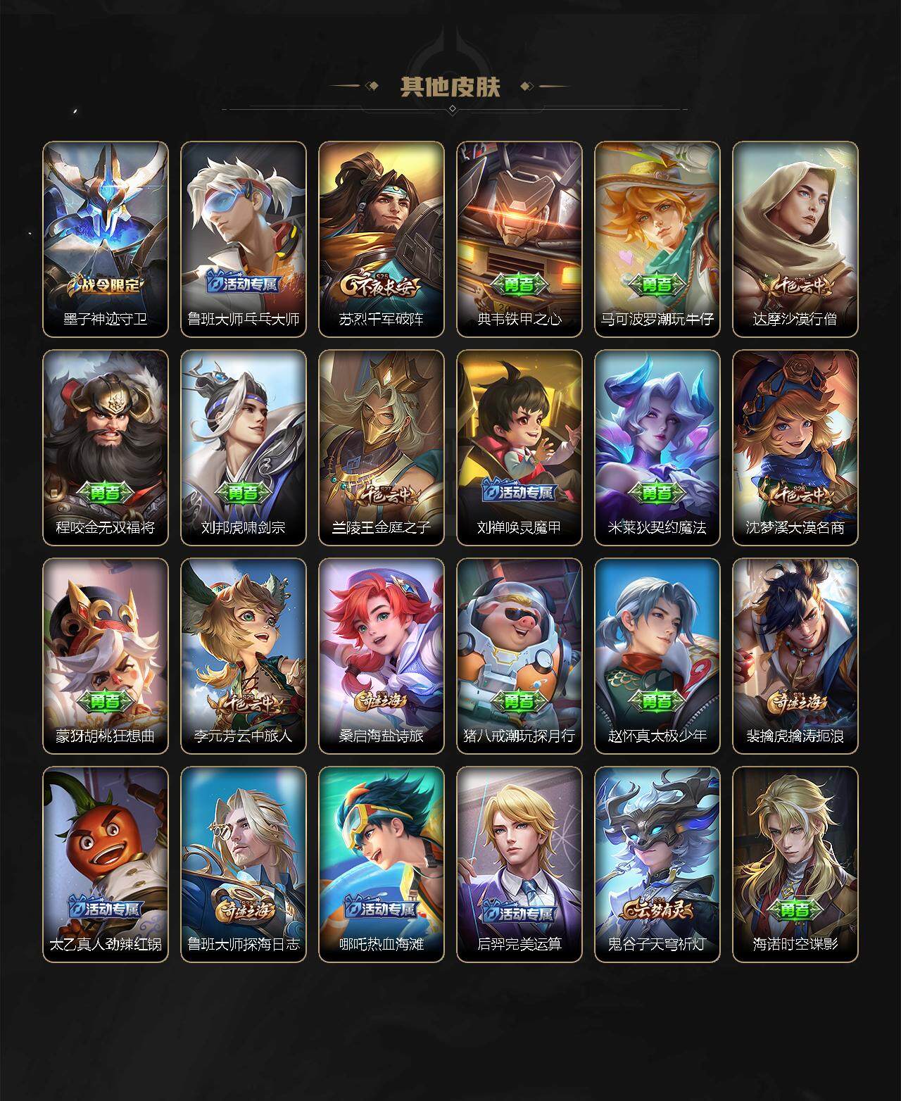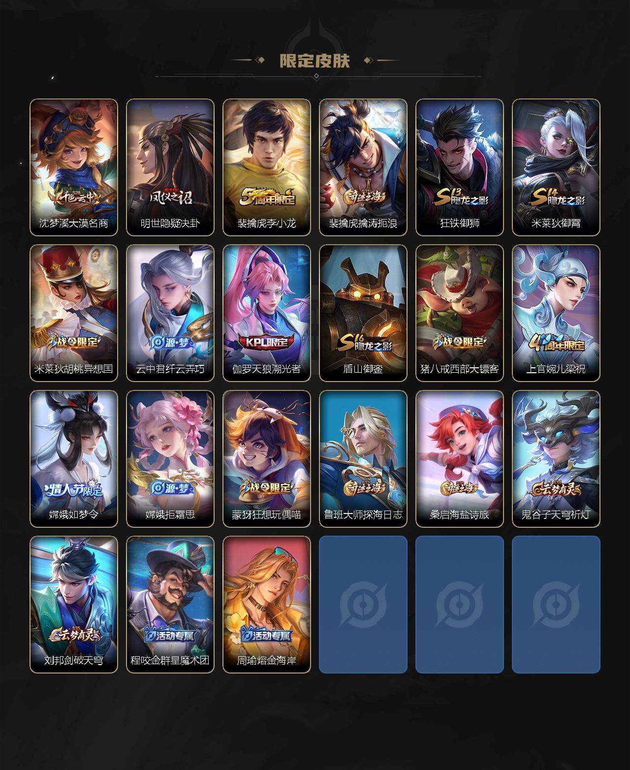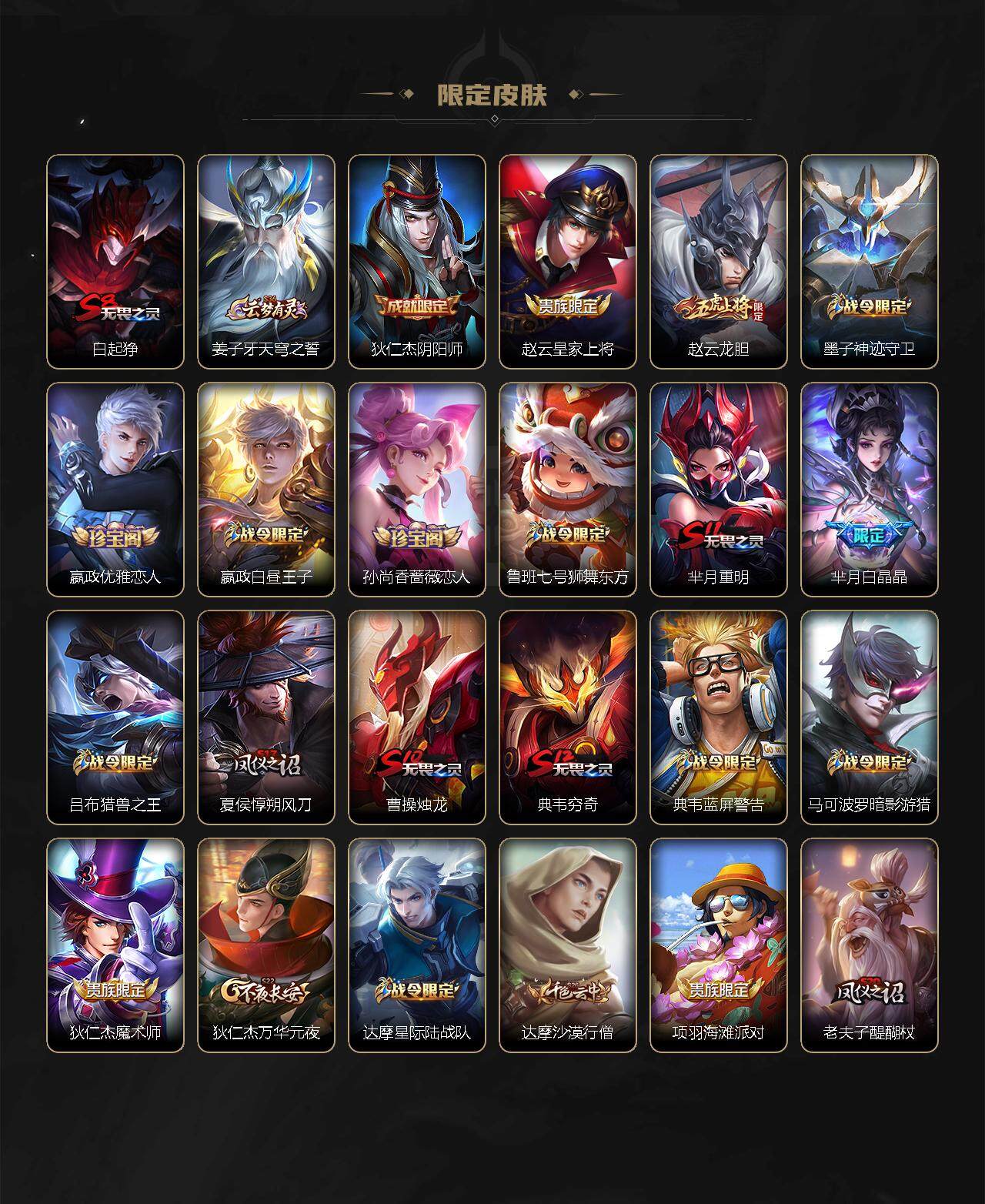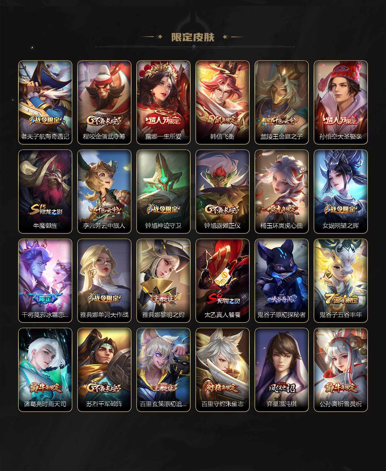 【限定皮肤】:白起狰,姜子牙天穹之誓,狄仁杰阴阳师,赵云皇家上将,赵云龙胆,墨子神迹守卫,嬴政优雅恋人,嬴政白昼王子,孙尚香蔷薇恋人,鲁班七号狮舞东方,芈月重明,芈月白晶晶,吕布猎兽之王,夏侯惇朔风刀,曹操烛龙,典韦穷奇,典韦蓝屏警告,马可波罗暗影游猎,狄仁杰魔术师,狄仁杰万华元夜,达摩星际陆战队,达摩沙漠行僧,项羽海滩派对,老夫子醍醐杖,老夫子航海奇遇记,程咬金演武夺筹,露娜一生所爱,韩信飞衡,兰陵王金庭之子,孙悟空大圣娶亲,牛魔御旌,李元芳云中旅人,钟馗神迹守卫,钟馗驱傩正仪,杨玉环寅虎心曲,女娲朔望之晖,干将莫邪冰霜恋舞曲,雅典娜单词大作战,雅典娜黎明之约,太乙真人饕餮,鬼谷子原初探秘者,鬼谷子五谷丰年,诸葛亮时雨天司,苏烈千军破阵,百里玄策原初追逐者,百里守约朱雀志,弈星混沌棋,公孙离祈雪灵祝,沈梦溪大漠名商,明世隐疑决卦,裴擒虎李小龙,裴擒虎擒涛扼浪,狂铁御狮,米莱狄御霄,米莱狄胡桃异想国,云中君纤云弄巧,伽罗天狼溯光者,盾山御銮,猪八戒西部大镖客,上官婉儿梁祝,嫦娥如梦令,嫦娥拒霜思,蒙犽狂想玩偶喵,鲁班大师探海日志,桑启海盐诗旅,鬼谷子天穹祈灯,刘邦剑破天穹,程咬金群星魔术团,周瑜熔金海岸