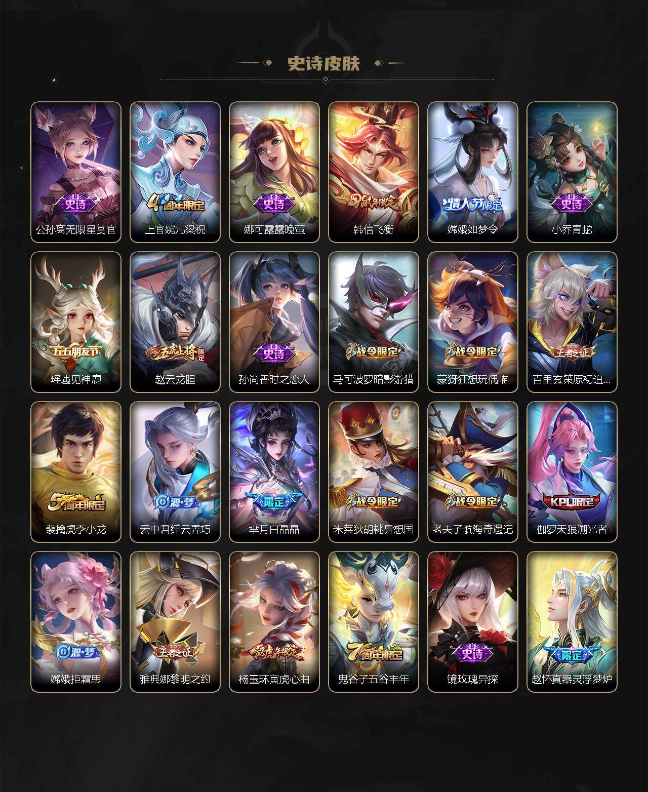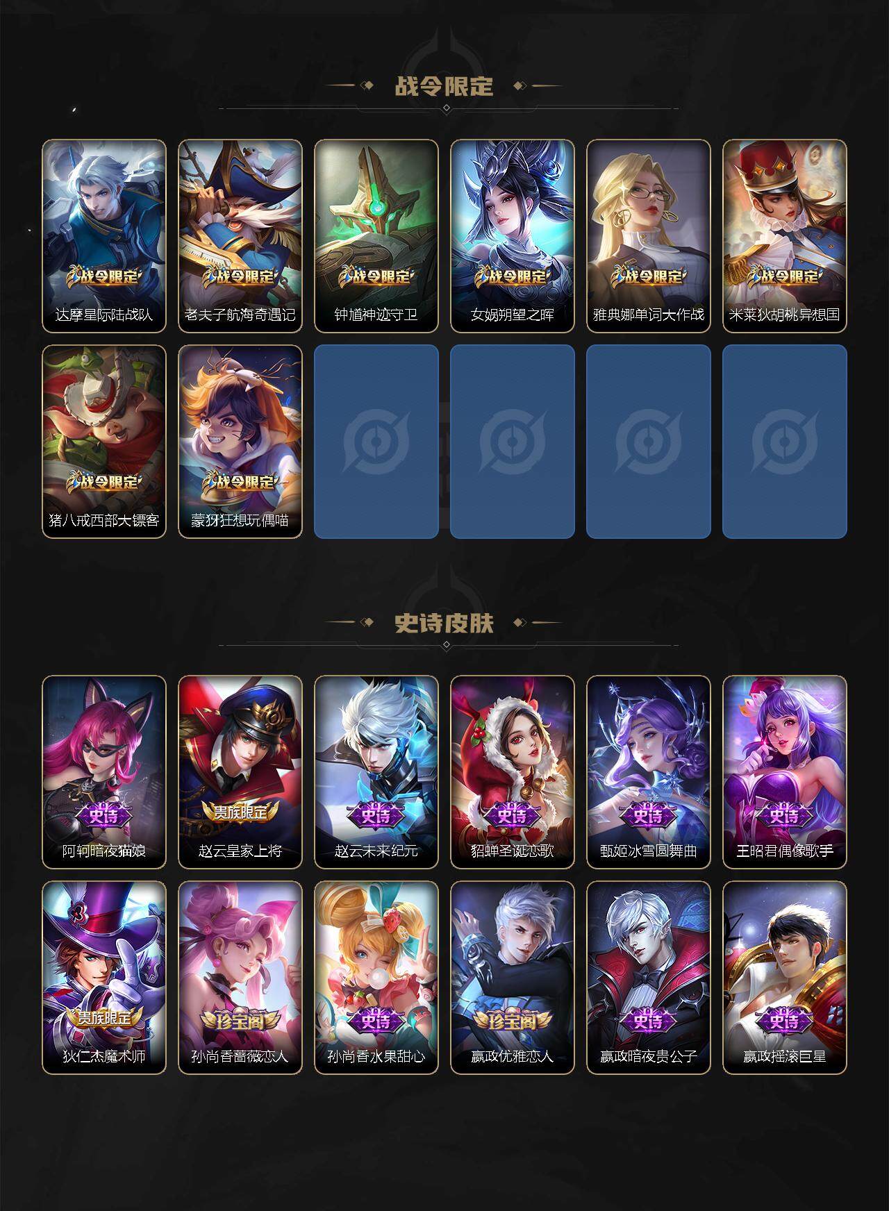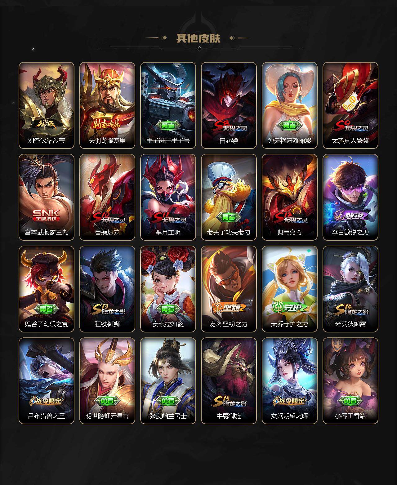 【限定皮肤】:白起狰,姜子牙天穹之誓,狄仁杰阴阳师,赵云皇家上将,赵云龙胆,墨子神迹守卫,嬴政优雅恋人,嬴政白昼王子,孙尚香蔷薇恋人,鲁班七号狮舞东方,芈月重明,芈月白晶晶,吕布猎兽之王,夏侯惇朔风刀,曹操烛龙,典韦穷奇,典韦蓝屏警告,马可波罗暗影游猎,狄仁杰魔术师,狄仁杰万华元夜,达摩星际陆战队,达摩沙漠行僧,项羽海滩派对,老夫子醍醐杖,老夫子航海奇遇记,程咬金演武夺筹,露娜一生所爱,韩信飞衡,兰陵王金庭之子,孙悟空大圣娶亲,牛魔御旌,李元芳云中旅人,钟馗神迹守卫,钟馗驱傩正仪,杨玉环寅虎心曲,女娲朔望之晖,干将莫邪冰霜恋舞曲,雅典娜单词大作战,雅典娜黎明之约,太乙真人饕餮,鬼谷子原初探秘者,鬼谷子五谷丰年,诸葛亮时雨天司,苏烈千军破阵,百里玄策原初追逐者,百里守约朱雀志,弈星混沌棋,公孙离祈雪灵祝,沈梦溪大漠名商,明世隐疑决卦,裴擒虎李小龙,裴擒虎擒涛扼浪,狂铁御狮,米莱狄御霄,米莱狄胡桃异想国,云中君纤云弄巧,伽罗天狼溯光者,盾山御銮,猪八戒西部大镖客,上官婉儿梁祝,嫦娥如梦令,嫦娥拒霜思,蒙犽狂想玩偶喵,鲁班大师探海日志,桑启海盐诗旅,鬼谷子天穹祈灯,刘邦剑破天穹,程咬金群星魔术团,周瑜熔金海岸