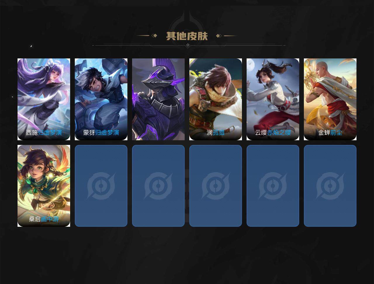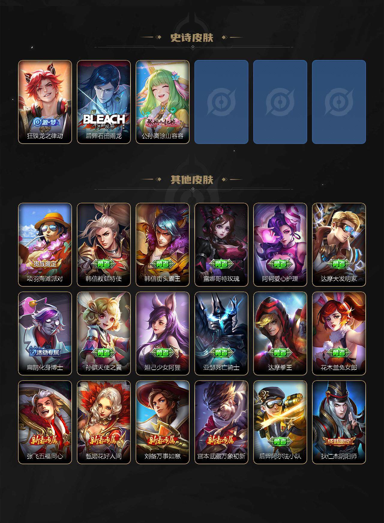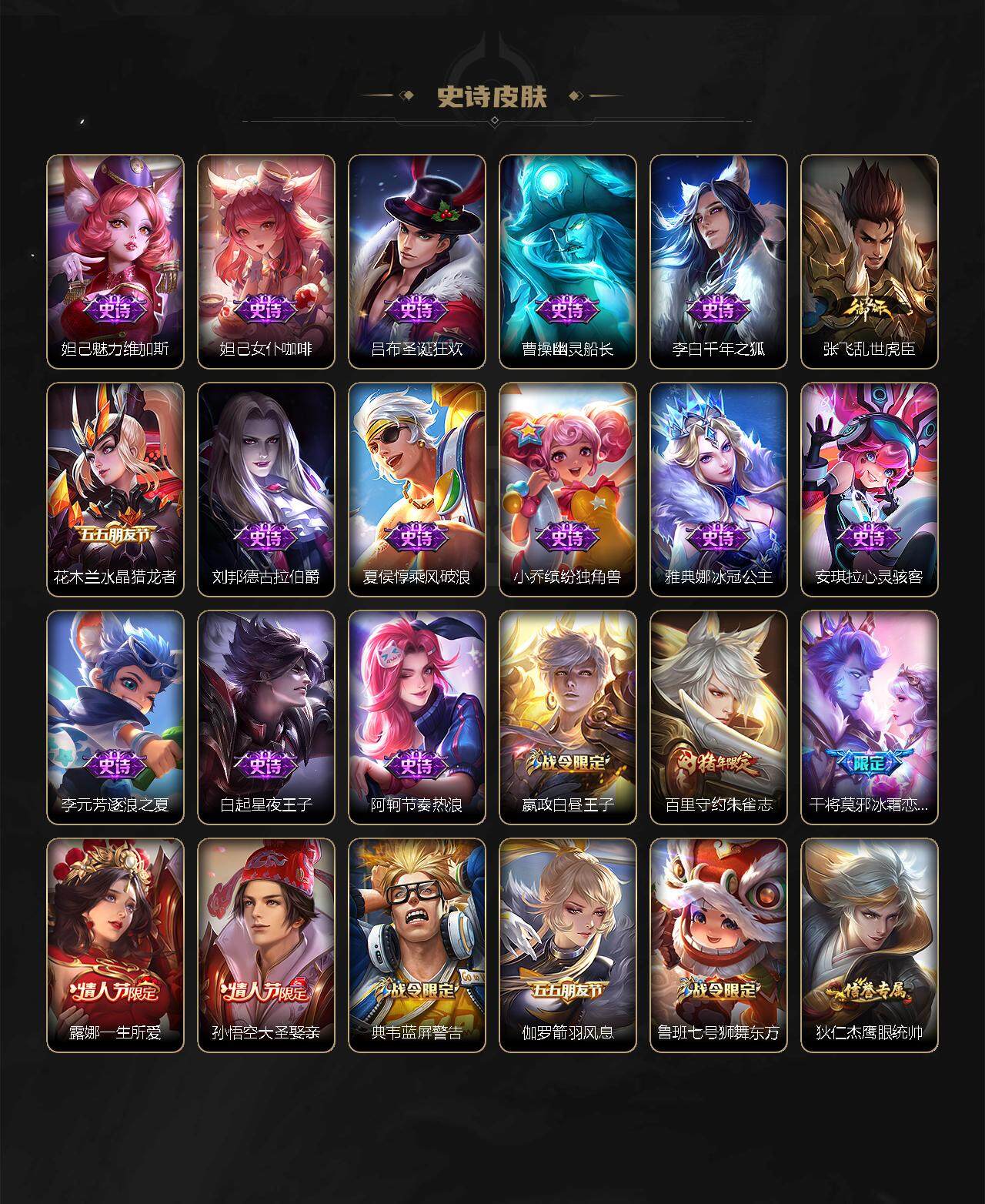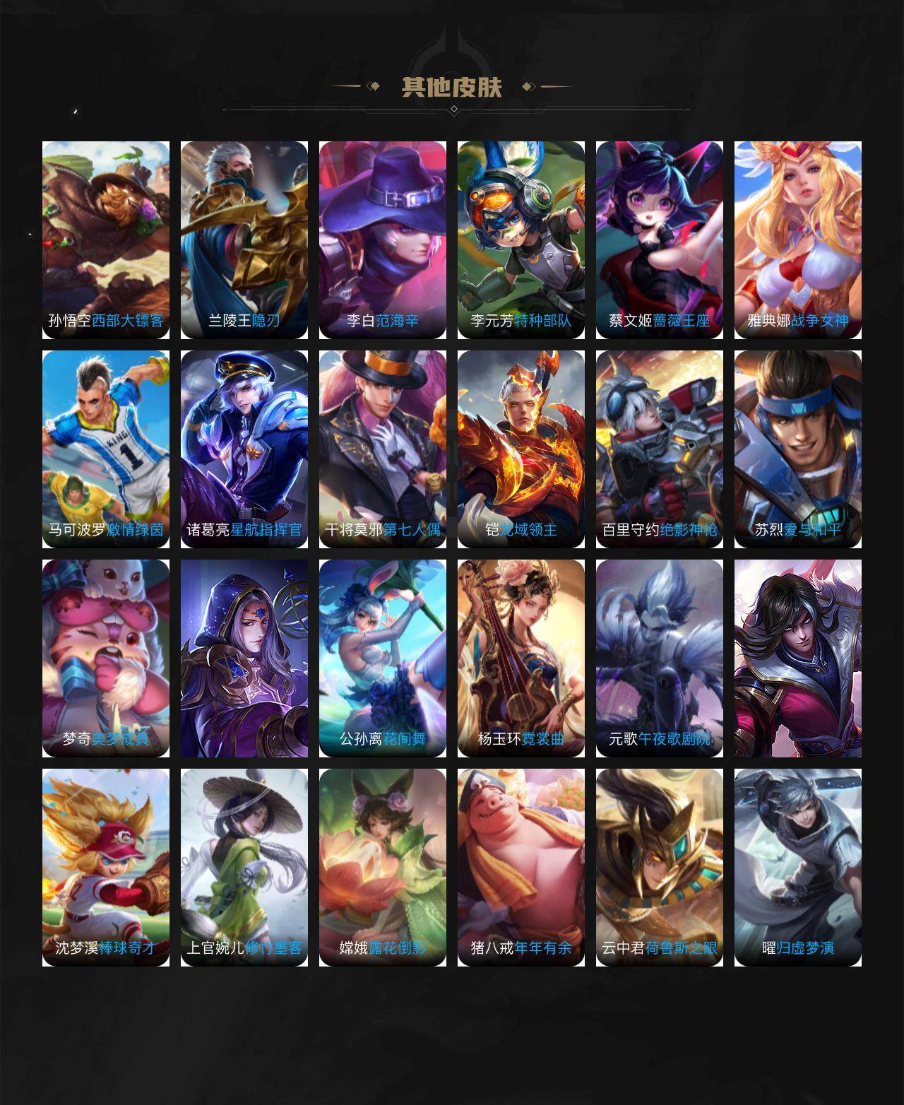 【限定皮肤】:白起狰,姜子牙天穹之誓,狄仁杰阴阳师,赵云皇家上将,赵云龙胆,墨子神迹守卫,嬴政优雅恋人,嬴政白昼王子,孙尚香蔷薇恋人,鲁班七号狮舞东方,芈月重明,芈月白晶晶,吕布猎兽之王,夏侯惇朔风刀,曹操烛龙,典韦穷奇,典韦蓝屏警告,马可波罗暗影游猎,狄仁杰魔术师,狄仁杰万华元夜,达摩星际陆战队,达摩沙漠行僧,项羽海滩派对,老夫子醍醐杖,老夫子航海奇遇记,程咬金演武夺筹,露娜一生所爱,韩信飞衡,兰陵王金庭之子,孙悟空大圣娶亲,牛魔御旌,李元芳云中旅人,钟馗神迹守卫,钟馗驱傩正仪,杨玉环寅虎心曲,女娲朔望之晖,干将莫邪冰霜恋舞曲,雅典娜单词大作战,雅典娜黎明之约,太乙真人饕餮,鬼谷子原初探秘者,鬼谷子五谷丰年,诸葛亮时雨天司,苏烈千军破阵,百里玄策原初追逐者,百里守约朱雀志,弈星混沌棋,公孙离祈雪灵祝,沈梦溪大漠名商,明世隐疑决卦,裴擒虎李小龙,裴擒虎擒涛扼浪,狂铁御狮,米莱狄御霄,米莱狄胡桃异想国,云中君纤云弄巧,伽罗天狼溯光者,盾山御銮,猪八戒西部大镖客,上官婉儿梁祝,嫦娥如梦令,嫦娥拒霜思,蒙犽狂想玩偶喵,鲁班大师探海日志,桑启海盐诗旅,鬼谷子天穹祈灯,刘邦剑破天穹,程咬金群星魔术团,周瑜熔金海岸
