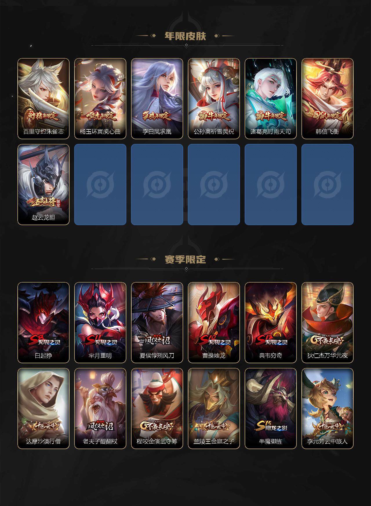 【年限皮肤】:百里守约朱雀志,杨玉环寅虎心曲,李白凤求凰,公孙离祈雪灵祝,诸葛亮时雨天司,韩信飞衡,赵云龙胆